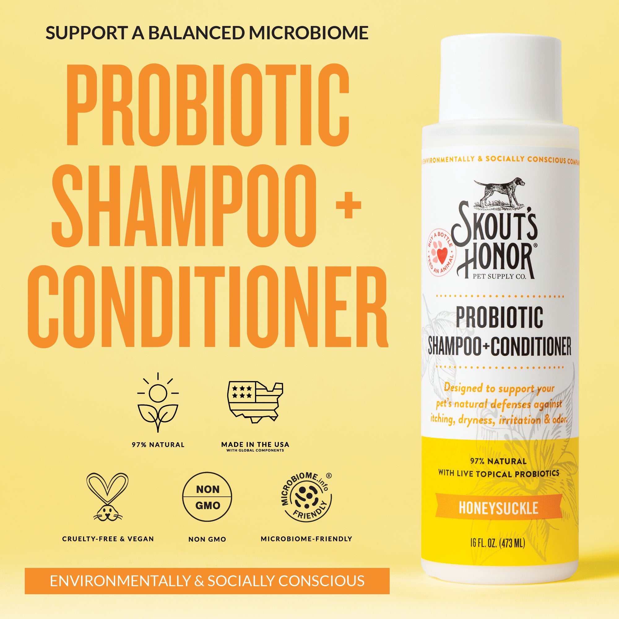 Shop / DOG / Skouts Honor Probiotic Shampoo Plus Conditioner Honeysuckle Skouts Honor Probiotic Shampoo Plus Conditioner Honeysuckle Skout's Honor Default Title $20.99 Default Title Purchase Options Free In-Store Pick Up Not Available Save 20% on orders $100+ Set your store for inventory and store pickup details Zip Code Search Same-day Delivery* No minimum charge for delivery orders. *Order before 2pm and have it delivered today. Orders placed after 2pm will be delivered the next day. Must be inside delivery radius. Zip Code Unfortunately delivery is not available to this address. In order to ensure the best availability accuracy, changing your selected store will remove all items from your cart. You will need to re-add these items with your newly selected store if you choose to continue. Continue Cancel Ship it to Me Quantity Add To Cart Information Designed to support your pet's natural defenses against itching, dryness, irritation and odor. Gently cleans and hydrates the skin and coat, leaving fur silky and smooth. Provides a premium grooming experience without disturbing the skin's natural microbial community and designed to support your pet's natural defenses against itching, dryness, irritation and odor. Customers also liked Customer Reviews
