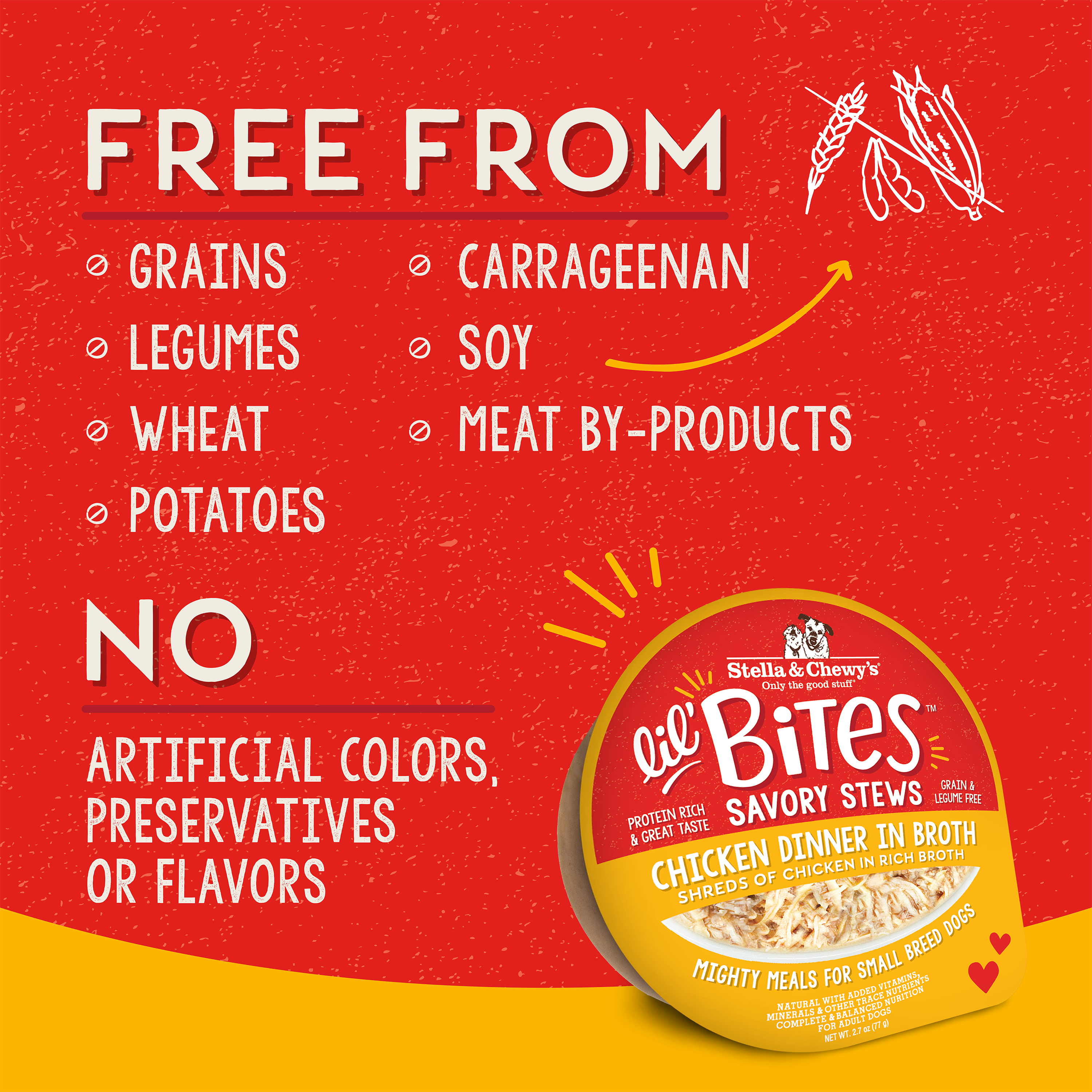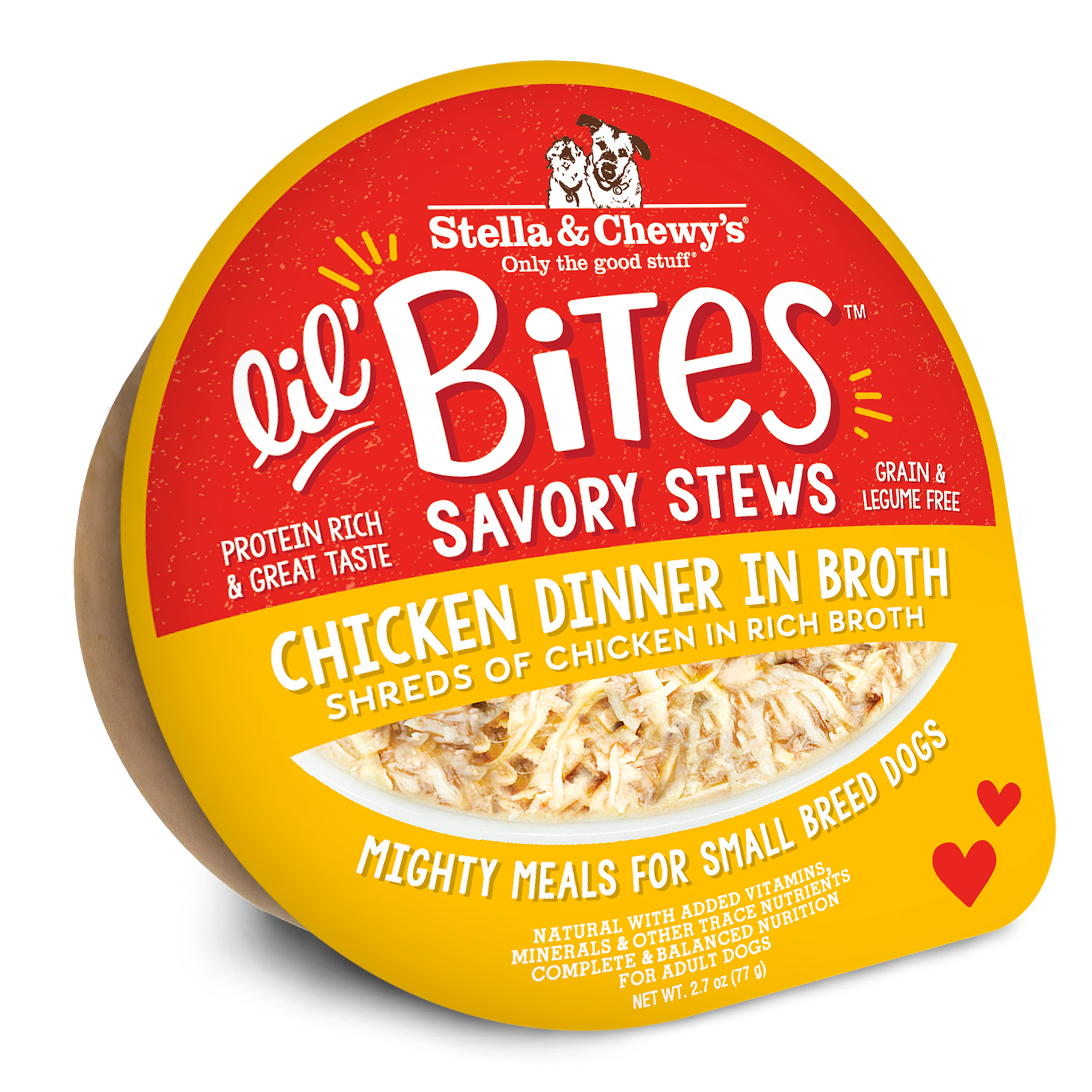 Shop / DOG / Stella & Chewy's Lil Bites Savory Stews Chicken Dinner in Broth for Dogs- 2.7 oz. Cup Stella & Chewy's Lil Bites Savory Stews Chicken Dinner in Broth for Dogs- 2.7 oz. Cup Stella & Chewy's 2.7 oz. $2.99 2.7 oz. Purchase Options Free In-Store Pick Up Not Available Save 10% on orders $49+ Set your store for inventory and store pickup details Zip Code Search Same-day Delivery* No minimum charge for delivery orders. *Order before 2pm and have it delivered today. Orders placed after 2pm will be delivered the next day. Must be inside delivery radius. Zip Code Unfortunately delivery is not available to this address. In order to ensure the best availability accuracy, changing your selected store will remove all items from your cart. You will need to re-add these items with your newly selected store if you choose to continue. Continue Cancel Ship it to Me Quantity Add To Cart Feeding guide disclaimer ✕ Feeding guides provide a starting point for the amount of food to give your pet each day. We recommend that you keep your pet in ideal body condition and not allow them to become overweight. The amount of food your pet needs can vary based on age, activity level or other food and treats given, so be sure to work with your veterinarian to determine an appropriate weight for your pet, and to make any necessary adjustments to their feeding. Information Big-time nutrition for your pint-sized pooch! Specifically formulated for small breeds, these protein-rich recipes feature minced and shredded cage-free chicken in a rich and hydrating broth. To ensure your pup thrives from tip to tail, we also add turmeric for anti-inflammatory support, salmon and sunflower oil for skin and coat health, and taurine to support a healthy heart. Lil’ Bites Savory Stews are made without grains, corn, wheat, soy, carrageenan, meat byproducts, and artificial ingredients. Plus, they’re available in single-source animal protein options to help with allergies and food sensitivities common among small breeds. Serve this protein-packed recipe as a complete and balanced meal, or add to your dog’s kibble as a topper for a powerful boost of protein, flavor, and hydration. Ingredients Chicken, chicken broth, tapioca, sunflower oil, tricalcium phosphate, salt, potassium chloride, choline chloride, vitamin E supplement, magnesium sulfate, taurine, turmeric, salmon oil, zinc oxide, reduced iron, sodium selenite, manganese sulfate, vitamin B12 supplement, copper amino acid complex, niacin supplement, calcium pantothenate, thiamine mononitrate, vitamin A supplement, biotin, riboflavin supplement, pyridoxine hydrochloride, potassium iodide, beta-carotene, folic acid Guaranteed Analysis Crude Protein (min) 10.00%, Crude Fat (min) 2.00%, Crude Fiber (max) 2.00%, Moisture 9max) 83.00% Customers also liked Customer Reviews