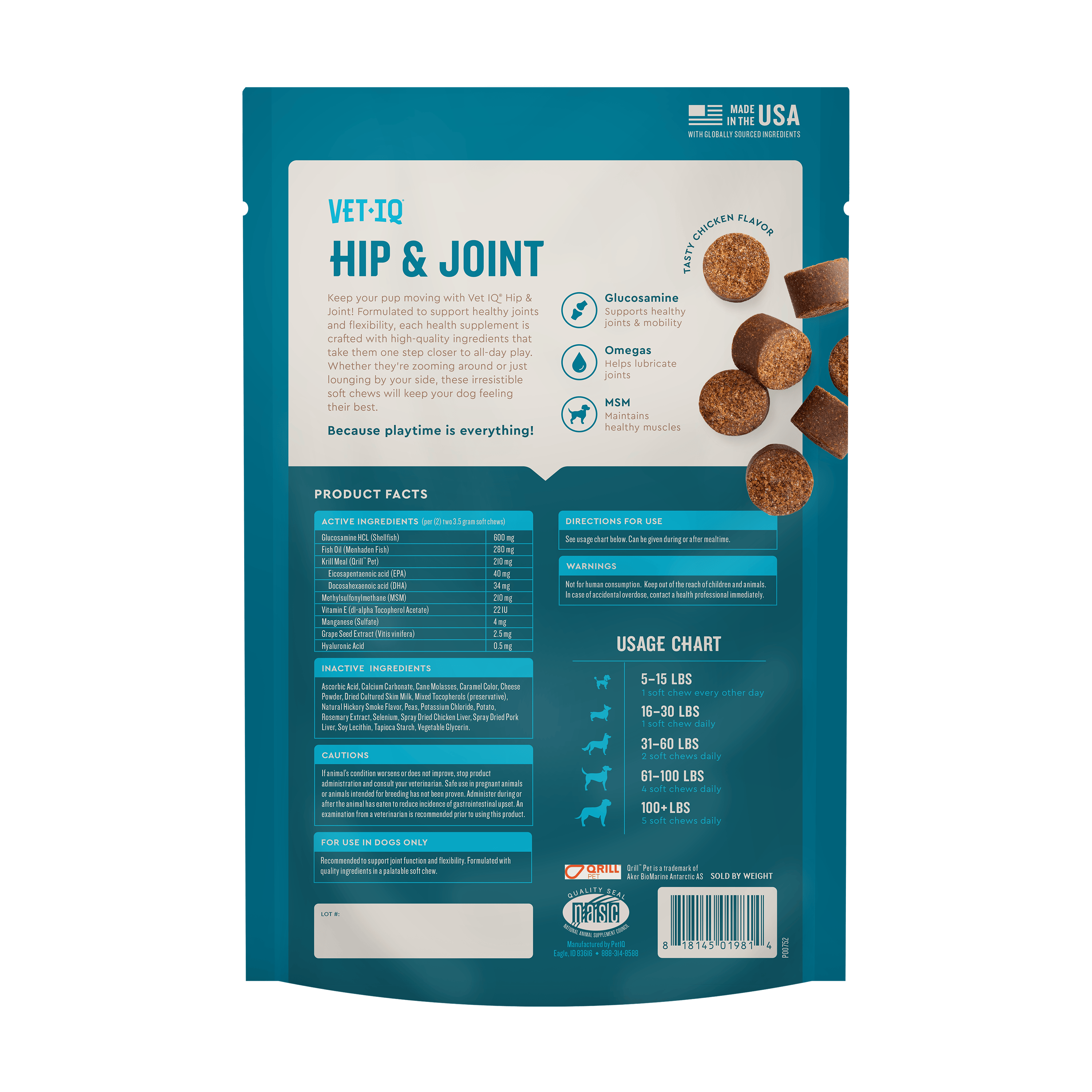 Shop / DOG / VetIQ Hip & Joint Chews for Dogs, Chicken Flavor, 60 Count VetIQ Hip & Joint Chews for Dogs, Chicken Flavor, 60 Count Vet IQ 60ct $11.99 60ct Purchase Options Free In-Store Pick Up Not Available Save 20% on orders $100+ Set your store for inventory and store pickup details Zip Code Search Same-day Delivery* No minimum charge for delivery orders. *Order before 2pm and have it delivered today. Orders placed after 2pm will be delivered the next day. Must be inside delivery radius. Zip Code Unfortunately delivery is not available to this address. In order to ensure the best availability accuracy, changing your selected store will remove all items from your cart. You will need to re-add these items with your newly selected store if you choose to continue. Continue Cancel Ship it to Me Quantity Add To Cart Feeding guide disclaimer ✕ Feeding guides provide a starting point for the amount of food to give your pet each day. We recommend that you keep your pet in ideal body condition and not allow them to become overweight. The amount of food your pet needs can vary based on age, activity level or other food and treats given, so be sure to work with your veterinarian to determine an appropriate weight for your pet, and to make any necessary adjustments to their feeding. Information Dogs are always a hop, skip, and jump ahead of their pet parents. With all that moving around, your dog needs a health supplement that can help them continue to do all the things they love to do – playing with you. VetIQ® Hip & Joint Supplement for Dogs supports your dog’s hips & joints in a tasty chicken-flavored soft chew to keep them moving with you for your next adventure. VetIQ® Hip & Joint is a veterinarian-recommended health supplement that is made with Glucosamine, Omega-3’s, and MSM to help support cartilage, lubricate joints, and maintain muscle composure. The VetIQ® Hip & Joint Supplement for Dogs promotes normal movement functions, so they can continue to run, play, & fetch alongside you. VetIQ® is proudly committed to providing pet parents with access to high-quality products that support your dog's needs, all at savings to you. We offer a full line of health and wellness products to help keep your dog healthy, active, and happy for all life’s adventures. Customers also liked Customer Reviews