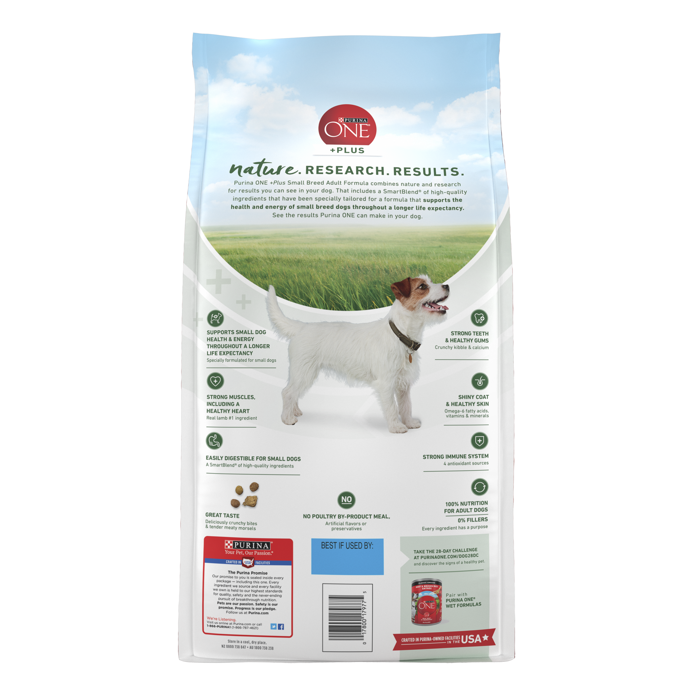 Shop / Dry Dog Food / Purina ONE Plus Small Breed Lamb and Rice Formula Dry Dog Food Purina ONE Plus Small Breed Lamb and Rice Formula Dry Dog Food Purina ONE 7.4lb $16.99 7.4lb Purchase Options Free In-Store Pick Up Not Available Save 20% on orders $100+ Set your store for inventory and store pickup details Zip Code Search Same-day Delivery* No minimum charge for delivery orders. *Order before 2pm and have it delivered today. Orders placed after 2pm will be delivered the next day. Must be inside delivery radius. Zip Code Unfortunately delivery is not available to this address. In order to ensure the best availability accuracy, changing your selected store will remove all items from your cart. You will need to re-add these items with your newly selected store if you choose to continue. Continue Cancel Ship it to Me Quantity Add To Cart Feeding guide disclaimer ✕ Feeding guides provide a starting point for the amount of food to give your pet each day. We recommend that you keep your pet in ideal body condition and not allow them to become overweight. The amount of food your pet needs can vary based on age, activity level or other food and treats given, so be sure to work with your veterinarian to determine an appropriate weight for your pet, and to make any necessary adjustments to their feeding. Information Provide your small dog with the right adult dog food nutrition with Purina ONE Plus Small Breed Dog Food Lamb and Rice Formula Natural With Added Vitamins, Minerals and Nutrients adult dry dog food. Real lamb is the first ingredient in this adult dog food with no fillers artificial flavors or preservatives, so every high-quality ingredient has a purpose. Formulated to support small dogs' health and energy, this dog kibble offers a nutrient-dense formula with four antioxidant sources to provide immune support for dogs. Omega-6 fatty acids, vitamins and minerals in this dry dog food for small dogs support healthy skin and a shiny coat. Every serving of this high protein dog food includes 100 percent complete and balanced nutrition for adult dogs and supports strong muscles, including his healthy heart. Crunchy kibble and tender meaty morsels combine in this Purina ONE dog food lamb and rice formula to keep him coming back to his bowl for this veterinarian-recommended brand. Ingredients Lamb, Chicken Meal, Rice, Corn Protein Meal, Whole Grain Corn, Soybean Meal, Whole Grain Wheat, Beef Fat Preserved With Mixed-Tocopherols, Oat Meal, Glycerin, Natural Flavor, Calcium Carbonate, Soybean Oil, Salt, Mono And Dicalcium Phosphate, Potassium Chloride, Vegetable Juice (Color), Dried Carrots, Dried Peas, VITAMINS [Vitamin E Supplement, Niacin (Vitamin B-3), Thiamine Mononitrate (Vitamin B-1), Calcium Pantothenate (Vitamin B-5), Vitamin A Supplement, Riboflavin Supplement (Vitamin B-2), Vitamin B-12 Supplement, Pyridoxine Hydrochloride (Vitamin B-6), Folic Acid (Vitamin B-9), Menadione Sodium Bisulfite Complex (Vitamin K), Biotin (Vitamin B-7), Vitamin D-3 Supplement], Choline Chloride, Taurine, MINERALS [Zinc Sulfate, Ferrous Sulfate, Manganese Sulfate, Copper Sulfate, Calcium Iodate, Sodium Selenite], L-Lysine Monohydrochloride. E416524 Guaranteed Analysis Crude Protein (Min)...28.0%, Crude Fat (Min)...17.0%, Crude Fiber (Max)...3.0%, Moisture (Max)...12.0%, Linoleic Acid (Min)...1.5%, Calcium (Ca) (Min)...1.0%, Phosphorus (P) (Min)...0.8%, Zinc (Zn) (Min)...150 mg/kg, Selenium (Se) (Min)...0.4 mg/kg, Vitamin A (Min)...15,000 IU/kg, Vitamin E (Min)...400 IU/kg, Glucosamine* (Min)...400 ppm *Not recognized as an essential nutrient by the AAFCO Dog Food Nutrient Profiles. Customers also liked Customer Reviews