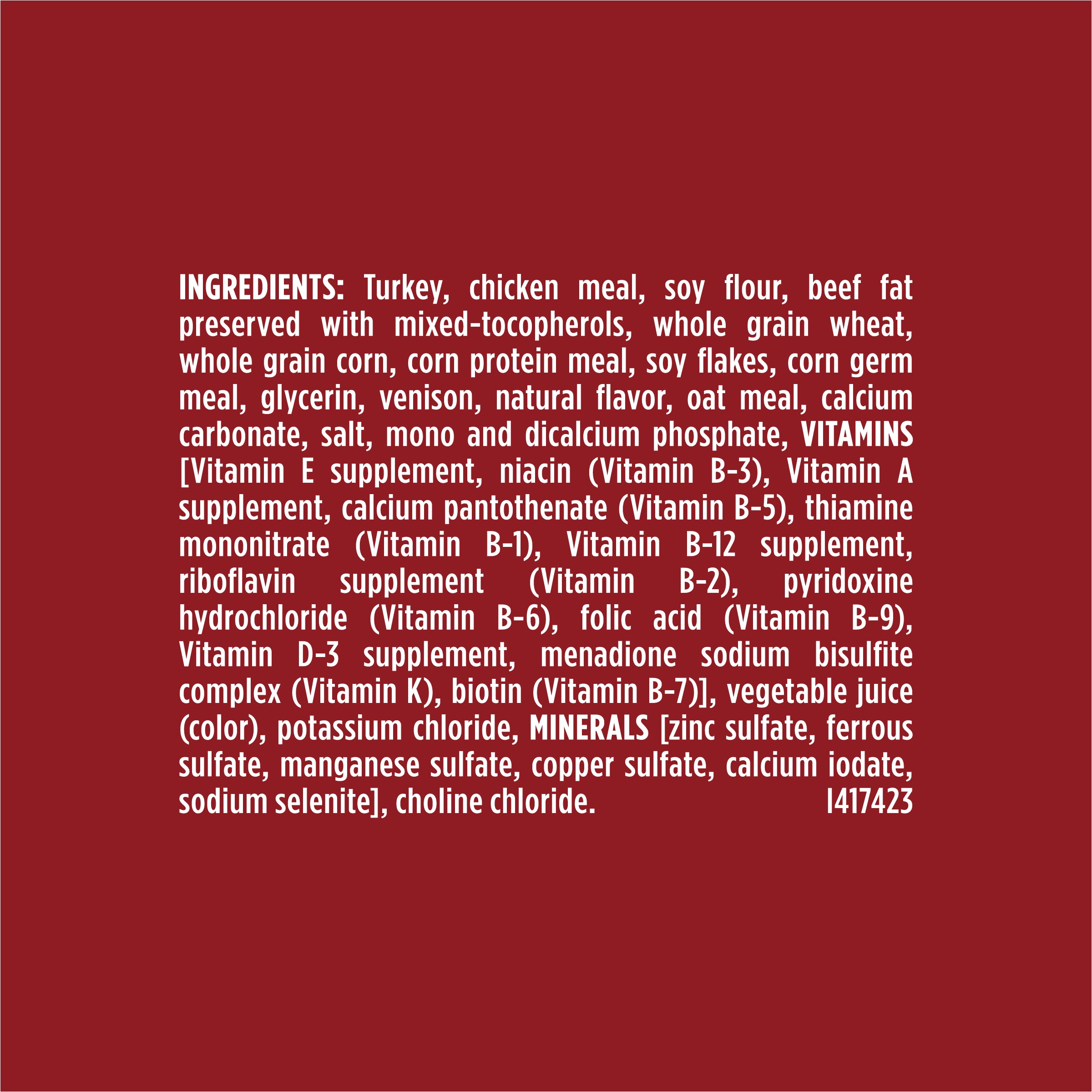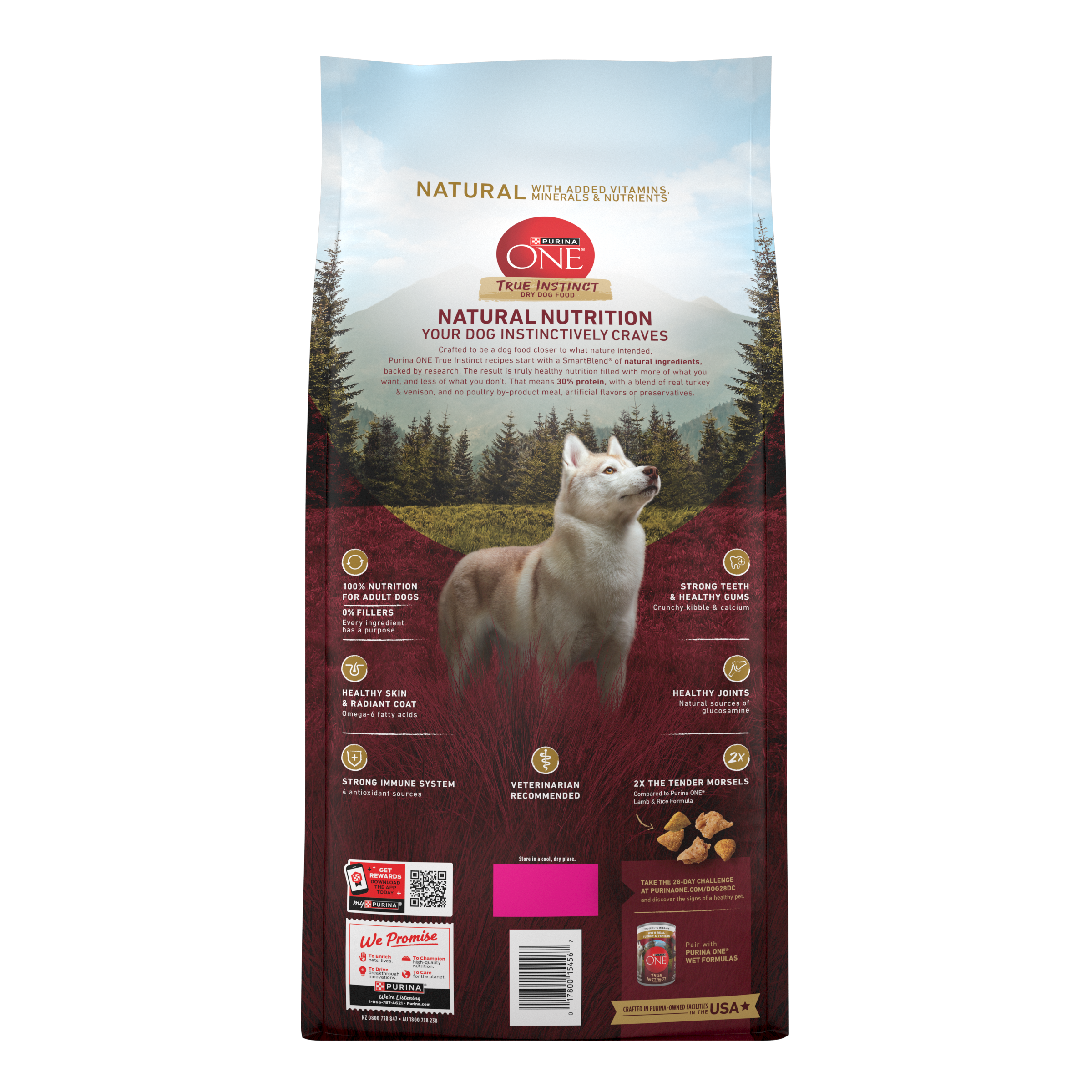 Shop / Dry Dog Food / Purina ONE True Instinct With A Blend Of Real Turkey and Venison Dry Dog Food Purina ONE True Instinct With A Blend Of Real Turkey and Venison Dry Dog Food Purina ONE 7.4lb $16.99 7.4lb Purchase Options Free In-Store Pick Up Not Available Save 20% on orders $100+ Set your store for inventory and store pickup details Zip Code Search Same-day Delivery* No minimum charge for delivery orders. *Order before 2pm and have it delivered today. Orders placed after 2pm will be delivered the next day. Must be inside delivery radius. Zip Code Unfortunately delivery is not available to this address. In order to ensure the best availability accuracy, changing your selected store will remove all items from your cart. You will need to re-add these items with your newly selected store if you choose to continue. Continue Cancel Ship it to Me Quantity Add To Cart Feeding guide disclaimer ✕ Feeding guides provide a starting point for the amount of food to give your pet each day. We recommend that you keep your pet in ideal body condition and not allow them to become overweight. The amount of food your pet needs can vary based on age, activity level or other food and treats given, so be sure to work with your veterinarian to determine an appropriate weight for your pet, and to make any necessary adjustments to their feeding. Information Feed your dog the nutrition he craves with Purina ONE True Instinct With A Blend Of Real Turkey and Venison dry adult Formula Natural Dog Food with Added Vitamins, Minerals and Nutrients. With 100 percent nutrition for adult dogs and 0 percent fillers, every ingredient in this wholesome recipe has a purpose. This high protein dog food features real turkey as the number 1 ingredient, includes real venison, and delivers 30 percent protein to help support your dog’s strong muscles, including a healthy heart. This recipe is also crafted with no artificial flavors or preservatives to meet your high standards. Along with a highly digestible formula that lets more nutrition go to work, this nutrient-dense recipe features natural sources of glucosamine for dogs to support dog joint health. With nutrition backed by research and crafted by a veterinarian-recommended brand, Purina ONE True Instinct dog food turkey and venison lets you feed your dog the way nature intended. Ingredients Turkey, Chicken Meal, Soy Flour, Beef Fat Preserved With Mixed-Tocopherols, Whole Grain Wheat, Whole Grain Corn, Corn Protein Meal, Soy Flakes, Corn Germ Meal, Glycerin, Venison, Natural Flavor, Oat Meal, Calcium Carbonate, Salt, Mono And Dicalcium Phosphate, VITAMINS [Vitamin E Supplement, Niacin (Vitamin B-3), Vitamin A Supplement, Calcium Pantothenate (Vitamin B-5), Thiamine Mononitrate (Vitamin B-1), Vitamin B-12 Supplement, Riboflavin Supplement (Vitamin B-2), Pyridoxine Hydrochloride (Vitamin B-6), Folic Acid (Vitamin B-9), Vitamin D-3 Supplement, Menadione Sodium Bisulfite Complex (Vitamin K), Biotin (Vitamin B-7)], Vegetable Juice (Color), Potassium Chloride, MINERALS [Zinc Sulfate, Ferrous Sulfate, Manganese Sulfate, Copper Sulfate, Calcium Iodate, Sodium Selenite], Choline Chloride. I417423 Guaranteed Analysis Crude Protein (min)…30.0%, Crude Fat (min)…17.0%, Crude Fiber (max)…3.0%, Moisture (max)…12.0%, Linoleic Acid (min)… 1.6%, Calcium (Ca) (min)… 1.0%, Phosphorus (P)(min)… 0.8%, Zinc (Zn)(min)… 150 mg/kg, Selenium (Se) (min)… 0.35 mg/kg, Vitamin A (min)… 15000 IU/kg, Vitamin E (min)… 460IU/kg, Glucosamine (min)*… 350 mg/kg, Omega-6 fatty acid (min)*… 1.70%. *Not recognized as an essential nutrient by the AAFCO Dog Food Nutrient Profiles. Customers also liked Customer Reviews