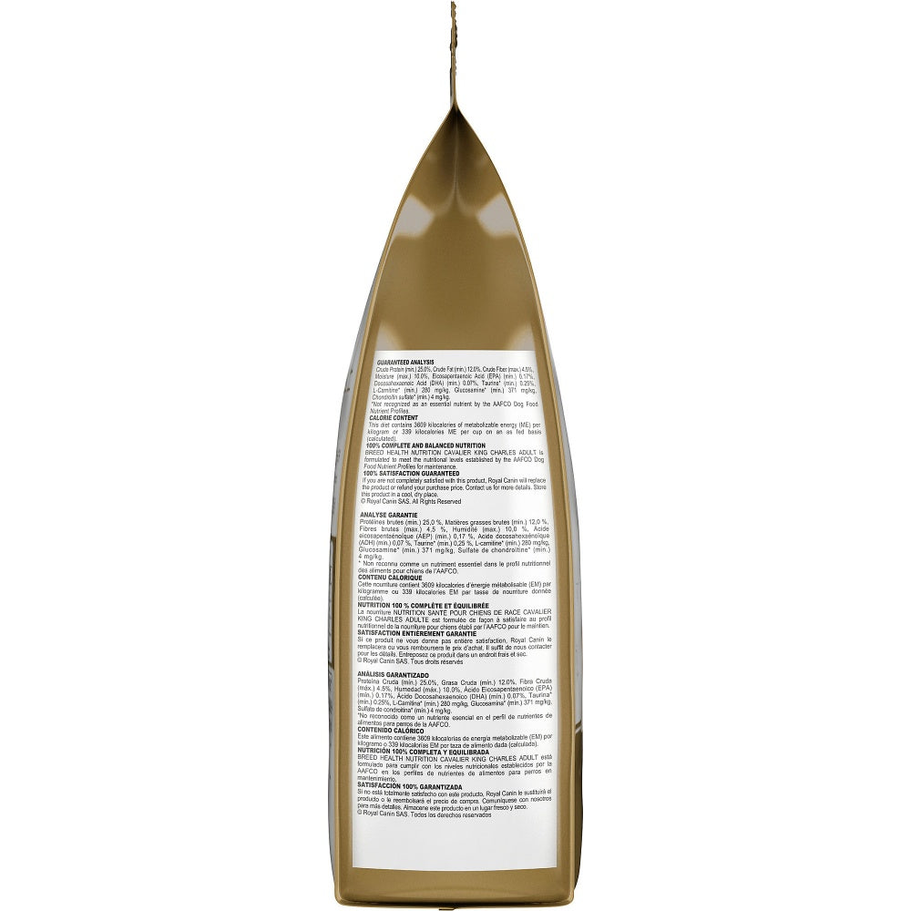 Shop / Dry Dog Food / Royal Canin Adult Cavalier King Charles Spaniel Dry Dog Food Royal Canin Adult Cavalier King Charles Spaniel Dry Dog Food Royal Canin Weight: 10 lb $61.99 10-lb Purchase Options Free In-Store Pick Up Not Available Save 10% on orders $49+ Set your store for inventory and store pickup details Zip Code Search Same-day Delivery* No minimum charge for delivery orders. *Order before 2pm and have it delivered today. Orders placed after 2pm will be delivered the next day. Must be inside delivery radius. Zip Code Unfortunately delivery is not available to this address. In order to ensure the best availability accuracy, changing your selected store will remove all items from your cart. You will need to re-add these items with your newly selected store if you choose to continue. Continue Cancel Ship it to Me Quantity Add To Cart Feeding guide disclaimer ✕ Feeding guides provide a starting point for the amount of food to give your pet each day. We recommend that you keep your pet in ideal body condition and not allow them to become overweight. The amount of food your pet needs can vary based on age, activity level or other food and treats given, so be sure to work with your veterinarian to determine an appropriate weight for your pet, and to make any necessary adjustments to their feeding. Information Royal Canin knows what makes your Cavalier King Charles Spaniel magnificent is in the details. With their expressive eyes and feathered, wavy coat, Cavaliers are intelligent lapdogs fit for a king. These sweet family companions can benefit from the right diet to promote their cardiac health, maintain an ideal weight, and provide precise nutrients for a gorgeous, healthy coat. Royal Canin Cavalier King Charles Spaniel Adult dry dog food is tailor-made nutrition created just for your purebred Cavalier. Whether you have a Tricolor, Black & Tan, Ruby, or Blenheim Spaniel, this exclusive breed-specific diet is uniquely formulated for your Cavalier King Charles Spaniel, with the specific nutrients to help them thrive. The custom kibble is designed for your Cavie’s tapered muzzle and scissor bite, making it easy for them to pick up and chew. An appropriate calorie content promotes a healthy weight, while targeted nutrients help maintain your Cavalier's cardiac function. And vitamin A, as well as EPA and DHA from fish oil, helps nourish healthy skin and coat. With nearly 50 years of scientific research and observation, Royal Canin continues to deliver targeted nutrition to feed every pet’s magnificence. Not satisfied? Then neither are we. Our breed health formulas are 100% satisfaction guaranteed. (Just contact us for more details. Royal Canin Cavalier King Charles Spaniel Adult dry dog food is designed to meet the nutritional needs of purebred Cavaliers 10 months and older Exclusive kibble shape helps Cavalier King Charles Spaniels easily pick up and chew their food Promotes heart health with taurine, EPA and DHA from fish oil, and L-carnitine for healthy cardiac function Helps maintain an ideal weight with a balanced formula Supports coat health with EPA and DHA from fish oil to help keep a Cavalier’s coat silky and beautiful Ingredients Brewers rice, wheat gluten, chicken by-product meal, corn, chicken fat, wheat, natural flavors, dried plain beet pulp, fish oil, pea fiber, dried tomato pomace, vegetable oil, rice hulls, calcium carbonate, sodium silico aluminate, L-lysine, potassium chloride, vitamins [DL-alpha tocopherol acetate (source of vitamin E), niacin supplement, L-ascorbyl-2-polyphosphate (source of vitamin C), D-calcium pantothenate, biotin, pyridoxine hydrochloride (vitamin B6), riboflavin supplement, thiamine mononitrate (vitamin B1), vitamin A acetate, folic acid, vitamin B12 supplement, vitamin D3 supplement], fructooligosaccharides, sodium tripolyphosphate, DL-methionine, L-arginine, taurine, potassium citrate, hydrolyzed yeast, choline chloride, salt, marigold extract (Tagetes erecta L.), L-tyrosine, trace minerals [zinc oxide, ferrous sulfate, zinc proteinate, manganous oxide, manganese proteinate, copper sulfate, calcium iodate, sodium selenite, copper proteinate], glucosamine hydrochloride, L-carnitine, magnesium oxide, green tea extract, chondroitin sulfate, rosemary extract, preserved with mixed tocopherols and citric acid. Guaranteed Analysis Nutrient Guaranteed Units Crude Protein 25% min Crude Fat 12% min Crude Fiber 4.5% max Moisture 10% max EPA 0.17% min DHA 0.07% min Taurine 0.25% min L-Carnitine 280 mg/kg min Glucosamine 371 mg/kg min Chondroitin Sulfate 4 mg/kg min Customers also liked Customer Reviews