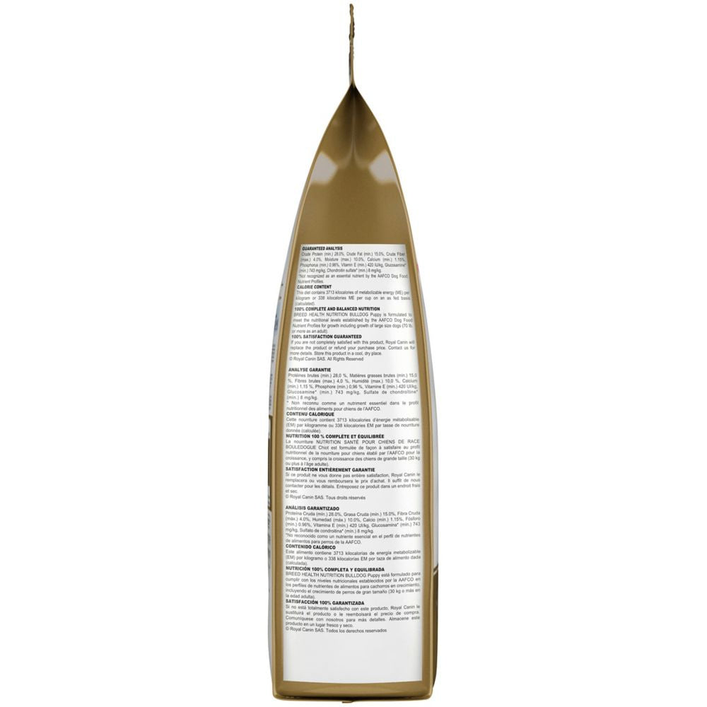 Shop / Dry Dog Food / Royal Canin Breed Health Nutrition Bulldog Puppy Dry Dog Food Royal Canin Breed Health Nutrition Bulldog Puppy Dry Dog Food Royal Canin Weight: 6 lb $37.99 6-lb Purchase Options Free In-Store Pick Up Not Available Save 10% on orders $49+ Set your store for inventory and store pickup details Zip Code Search Same-day Delivery* No minimum charge for delivery orders. *Order before 2pm and have it delivered today. Orders placed after 2pm will be delivered the next day. Must be inside delivery radius. Zip Code Unfortunately delivery is not available to this address. In order to ensure the best availability accuracy, changing your selected store will remove all items from your cart. You will need to re-add these items with your newly selected store if you choose to continue. Continue Cancel Ship it to Me Quantity Add To Cart Feeding guide disclaimer ✕ Feeding guides provide a starting point for the amount of food to give your pet each day. We recommend that you keep your pet in ideal body condition and not allow them to become overweight. The amount of food your pet needs can vary based on age, activity level or other food and treats given, so be sure to work with your veterinarian to determine an appropriate weight for your pet, and to make any necessary adjustments to their feeding. Information Royal Canin knows what makes your Bulldog puppy magnificent is in the details. With their funny, squishy faces, wrinkled skin, and short, stocky bodies, Bulldog puppies bring a lot of loveand smellsto your home. They can benefit from the right growth formula to provide immune system support, bone and joint health, and digestive care as they take on puppyhood. Royal Canin Bulldog dry puppy food is tailor-made nutrition created just for your pure breed Bulldog puppy. Whether you call yours an English Bulldog or British Bulldog, this exclusive breed-specific diet is uniquely formulated for your Bulldog puppy with specific nutrients to help them thrive. The unique wave-shaped kibble is specially designed for your Bulldog's unique jaw, making it easy for them to pick up and chew. An exclusive mix of antioxidants and vitamin E supports their developing immune systems and keeps their body growing strong. High-quality proteins and prebiotics help promote optimal stool quality. And for healthy growth, this calcium- and phosphorus-fortified diet helps your Bulldog pup develop strong bones and healthy joints. Once your Bulldog puppy is over 15 months old, transition them to Royal Canin Bulldog Adult dog food for precise nutrition into the adult years. Ingredients Chicken by-product meal, brewers rice, brown rice, chicken fat, wheat gluten, oat groats, pork meal, natural flavors, dried plain beet pulp, pea fiber, fish oil, vegetable oil, sodium silico aluminate, potassium chloride, monocalcium phosphate, calcium carbonate, fructooligosaccharides, sodium tripolyphosphate, vitamins [DL-alpha tocopherol acetate (source of vitamin E), niacin supplement, L-ascorbyl-2-polyphosphate (source of vitamin C), D-calcium pantothenate, biotin, pyridoxine hydrochloride (vitamin B6), riboflavin supplement, thiamine mononitrate (vitamin B1), vitamin A acetate, folic acid, vitamin B12 supplement, vitamin D3 supplement], hydrolyzed yeast (source of betaglucans), salt, DL-methionine, choline chloride, glucosamine hydrochloride, marigold extract (Tagetes erecta L.), trace minerals [zinc proteinate, zinc oxide, manganese proteinate, ferrous sulfate, manganous oxide, copper sulfate, calcium iodate, sodium selenite, copper proteinate], taurine, Yucca schidigera extract, chondroitin sulfate, carotene, rosemary extract, preserved with mixed tocopherols and citric acid. Guaranteed Analysis Nutrient Guaranteed Units Crude Protein 28% min Crude Fat 15% min Crude Fiber 4% max Moisture 10% max Customers also liked Customer Reviews