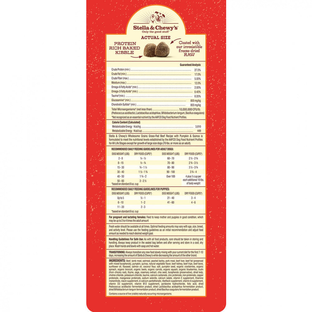 Shop / Dry Dog Food / Stella & Chewy's Raw Coated Kibble With Wholesome Grains Grass Fed Beef Recipe Dry Dog Food Stella & Chewy's Raw Coated Kibble With Wholesome Grains Grass Fed Beef Recipe Dry Dog Food Stella & Chewy's Weight: 22 lb $82.99 22-lb Purchase Options Free In-Store Pick Up Not Available Save 10% on orders $49+ Set your store for inventory and store pickup details Zip Code Search Same-day Delivery* No minimum charge for delivery orders. *Order before 2pm and have it delivered today. Orders placed after 2pm will be delivered the next day. Must be inside delivery radius. Zip Code Unfortunately delivery is not available to this address. In order to ensure the best availability accuracy, changing your selected store will remove all items from your cart. You will need to re-add these items with your newly selected store if you choose to continue. Continue Cancel Ship it to Me Quantity Add To Cart Feeding guide disclaimer ✕ Feeding guides provide a starting point for the amount of food to give your pet each day. We recommend that you keep your pet in ideal body condition and not allow them to become overweight. The amount of food your pet needs can vary based on age, activity level or other food and treats given, so be sure to work with your veterinarian to determine an appropriate weight for your pet, and to make any necessary adjustments to their feeding. Information Best-in-class solutions for those pet parents looking for high protein and nutrient dense dog kibble options.Why We Love It Protein-rich baked kibble Coated with our irresistible freeze-dried raw #1 ingredient responsibly sourced animal protein Wholesome grains include pearled barley, oatmeal, brown rice and quinoa Legume-free & potato-free About Stella & ChewySince our own Stella and Chewy were introduced to a raw diet and thrived, we have been focused on making the power of raw nutrition more palatable and more convenient for pets and pet parents everywhere. As a company, we do believe raw is the pinnacle of animal nutrition and that any amount of raw in a dog’s diet will have a meaningful and positive impact. We have begun to responsibly expand our brand beyond our raw to make our products more available, yet always delivering best-in-class nutrition that will allow pets to thrive! We are proud to provide a wide line-up of offerings that are unique and special – always using pristine ingredients that are thoughtfully and responsibly sourced which deliver best-in-class nutrition and palatability. Ingredients Beef, lamb meal, oatmeal, pearled barley, pork meal, beef liver, beef fat (preserved with mixed tocopherols), pumpkin, quinoa, natural vegetable flavor, beef kidney, beef tripe, beef bone, sunflower oil, flaxseed, salmon oil, coconut flour, salt, pumpkin seed, organic cranberries, organic spinach, organic beets, organic carrots, organic squash, organic blueberries, inulin (from chicory root), thyme, sage, rosemary extract, tocopherols (preservative), dried kelp, choline chloride, potassium chloride, taurine, calcium carbonate, zinc proteinate, iron proteinate, copper proteinate, manganese proteinate, sodium selenite, calcium iodate, vitamin E supplement, thiamine mononitrate, niacin supplement, d-calcium pantothenate, riboflavin supplement, vitamin A supplement, vitamin D3 supplement, vitamin B12 supplement, pyridoxine hydrochloride, folic acid, dried Pediococcus acidilactici fermentation product, dried Lactobacillus acidophilus fermentation product, dried Bifidobacterium longum fermentation product, dried Bacillus coagulans fermentation product Guaranteed Analysis Nutrient Guaranteed Units Crude Protein 27% min Crude Fat 17% min Crude Fiber 5% min Moisture 12% max Customers also liked Customer Reviews