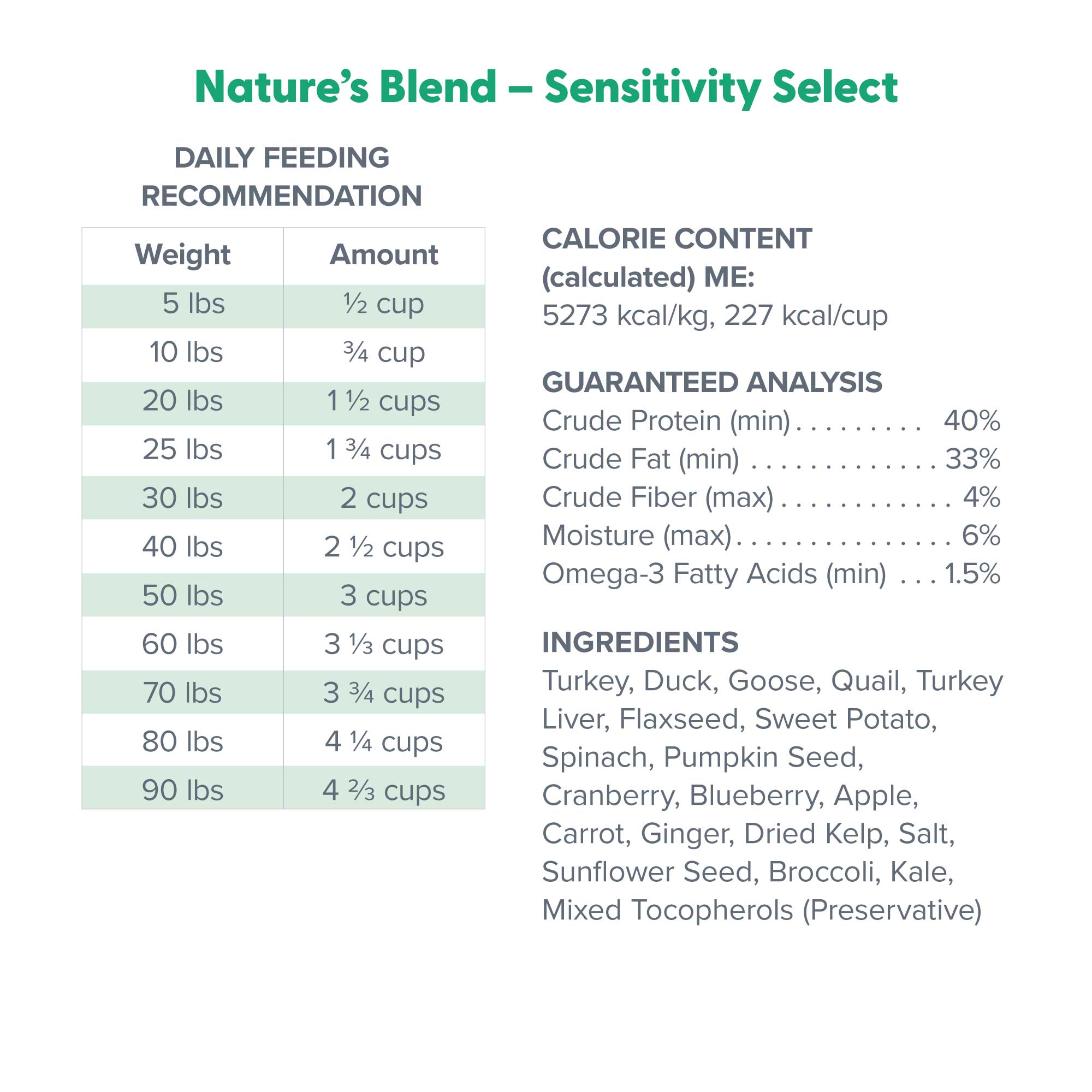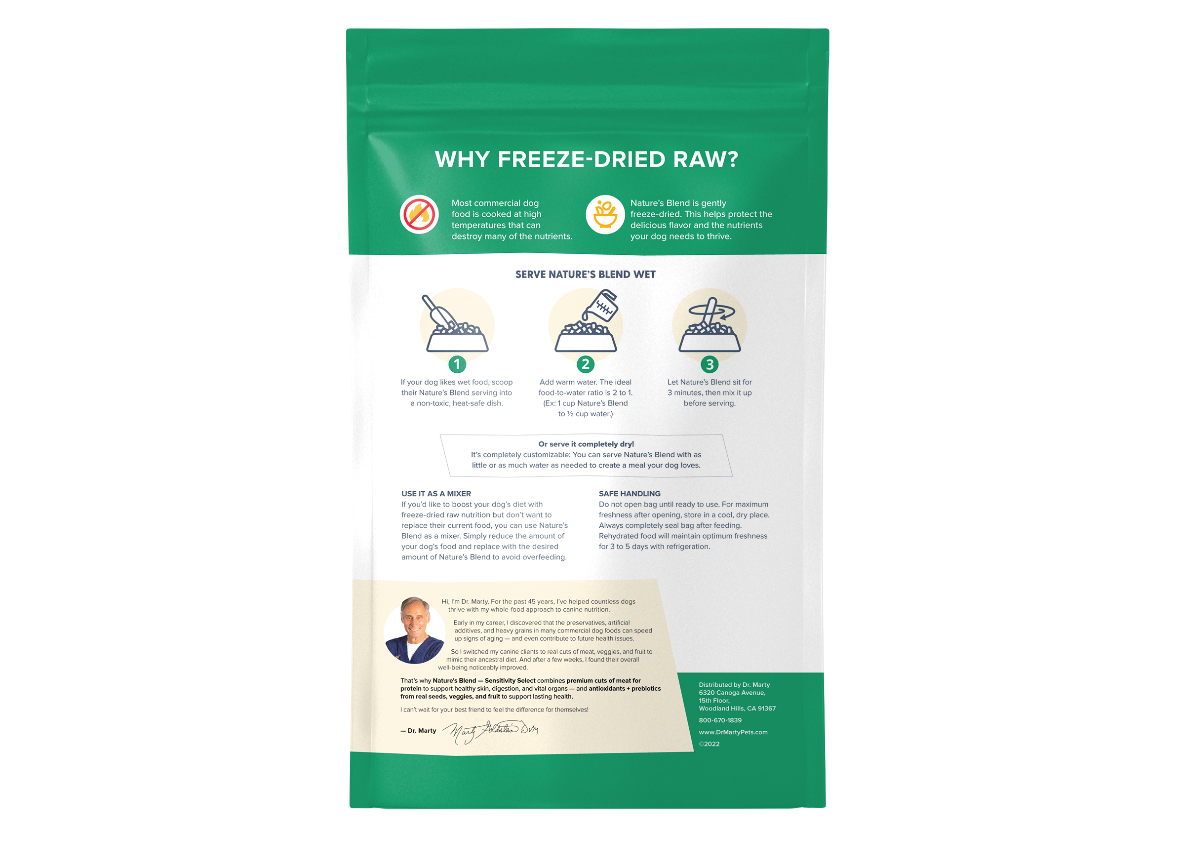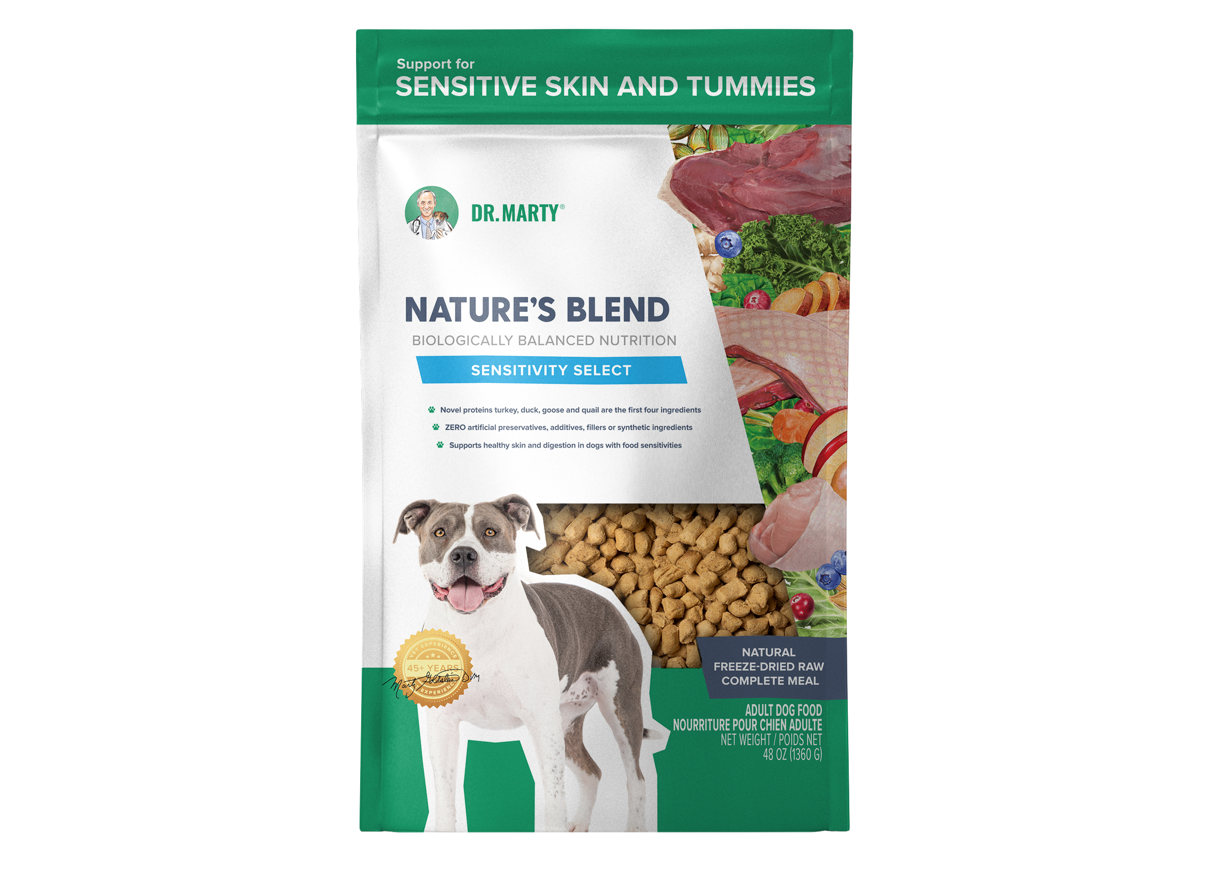 Shop / Freeze Dried Dog Food / Dr. Marty Nature's Blend Sensitivity Select Dog Food Dr. Marty Nature's Blend Sensitivity Select Dog Food Dr. Marty 48oz $92.99 $10 offDiscount will apply in cart 48oz Purchase Options Free In-Store Pick Up Not Available Save 20% on orders $100+ Set your store for inventory and store pickup details Zip Code Search Same-day Delivery* No minimum charge for delivery orders. *Order before 2pm and have it delivered today. Orders placed after 2pm will be delivered the next day. Must be inside delivery radius. Zip Code Unfortunately delivery is not available to this address. In order to ensure the best availability accuracy, changing your selected store will remove all items from your cart. You will need to re-add these items with your newly selected store if you choose to continue. Continue Cancel Ship it to Me Quantity Add To Cart Feeding guide disclaimer ✕ Feeding guides provide a starting point for the amount of food to give your pet each day. We recommend that you keep your pet in ideal body condition and not allow them to become overweight. The amount of food your pet needs can vary based on age, activity level or other food and treats given, so be sure to work with your veterinarian to determine an appropriate weight for your pet, and to make any necessary adjustments to their feeding. Information Dr. Marty Nature's Blend is a premium, freeze-dried raw dog food formulated to support the health, happiness, and longevity of all adult dogs Unlike kibble cooked at high heat, Dr. Marty's freeze dried raw dog food locks in nutrients without harmful AGEs. No fillers, artificial preservatives, or synthetic additives—just pure, complete nutrition in every bite Zero artificial preservatives, additives, fillers or synthetic ingredients Use it as a mixer- If you'd like to boost your dog's diet with freeze-dried raw nutrition but don't want to replace their current food, you can use Nature's Blend as a mixer. Simply reduce the amount of Nature's Blend to avoid overfeeding Dr. Marty's freeze dried raw dog food is made in an FDA-audited, BRC-certified facility using HPP to eliminate pathogens. Each lot is tested for E.coli, Listeria, and Salmonella before release by our Quality Team Ingredients Turkey, Duck, Goose, Quail, Turkey Liver, Flaxseed, Sweet Potato, Spinach, Pumpkin Seed, Cranberry, Blueberry, Apple, Carrot, Ginger, Dried Kelp, Salt, Sunflower Seed, Broccoli, Kale, Mixed Tocopherols (Preservative). Guaranteed Analysis Crude Protein (min) 37%, Crude Fat (min) 27%, Crude Fiber (max) 4%, Moisture (max) 6% Customers also liked Customer Reviews