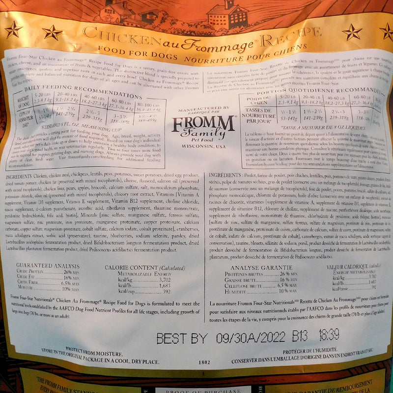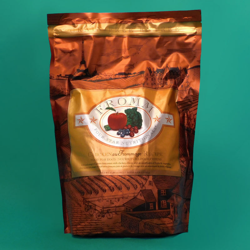 Shop / Fromm / Fromm Four Star Grain Free Chicken au Frommage Dry Dog Food Fromm Four Star Grain Free Chicken au Frommage Dry Dog Food Fromm $15.99 4 lb 12 lb 26 lb 4-lb 12-lb 26-lb Purchase Options Free In-Store Pick Up Not Available Save 10% on orders $49+ Set your store for inventory and store pickup details Zip Code Search Same-day Delivery* No minimum charge for delivery orders. *Order before 2pm and have it delivered today. Orders placed after 2pm will be delivered the next day. Must be inside delivery radius. Zip Code Unfortunately delivery is not available to this address. In order to ensure the best availability accuracy, changing your selected store will remove all items from your cart. You will need to re-add these items with your newly selected store if you choose to continue. Continue Cancel Ship it to Me Quantity Add To Cart Feeding guide disclaimer ✕ Feeding guides provide a starting point for the amount of food to give your pet each day. We recommend that you keep your pet in ideal body condition and not allow them to become overweight. The amount of food your pet needs can vary based on age, activity level or other food and treats given, so be sure to work with your veterinarian to determine an appropriate weight for your pet, and to make any necessary adjustments to their feeding. Information Fromm Four Star Chicken au Frommage® Recipe Food for Dogs is a savory, grain-free entrée with chicken, cheese, and an assortment of fruits & vegetables. This distinctive blend is specially prepared to ensure consistency, quality, and superior taste in each and every bowl. Chicken au Frommage® Recipe provides complete and balanced nutrition for dogs of all ages and can be alternated with other Fromm Four-Star recipes.Why We Love It Fromm Family Foods is a fifth generation family-owned-and-operated artisan pet food company Produced at Fromm's hands-on family-owned-and-operated facility High nutrient digestibility and utilization Third party pathogenic bacteria testing on all production batches Fromm's specially developed blend of probiotics About FrommMaintaining a tradition of quiet innovation dedicated to the health and nutrition of dogs and cats since 1908, Fromm Family Foods is a family-owned and operated artisan dog and cat food company based in Wisconsin. Dedicated to food safety, Fromm ensures that every ingredient is tested and sampled before meeting their Wisconsin manufacturing facilities. With some of the highest inclusion levels of fresh meats, fish, fruits, vegetables, and real Wisconsin cheese, Fromm offers a holistic recipe for all types and tastes of dogs and cats, including grain-free, limited ingredient, puppy, and everything in between. Ingredients Chicken, Chicken Meal, Chickpeas, Lentils, Peas, Potatoes, Sweet Potatoes, Dried Egg Product, Dried Tomato Pomace, Chicken Fat (preserved with mixed tocopherols),Cheese, Flaxseed, Salmon Oil (preserved with mixed tocopherols),Chicken Liver, Pears, Apples, Broccoli, Potassium Chloride, Salt, Calcium Sulfate, Monocalcium Phosphate, Vitamins [Choline Chloride, Vitamin E Supplement, Ascorbic Acid, Calcium Carbonate, Riboflavin Supplement, Niacin Supplement, Calcium Pantothenate, Vitamin A Supplement, Vitamin D3 Supplement, Pyridoxine Hydrochloride, Biotin, Vitamin B12 Supplement, Thiamine Mononitrate, Folic Acid],Olive Oil (preserved with mixed tocopherols),Chicory Root Extract, Minerals [Zinc Sulfate, Manganese Sulfate, Ferrous Sulfate, Magnesium Sulfate, Zinc Proteinate, Ferrous Proteinate, Manganese Proteinate, Copper Sulfate, Magnesium Proteinate, Copper Proteinate, Calcium Iodate], Cranberries, Yucca Schidigera Extract, Sorbic Acid (Preservative),Taurine, Blueberries, Sodium Selenite, Parsley, Dried Lactobacillus paracasei Fermentation Product, Dried Lactobacillus reuteri Fermentation Product, Dried Lactobacillus acidophilus Fermentation Product, Dried Lactobacillus plantarum Fermentation Product. Guaranteed Analysis Nutrient Guaranteed Units Crude Protein 26% min Crude Fat 16% min Crude Fiber 6.5% min Moisture 10% max Customers also liked Customer Reviews