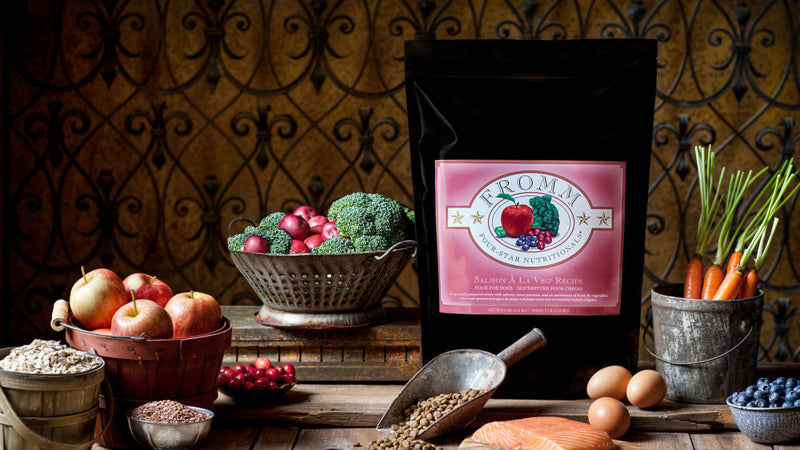 Shop / Fromm / Fromm Four Star Salmon A La Veg Dry Dog Food Fromm Four Star Salmon A La Veg Dry Dog Food Fromm $34.99 12 lb 4 lb 26 lb 12-lb 4-lb 26-lb Purchase Options Free In-Store Pick Up Not Available Save 10% on orders $49+ Set your store for inventory and store pickup details Zip Code Search Same-day Delivery* No minimum charge for delivery orders. *Order before 2pm and have it delivered today. Orders placed after 2pm will be delivered the next day. Must be inside delivery radius. Zip Code Unfortunately delivery is not available to this address. In order to ensure the best availability accuracy, changing your selected store will remove all items from your cart. You will need to re-add these items with your newly selected store if you choose to continue. Continue Cancel Ship it to Me Quantity Add To Cart Feeding guide disclaimer ✕ Feeding guides provide a starting point for the amount of food to give your pet each day. We recommend that you keep your pet in ideal body condition and not allow them to become overweight. The amount of food your pet needs can vary based on age, activity level or other food and treats given, so be sure to work with your veterinarian to determine an appropriate weight for your pet, and to make any necessary adjustments to their feeding. Information Fromm Four-Star Salmon À La Veg® is a delectable entrée of wild salmon combined with eggs, real Wisconsin cheese, and fresh handpicked vegetables and fruits. This artisan blend is prepared in small batches, ensuring consistency, quality, and superior taste in each and every bowl. Salmon À La Veg® provides complete and balanced nutrition for dogs of all ages and can be alternated with other Fromm Four-Star recipes.Why We Love It Fromm Family Foods is a fifth generation family-owned-and-operated artisan pet food company Produced at Fromm's hands-on family-owned-and-operated facility High nutrient digestibility and utilization Third party pathogenic bacteria testing on all production batches Fromm's specially developed blend of probiotics About FrommMaintaining a tradition of quiet innovation dedicated to the health and nutrition of dogs and cats since 1908, Fromm Family Foods is a family-owned and operated artisan dog and cat food company based in Wisconsin. Dedicated to food safety, Fromm ensures that every ingredient is tested and sampled before meeting their Wisconsin manufacturing facilities. With some of the highest inclusion levels of fresh meats, fish, fruits, vegetables, and real Wisconsin cheese, Fromm offers a holistic recipe for all types and tastes of dogs and cats, including grain-free, limited ingredient, puppy, and everything in between. Fromm Family Foods Products 2014 from Fromm Family Foods on Vimeo. Ingredients Salmon, Salmon Meal, Fish Broth, Oatmeal, Brown Rice, Pearled Barley, Chicken Fat (preserved with mixed tocopherols),Dried Egg Product, Whole Oats, White Rice, Dried Tomato Pomace, Salmon Oil (preserved with mixed tocopherols), Millet, Sweet Potatoes, Potatoes, Chicken, Herring Meal, Whole Barley, Dried Yeast, Cheese, Flaxseed, Chicken Liver, Carrots, Apples, Broccoli, Celery, Monocalcium Phosphate, Calcium Sulfate, Vitamins [Choline Chloride, Potassium Chloride, Vitamin E Supplement, Ascorbic Acid, Calcium Carbonate],Salt, Chicory Root Extract, Vitamins [Riboflavin Supplement, Niacin Supplement, Calcium Pantothenate, Vitamin A Supplement, Vitamin D3 Supplement, Pyridoxine Hydrochloride, Biotin, Vitamin B12 Supplement, Thiamine Mononitrate, Folic Acid], Minerals [Zinc Sulfate, Manganese Sulfate, Ferrous Sulfate, Magnesium Sulfate, Zinc Proteinate, Ferrous Proteinate, Manganese Proteinate, Copper Sulfate, Magnesium Proteinate, Copper Proteinate, Calcium Iodate, Sodium Selenite],Sorbic Acid (Preservative),Cranberries, Yucca Schidigera Extract, Blueberries, Taurine, Dried Lactobacillus paracasei Fermentation Product, Dried Lactobacillus reuteri Fermentation Product, Dried Lactobacillus acidophilus Fermentation Product, Dried Lactobacillus plantarum Fermentation Product. Guaranteed Analysis Nutrient Guaranteed Units Crude Protein 25% min Crude Fat 16% min Crude Fiber 5% max Moisture 10% max Customers also liked Customer Reviews