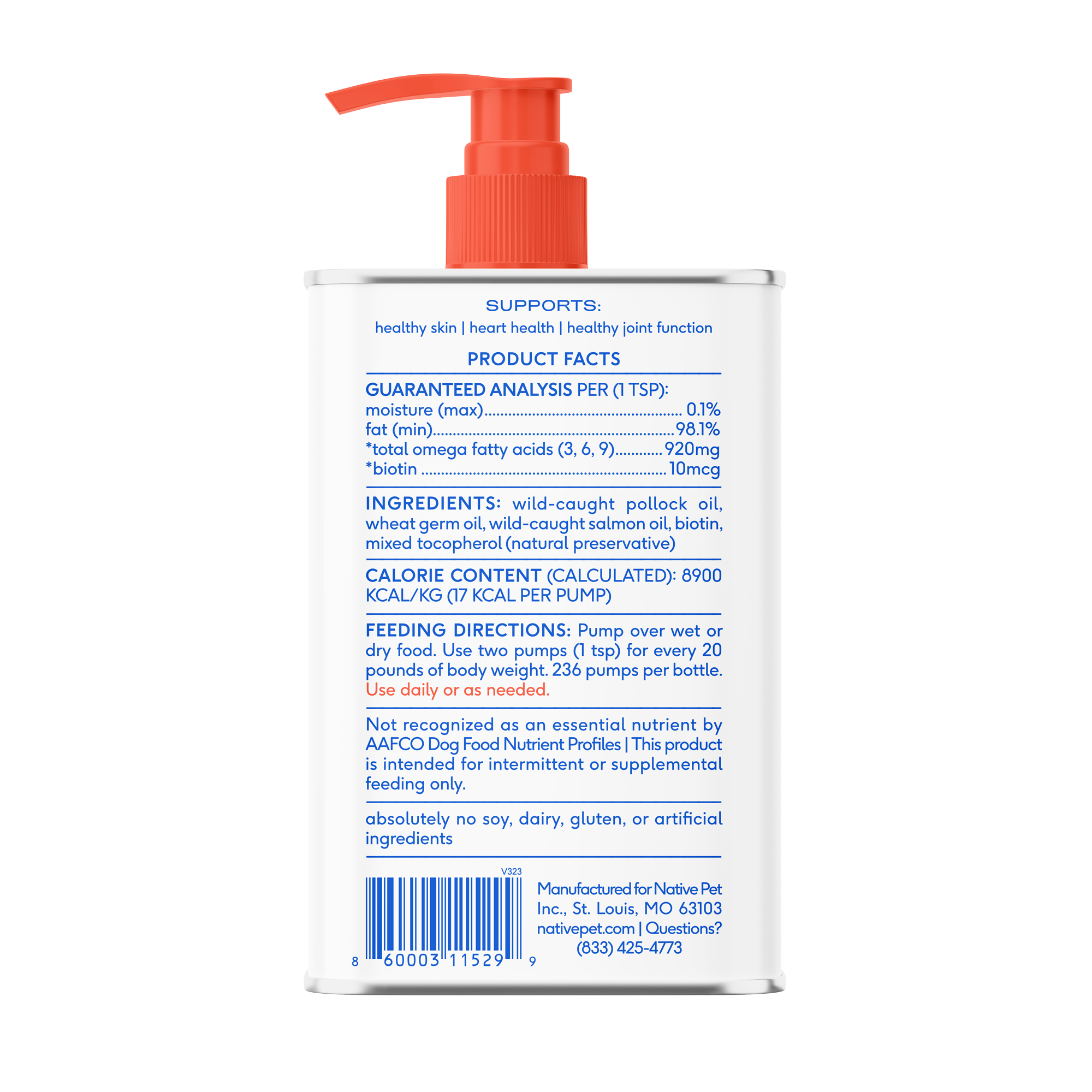 Shop / Health & Supplements / Native Pet Omega-3 Fish Oil & Alaskan Salmon Oil Skin & Coat Health Supplement for Dogs, 16 oz Native Pet Omega-3 Fish Oil & Alaskan Salmon Oil Skin & Coat Health Supplement for Dogs, 16 oz Native Pet 16oz $26.99 16oz Purchase Options Free In-Store Pick Up Not Available Save 20% on orders $100+ Set your store for inventory and store pickup details Zip Code Search Same-day Delivery* No minimum charge for delivery orders. *Order before 2pm and have it delivered today. Orders placed after 2pm will be delivered the next day. Must be inside delivery radius. Zip Code Unfortunately delivery is not available to this address. In order to ensure the best availability accuracy, changing your selected store will remove all items from your cart. You will need to re-add these items with your newly selected store if you choose to continue. Continue Cancel Ship it to Me Quantity Add To Cart Feeding guide disclaimer ✕ Feeding guides provide a starting point for the amount of food to give your pet each day. We recommend that you keep your pet in ideal body condition and not allow them to become overweight. The amount of food your pet needs can vary based on age, activity level or other food and treats given, so be sure to work with your veterinarian to determine an appropriate weight for your pet, and to make any necessary adjustments to their feeding. Information For that healthy shine, all the time, add Native Pet Omega 3 Fish Oil To Support Skin & Coat Health Dog Supplement to your pup’s diet. This omega oil is a targeted topper packed with omega-3 fatty acids that support your pal’s healthy skin and coat while supporting joint health and mobility, too. This supplement is crafted with wild Alaskan salmon and pollock. With one easy pump, this liquid supplement can make even the pickiest of pups gobble up his food. Ingredients: Pollock Oil, Salmon Oil, Wheat Germ Oil, Biotin Guaranteed Analysis: Moisture (max) 0.1%, Fat (min) 98.1%, *Total omega fatty acids (3, 6, 9) 920 mcg, *Biotin 10 mcg Customers also liked Customer Reviews
