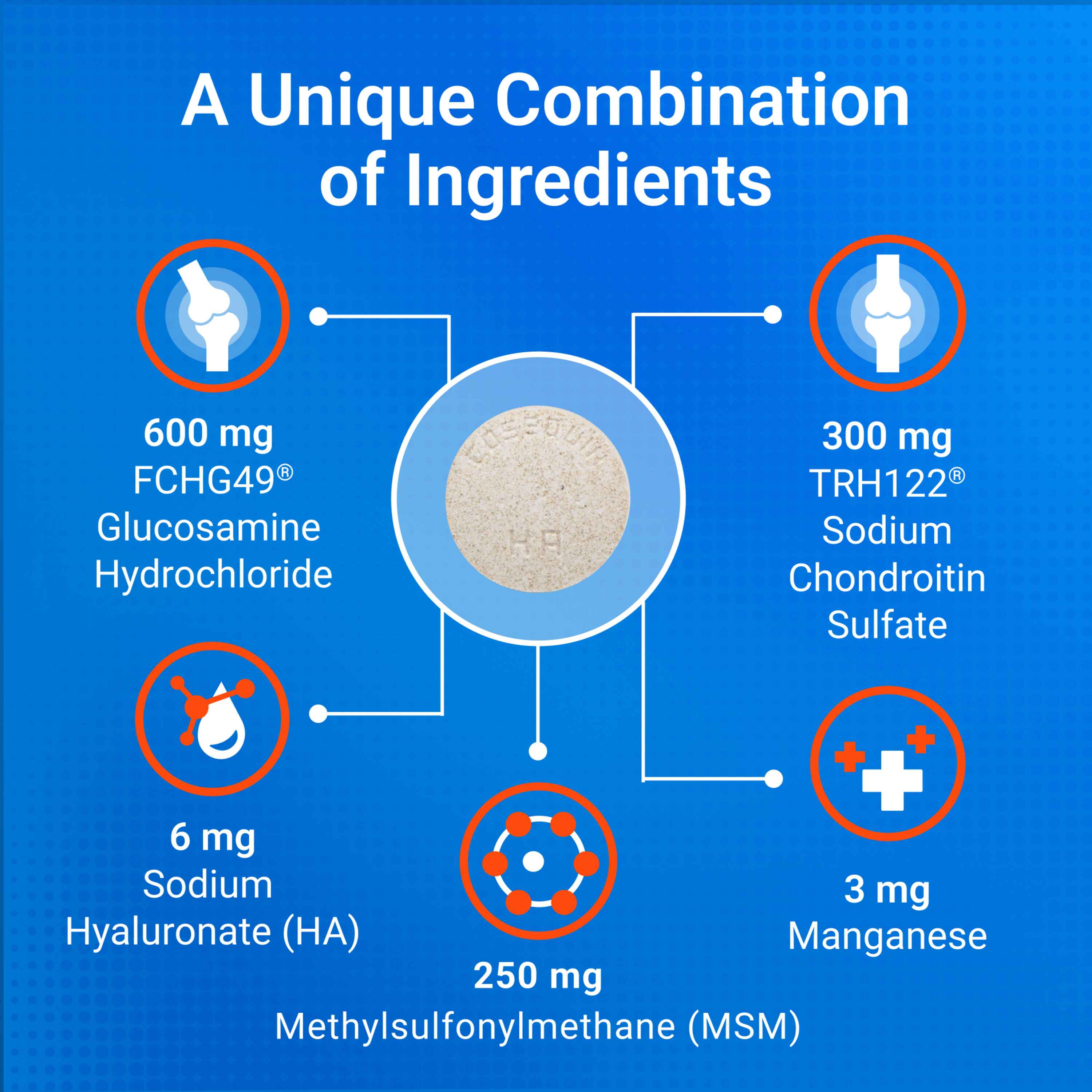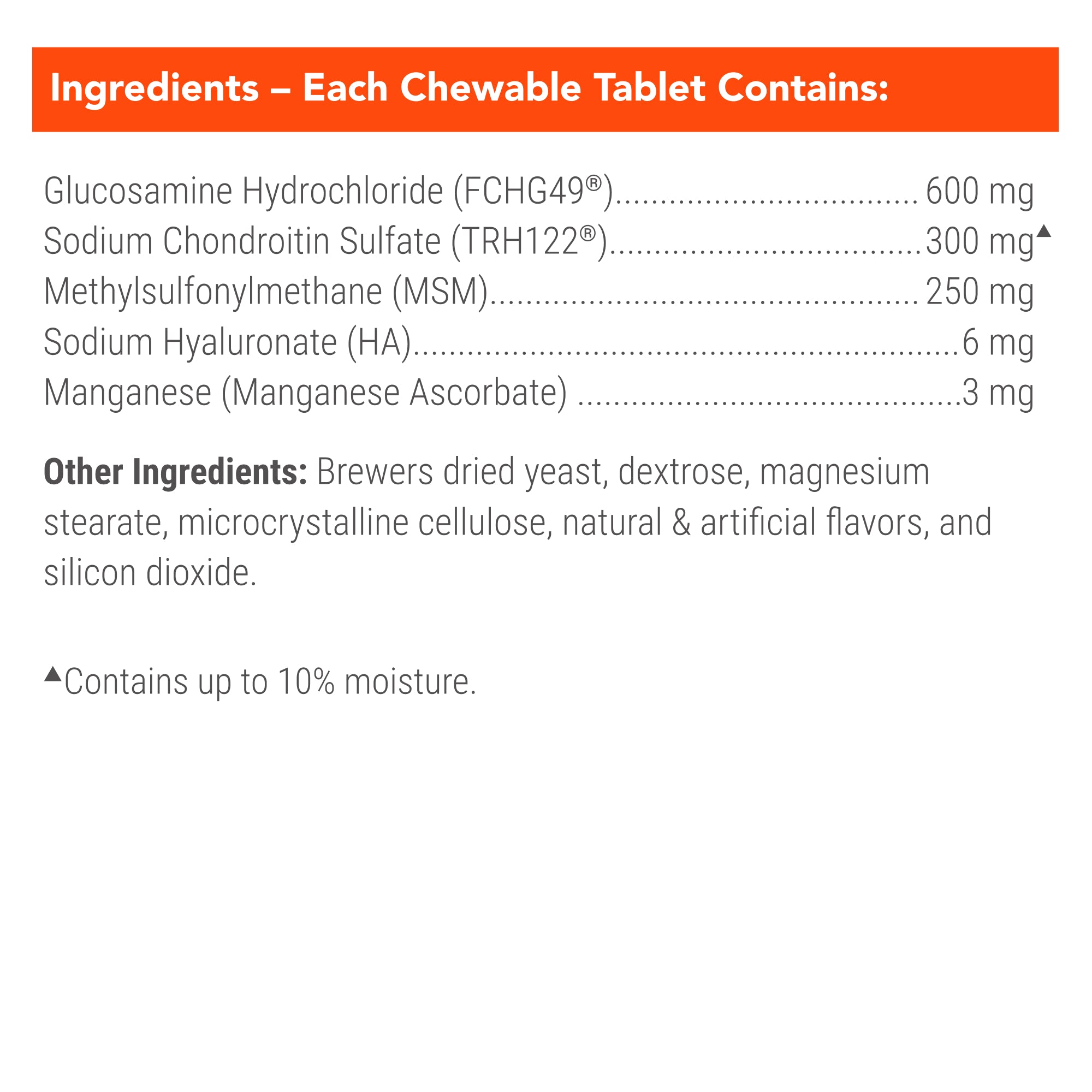 Shop / Health & Supplements / Nutramax Cosequin Maximum Strength Plus MSM & HA Chewable Tablets for Dogs, Count of 60 Nutramax Cosequin Maximum Strength Plus MSM & HA Chewable Tablets for Dogs, Count of 60 Nutramax Laboratories 60 $39.99 60 Purchase Options Free In-Store Pick Up Not Available Save 20% on orders $100+ Set your store for inventory and store pickup details Zip Code Search Same-day Delivery* No minimum charge for delivery orders. *Order before 2pm and have it delivered today. Orders placed after 2pm will be delivered the next day. Must be inside delivery radius. Zip Code Unfortunately delivery is not available to this address. In order to ensure the best availability accuracy, changing your selected store will remove all items from your cart. You will need to re-add these items with your newly selected store if you choose to continue. Continue Cancel Ship it to Me Quantity Add To Cart Information Cosequin Maximum Strength Plus MSM & HA contains FCHG49 Glucosamine Hydrochloride, TRH122 Sodium Chondroitin Sulfate, and MSM (Methylsulfonylmethane). This combination of ingredients helps maintain your dog's cartilage and connective tissue. Each chewable tablet also contains Hyaluronic acid (HA), which provides viscosity to the synovial fluid, supporting joint function and reducing friction between joint surfaces.Ingredients: Glucosamine Hydrochloride 600 mg, Sodium Chondroitin Sulfate 300 mg, Methylsulfonylmethane (MSM) 250 mg, Sodium Hyaluronate (HA) 6 mg, Manganese (Manganese Ascorbate) 3 mg. Other Ingredients: Brewers dried yeast, dextrose, magnesium stearate, microcrystalline cellulose, natural & artificial flavors, and silicon dioxide. Customers also liked Customer Reviews