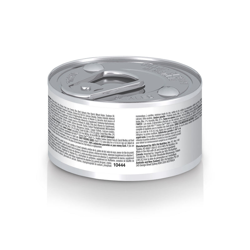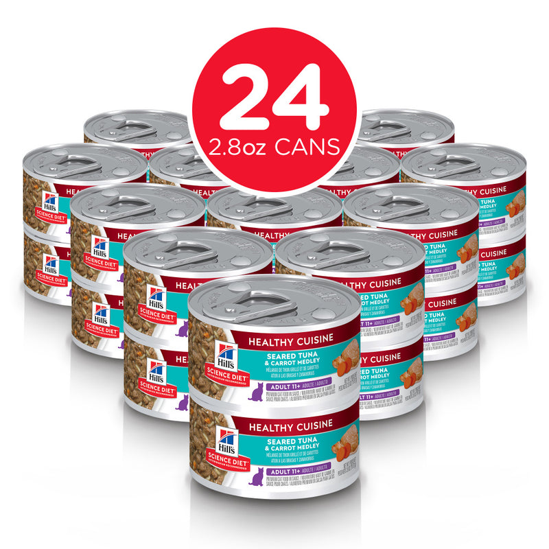 Shop / Hill's Science Diet / Hill's Science Diet Healthy Senior Cuisine Adult 11+ Seared Tuna & Carrot Medley Canned Cat Food Hill's Science Diet Healthy Senior Cuisine Adult 11+ Seared Tuna & Carrot Medley Canned Cat Food Hill's Science Diet Weight: 2.8 oz, case of 24 $47.99 2.8-oz, case of 24 Purchase Options Free In-Store Pick Up Not Available Save 10% on orders $49+ Set your store for inventory and store pickup details Zip Code Search Same-day Delivery* No minimum charge for delivery orders. *Order before 2pm and have it delivered today. Orders placed after 2pm will be delivered the next day. Must be inside delivery radius. Zip Code Unfortunately delivery is not available to this address. In order to ensure the best availability accuracy, changing your selected store will remove all items from your cart. You will need to re-add these items with your newly selected store if you choose to continue. Continue Cancel Ship it to Me Quantity Add To Cart Feeding guide disclaimer ✕ Feeding guides provide a starting point for the amount of food to give your pet each day. We recommend that you keep your pet in ideal body condition and not allow them to become overweight. The amount of food your pet needs can vary based on age, activity level or other food and treats given, so be sure to work with your veterinarian to determine an appropriate weight for your pet, and to make any necessary adjustments to their feeding. Information Made with purposeful ingredients for a flavorful, nutritious meal, Hill's Science Diet Adult 11+ Healthy Cuisine Seared Tuna & Carrot Medley combines the delicious flavors of real tuna and tender carrots in a mouthwatering sauce. Precisely balanced for kidney health in older cats, this senior cat food made with natural ingredients supports an aging immune system with clinically proven antioxidants, vitamin C, and vitamin E. The high-quality protein helps your mature cat maintain lean muscle with a formula that is easy to digest. There’s more to love with the new look of Science Diet. Some of our products also have new names & new formulas. • Senior cat food precisely balanced nutrition to sustain kidney and vital organ health in older felines • Provides mature cats with high-quality protein to help maintain lean muscle • Made with purposeful, easily digestible ingredients your mature cat will love Supports an old cat's immunity with clinically proven antioxidants and Vitamin C+E • This food can be used as a dry topper to add variety or fed as full meal Made with natural ingredients #1 Veterinarian Recommended Delicious seared tuna paired with tender carrots in a mouthwatering sauce Ingredients Chicken Broth, Tuna, Chicken, Pork Liver, Carrots, Beef, Rice, Rice Starch, Spinach, Wheat Gluten, Soybean Oil, Chicken Liver Flavor, Potassium Alginate, Titanium Dioxide color, L-Lysine, Powdered Cellulose, Chicken Fat, Calcium Chloride, Fish Oil, Choline Chloride, Guar Gum, Dicalcium Phosphate, Taurine, Calcium Lactate, Calcium Gluconate, vitamins (Vitamin E Supplement, L-Ascorbyl-2-Polyphosphate (source of Vitamin C), Thiamine Mononitrate, Niacin Supplement, Menadione Sodium Bisulfite Complex (source of Vitamin K), Pyridoxine Hydrochloride, Calcium Pantothenate, Vitamin B12 Supplement, Riboflavin Supplement, Vitamin D3 Supplement, Folic Acid, Biotin), Sodium Tripolyphosphate, L-Carnitine, minerals (Zinc Oxide, Ferrous Sulfate, Manganese Sulfate, Copper Sulfate, Calcium Iodate), Potassium Citrate, Beta-Carotene. Guaranteed Analysis Nutrient Guaranteed Units Crude Protein 5.5% min Crude Fat 2.5% min Crude Fiber 2% max Moisture 85% max Customers also liked Customer Reviews