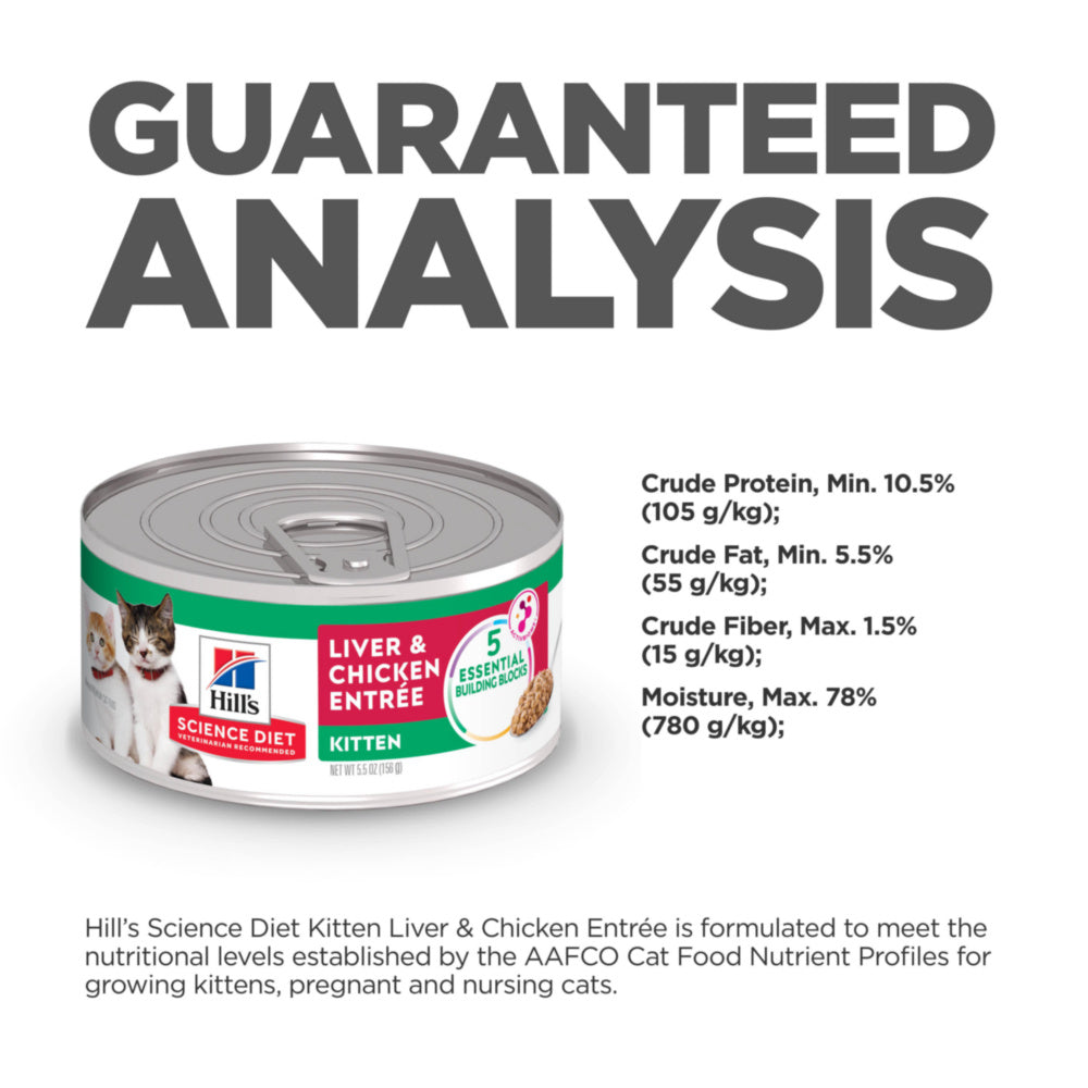 Shop / Hill's Science Diet / Hill's Science Diet Kitten Liver & Chicken Entree Canned Cat Food Hill's Science Diet Kitten Liver & Chicken Entree Canned Cat Food Hill's Science Diet $59.99 5.5 oz, case of 24 2.9 oz, case of 24 5.5-oz, case of 24 2.9-oz, case of 24 Purchase Options Free In-Store Pick Up Not Available Save 10% on orders $49+ Set your store for inventory and store pickup details Zip Code Search Same-day Delivery* No minimum charge for delivery orders. *Order before 2pm and have it delivered today. Orders placed after 2pm will be delivered the next day. Must be inside delivery radius. Zip Code Unfortunately delivery is not available to this address. In order to ensure the best availability accuracy, changing your selected store will remove all items from your cart. You will need to re-add these items with your newly selected store if you choose to continue. Continue Cancel Ship it to Me Quantity Add To Cart Feeding guide disclaimer ✕ Feeding guides provide a starting point for the amount of food to give your pet each day. We recommend that you keep your pet in ideal body condition and not allow them to become overweight. The amount of food your pet needs can vary based on age, activity level or other food and treats given, so be sure to work with your veterinarian to determine an appropriate weight for your pet, and to make any necessary adjustments to their feeding. Information Your little kitten needs premium pet nutrition that can keep up with their active lifestyle. That's why Hill's Science Diet Kitten Liver & Chicken Entree wet food uses high-quality ingredients to ensure availability of key nutrients and proteins for your young cat. Carefully formulated for the developmental needs of kittens, this cat food made with natural ingredients provides high-quality protein that will support a kitten's muscle growth and development. Balanced minerals promote strong bones and strong teeth, to keep your kitten healthy well throughout the first year of life. There’s more to love with the new look of Science Diet®. Some of our products also have new names, new kibble shapes & new formulas. • High-quality protein to help your kitten build and maintain lean muscle • Made with purposeful, easily digestible ingredients young cats enjoy • Contains a clinically proven antioxidant blend, plus vitamins C+E for your developing kitten's immune support • Canned food with balanced minerals for strong bones and healthy teeth • Try all three flavors to give your furry feline the variety they crave Made with natural ingredients Ingredients Water, Pork Liver, Pork By-Products, Chicken, Chicken Fat, Egg Product, Corn Starch, Pork Protein Isolate, Soybean Meal, Corn Gluten Meal, Chicken Liver Flavor, Dicalcium Phosphate, Fish Oil, Calcium Carbonate, L-Lysine, Brewers Dried Yeast, Guar Gum, Natural Flavor, Potassium Chloride, Powdered Cellulose, Iodized Salt, Calcium Sulfate, Dried Beet Pulp, Locust Bean Gum, vitamins (Vitamin E Supplement, L-Ascorbyl-2-Polyphosphate (source of Vitamin C), Thiamine Mononitrate, Niacin Supplement, Pyridoxine Hydrochloride, Calcium Pantothenate, Vitamin B12 Supplement, Riboflavin Supplement, Biotin, Vitamin D3 Supplement, Folic Acid), DL-Methionine, Carrageenan, Taurine, Magnesium Oxide, Sodium Tripolyphosphate, minerals (Ferrous Sulfate, Zinc Oxide, Copper Sulfate, Manganese Sulfate, Calcium Iodate), L-Tryptophan, Beta-Carotene. Guaranteed Analysis Nutrient Guaranteed Units Crude Protein 45.6 % Crude Fat 29.1 % Crude Fiber 0.9 % Carbohydrates 14.8 % Calcium 1.57 % Phosphorus 1.22 % Potassium 1.14 % Sodium 0.5 % Magnesium 0.137 % Taurine 0.56 % Vitamin C 193 ppm Vitamin E 660 IU/kg DHA 0.247 % Omega-3 Fatty Acids 1.01 % Omega-6 Fatty Acids 5.58 % Customers also liked Customer Reviews