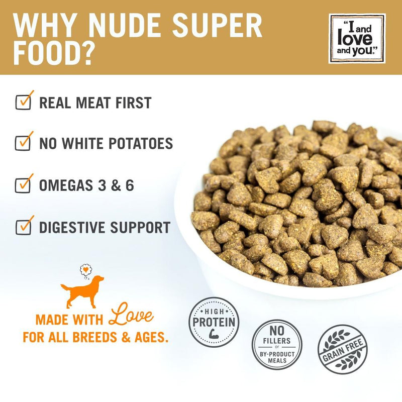 Shop / I and Love and You / I and Love and You Grain Free Nude Super Food Poultry Palooza Dry Dog Food I and Love and You Grain Free Nude Super Food Poultry Palooza Dry Dog Food I and Love and You Weight: 23 lb $74.99 Sorry, this product is currently out of stock. Feeding guide disclaimer ✕ Feeding guides provide a starting point for the amount of food to give your pet each day. We recommend that you keep your pet in ideal body condition and not allow them to become overweight. The amount of food your pet needs can vary based on age, activity level or other food and treats given, so be sure to work with your veterinarian to determine an appropriate weight for your pet, and to make any necessary adjustments to their feeding. Information ‘Scuse me? Is that Dinner? Your dog may not have exquisite table manners. He may not unfold a linencloth napkin in his lap, and he may mix up his salad fork with his entree fork. (It's okay, buddy. Sometimes we do that, too.) But your dog never fails to appreciate a great meal. Our Nude Food™ Kibble is made with tasty, turkey and real veggies + fruit. High protein and grain free, your dog just might ignore the elbows-on-the-table rule when you call him over for dinner. We don't blame him. Just make sure he doesn't forget "When in doubt, pinky out" at tea time. That would be embarrassing.Why We Love It SUPERFOODS ADDED: Includes additional superfoods like flaxseeds, coconut oil and turmeric ALWAYS GRAIN FREE: No, no, no grains, you’re not invited to this dinner party. We’re serving garbanzo beans, red lentils, and sweet potatoes instead of grains NO FILLERS, ALL LOVE: Non-GMO protein or produce, no by-product meals, wheat, corn, soy, rice, artificial preservatives, flavors, or colors Nothing weird or scary. REAL MEAT IS THE FIRST INGREDIENT: This super premium, high protein dog food has 34% protein with the first three ingredients meat, fish, or poultry sourced; available in Turkey + Chicken, Pork + Wild Boar, and Whitefish + Salmon DIGESTIVE BENEFITS: We use digestive enzymes, prebiotics + probiotics, to promote happy tummies and gastrointestinal health About I and Love and YouThe best love is the best food, and the best food should be available to ALL furry friends. Small and large, purebred and mixed, stray and rescue. We celebrate the incredible bond between human and pet. It’s why we’re called “I and love and you”. We get it. We are pet parents too—the type who match outfits with them, give them social media accounts, talk in their voices and bring their personalities to life, give up our beds to them, and stay home on Friday nights with them. Because love. Ingredients Turkey, chicken meal, turkey meal, chickpeas, red lentils, pea starch, peas, chicken fat (preserved with mixed tocopherols and citric acid), sweet potatoes, chicken, dried carrots, ground miscanthus grass, natural flavors, potassium chloride, whole ground flaxseeds, chicken liver, fish oil, Vitamin A supplement, Vitamin D3 supplement, Vitamin E supplement, niacin supplement, pantothenic acid, pyridoxine hydrochloride, riboflavin supplement, folic acid, biotin, Vitamin B12 supplement, olive oil, apples, hydrolyzed chicken liver, yeast culture, sodium bicarbonate, dried Aspergillus oryzae fermentation product, dried Aspergillus niger fermentation product, dried Trichoderma longbrachiatum fermentation product, dried Candida rugose fermentation product, dried Enterococcus faecium fermentation product, dried Lactobacillus acidphophilus fermentation product, dried Lactobacillus casei fermentation product, calcium carbonate, zinc proteinate, zinc sulfate, iron proteinate, ferrous sulfate, copper proteinate, copper sulfate, manganese proteinate, sodium selenite, manganese oxide, calcium iodate, ethylenediamine dihydroiodide, coconut oil, dried chicory root, salt, pumpkin, mixed tocopherols (as preservative), rosemary extract, choline chloride, turmeric, yucca schidegera extract. Guaranteed Analysis Nutrient Guaranteed Units Crude Protein 34.0% min Crude Fat 15.0% min Crude Fiber 5.0% max Moisture 10.0% max Vitamin E 100 IU/kg min Omega-3 Fatty Acids 0.45% min Omega-6 Fatty Acids 2.0% min EPA 0.04% min DHA 0.03% min Total Microorganisms 9,500,000 CFU/lb Customers also liked Customer Reviews