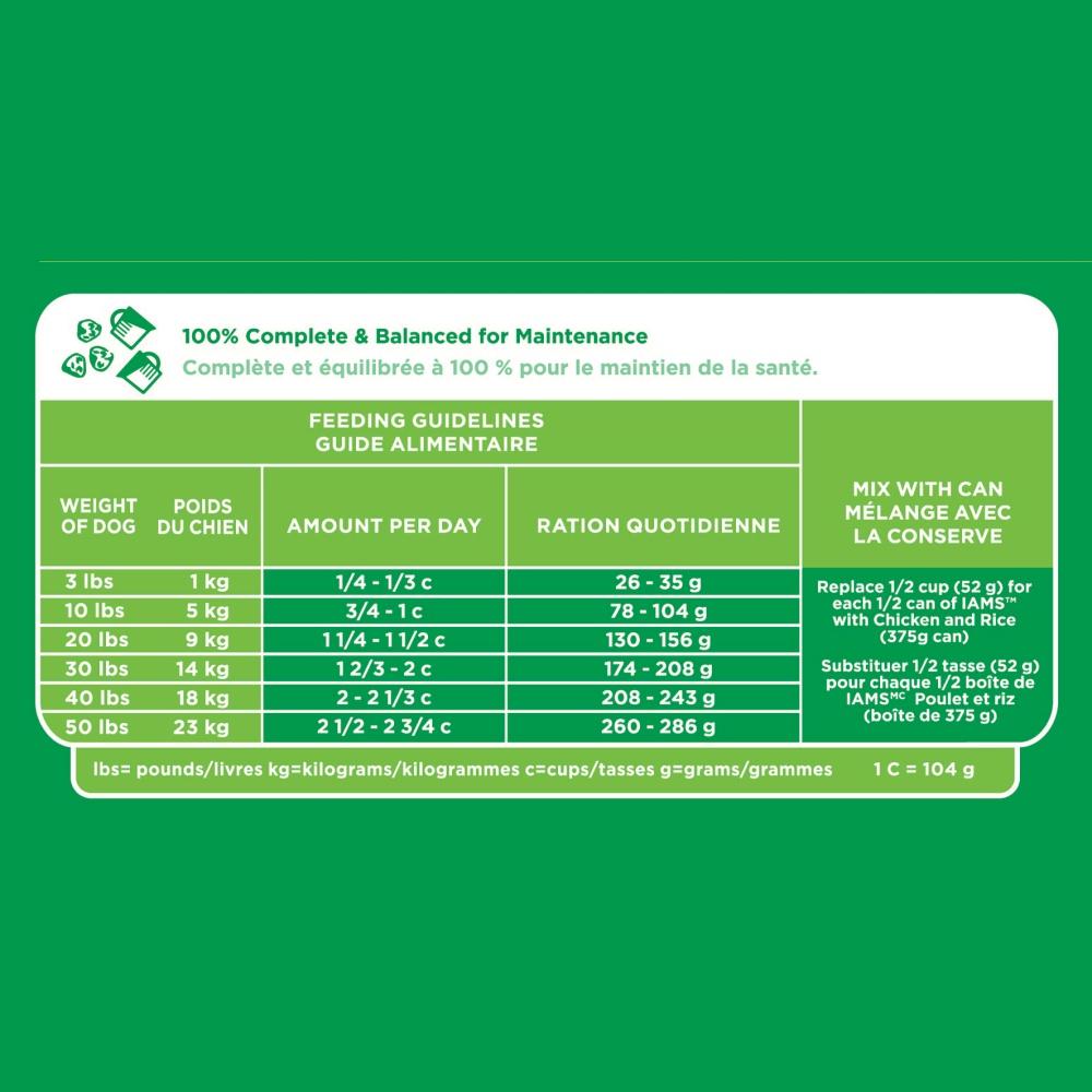 Shop / Iams / Iams ProActive Health Adult MiniChunks Dry Dog Food 15lb Iams ProActive Health Adult MiniChunks Dry Dog Food 15lb IAMS Weight: 15 lb $29.99 15-lb Purchase Options Free In-Store Pick Up Not Available Save 20% on orders $100+ Set your store for inventory and store pickup details Zip Code Search Same-day Delivery* No minimum charge for delivery orders. *Order before 2pm and have it delivered today. Orders placed after 2pm will be delivered the next day. Must be inside delivery radius. Zip Code Unfortunately delivery is not available to this address. In order to ensure the best availability accuracy, changing your selected store will remove all items from your cart. You will need to re-add these items with your newly selected store if you choose to continue. Continue Cancel Ship it to Me Quantity Add To Cart Feeding guide disclaimer ✕ Feeding guides provide a starting point for the amount of food to give your pet each day. We recommend that you keep your pet in ideal body condition and not allow them to become overweight. The amount of food your pet needs can vary based on age, activity level or other food and treats given, so be sure to work with your veterinarian to determine an appropriate weight for your pet, and to make any necessary adjustments to their feeding. Information Satisfy your small dog's craving for real meat proteins, and give them 100% complete and balanced nutrition with IAMS PROACTIVE HEALTH Adult Minichunks Dry Dog Food. Our hearty dog food is made with real chicken as the first ingredient. Your active dog's favorite pet food, now in a smaller kibble size, delivers the hearty protein they need to maintain lean muscles. Plus, it includes L-carnitine to help burn fat and promote a healthy metabolism. IAMS PROACTIVE HEALTH Dog Food also is formulated with seven essential nutrients to nourish your dog's heart. Your dog will feel the benefits of our wholesome dog food, and you will notice their healthier skin, shinier coat and reduced tartar buildup. Best of all, IAMS PROACTIVE HEALTH Food for Active Dogs is made without fillers or artificial preservatives, so you can be confident that your adult dog is getting wholesome nutrition in every small bite. Ingredients Chicken, Ground Whole Grain Corn, Ground Whole Grain Sorghum, Chicken By-Product Meal, Dried Beet Pulp, Natural Flavor, Chicken Fat (preserved with mixed Tocopherols), Dried Egg Product, Potassium Chloride, Flaxseed, Caramel Color, Salt, L-Lysine Monohydrochloride, Choline Chloride, Carrots, Tomatoes,Calcium Carbonate, Fructooligosaccharides, Spinach, Green Peas, Minerals (Ferrous Sulfate, Zinc Oxide, Sodium Selenite, Manganese Sulfate, Copper Sulfate, Manganous Oxide, Potassium Iodide), Vitamins (Vitamin E Supplement, Ascorbic Acid, Calcium Pantothenate, Vitamin A Supplement, Biotin, Thiamine Mononitrate (source of Vitamin B1), Vitamin B12 supplement, Niacin, Riboflavin Supplement (source of Vitamin B2), Inositol, Pyridoxine Hydrochloride (source of Vitamin B6), Vitamin D3 Supplement, Folic Acid), Dried Brewers Yeast, DL-Methionine, Dried Apple Pomace, L-Carnitine, Dried Blueberry Pomace, Mixed Tocopherols, Rosemary Extract. Guaranteed Analysis Nutrient Guaranteed Units Crude Protein 25.0% min Crude Fat 14.0% min Crude Fiber 4.0% max Moisture 10.0% max Ash 8.0% max Calcium 1.05% min Calcium 1.8% max Phosphorus 0.7% min Phosphorus 1.25% max L-Carnitine 40 mg/kg min Omega-6 Fatty Acids 2.15% min Omega-3 Fatty Acids 0.14% min Customers also liked Customer Reviews