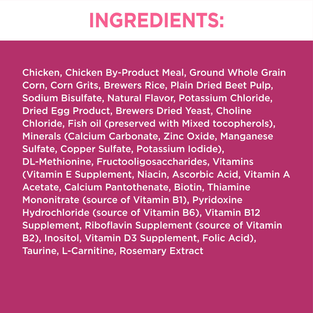 Shop / Iams / Iams Proactive Health Adult Urinary Tract Healthy With Chicken Cat Kibble Dry Cat Food Iams Proactive Health Adult Urinary Tract Healthy With Chicken Cat Kibble Dry Cat Food IAMS Weight: 16 lb $33.99 16-lb Purchase Options Free In-Store Pick Up Not Available Save 10% on orders $49+ Set your store for inventory and store pickup details Zip Code Search Same-day Delivery* No minimum charge for delivery orders. *Order before 2pm and have it delivered today. Orders placed after 2pm will be delivered the next day. Must be inside delivery radius. Zip Code Unfortunately delivery is not available to this address. In order to ensure the best availability accuracy, changing your selected store will remove all items from your cart. You will need to re-add these items with your newly selected store if you choose to continue. Continue Cancel Ship it to Me Quantity Add To Cart Feeding guide disclaimer ✕ Feeding guides provide a starting point for the amount of food to give your pet each day. We recommend that you keep your pet in ideal body condition and not allow them to become overweight. The amount of food your pet needs can vary based on age, activity level or other food and treats given, so be sure to work with your veterinarian to determine an appropriate weight for your pet, and to make any necessary adjustments to their feeding. Information IAMS knows that each cat is different. Thats why our range of recipes has been specifically tailored to your cats needs and life stages. Keep your cats at their best with IAMS PROACTIVE HEALTH Adult Urinary Tract Health Dry Cat Food with Chicken. Perfect for outdoor or indoor cats, this formula helps reduce the pH in cat urine to promote urinary tract health. Chicken is the #1 ingredient in this protein-rich cat kibble formula. Plus, it includes vitamin E to maintain a healthy feline immune system, as well as essential nutrients, like calcium and potassium, for a healthy heart. The kibble has an optimal omega-6 and -3 fatty acid ratio for a soft, shiny coat, and the crunchy texture helps reduce plaque buildup. So, if youre looking for a dry food for urinary tract health, get your paws on this and keep your feline happy, healthy, and ready to pounce with IAMS. Ingredients Chicken, Chicken By-Product Meal, Ground Whole Grain Corn, Corn Grits, Brewers Rice, Plain Dried Beet Pulp, Sodium Bisulfate, Natural Flavor, Potassium Chloride, Dried Egg Product, Brewers Dried Yeast, Choline Chloride, Fish oil (preserved with Mixed tocopherols), Minerals (Calcium Carbonate, Zinc Oxide, Manganese Sulfate, Copper Sulfate, Potassium Iodide), DL-Methionine, Fructooligosaccharides, Vitamins (Vitamin E Supplement, Niacin, Ascorbic Acid, Vitamin A Acetate, Calcium Pantothenate, Biotin, Thiamine Mononitrate (source of Vitamin B1), Pyridoxine Hydrochloride (source of Vitamin B6), Vitamin B12 Supplement, Riboflavin Supplement (source of Vitamin B2), Inositol, Vitamin D3 Supplement, Folic Acid), Taurine, L-Carnitine, Rosemary Extract Customers also liked Customer Reviews