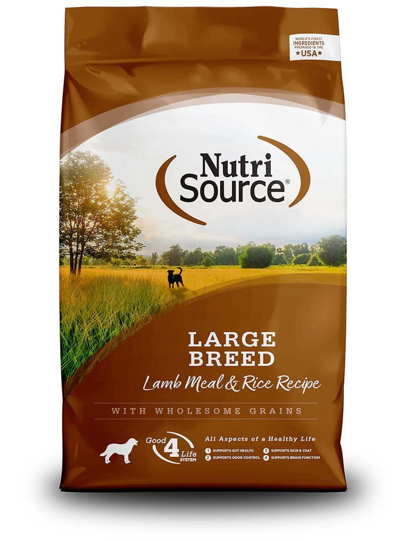 Shop / NutriSource / NutriSource Large Breed Lamb Meal & Rice 26lbs NutriSource Large Breed Lamb Meal & Rice 26lbs NutriSource 26lb $65.99 26lb Purchase Options Free In-Store Pick Up Not Available Save 10% on orders $49+ Set your store for inventory and store pickup details Zip Code Search Same-day Delivery* No minimum charge for delivery orders. *Order before 2pm and have it delivered today. Orders placed after 2pm will be delivered the next day. Must be inside delivery radius. Zip Code Unfortunately delivery is not available to this address. In order to ensure the best availability accuracy, changing your selected store will remove all items from your cart. You will need to re-add these items with your newly selected store if you choose to continue. Continue Cancel Ship it to Me Quantity Add To Cart Feeding guide disclaimer ✕ Feeding guides provide a starting point for the amount of food to give your pet each day. We recommend that you keep your pet in ideal body condition and not allow them to become overweight. The amount of food your pet needs can vary based on age, activity level or other food and treats given, so be sure to work with your veterinarian to determine an appropriate weight for your pet, and to make any necessary adjustments to their feeding. Information NutriSource® Large Breed Lamb Meal & Rice Recipe Dog Food is a scientifically formulated, easy-to-digest food. Real lamb meal is the number one ingredient. Lamb meal has a rich, wholesome taste dogs love and is a source of high quality protein that helps maintain muscle mass and strength. Our blend of lamb meal, rice and carefully selected ingredients help balance essential nutrients necessary for health and well being for your furry friend. Feed with confidence knowing that you’re part of a family that loves your pets just as much as you do. Health begins here. Ingredients Lamb meal, brown rice, barley, oatmeal, menhaden fish meal, dried plain beet pulp, natural turkey and chicken flavor, flax seed, chicken fat (preserved with tocopherols and citric acid), sunflower meal, dehydrated alfalfa meal, brewers dried yeast, sunflower oil, potassium chloride, salt, DL methionine, choline chloride, minerals (zinc proteinate, iron proteinate, copper proteinate, manganese proteinate, selenium yeast), vitamins (vitamin A acetate, vitamin D3 supplement, vitamin E supplement, niacin, d-calcium pantothenate, thiamine mononitrate, pyridoxine hydrochloride, riboflavin supplement, folic acid, biotin, vitamin B12 supplement), lactic acid, L-ascorbyl-2-polyphosphate (source of vitamin C), taurine, yucca schidigera extract, L-carnitine, rosemary extract, yeast culture, dried Aspergillus oryzae fermentation extract, dried Bacillus subtilis fermentation product, dried Bacillus licheniformis fermentation product, dried Trichoderma longibrachiatum fermentation extract, dried Enterococcus faecium fermentation product, dried Lactobacillus acidophilus fermentation product, and dried Bacillus subtilis fermentation extract. Guaranteed Analysis Crude Protein (Min.) 23.0% 230 g/kgCrude Fat (Min.) 14.0% 140 g/kgCrude Fiber (Max.) 6.0% 60 g/kgMoisture (Max.) 10.0% 100 g/kgDL Methionine (Min.) 0.25% 2.5 g/kgEicosapentaenoic (EPA) + Docosahexaenoic Acid (DHA) (Min.) 0.1% 1 g/kgIron (Min.) 155 mg/kg 155 mg/kgCopper (Min.) 12.5 mg/kg 12.5 mg/kgManganese (Min.) 13 mg/kg 13 mg/kgZinc (Min.) 150 mg/kg 150 mg/kgSelenium (Min.) 0.35 mg/kg 0.35 mg/kgCholine Chloride (Min.) 0.2% 2 g/kg*Omega – 6 Fatty Acids (Min.) 2.4% 24 g/kg*Omega – 3 Fatty Acids (Min.) 1.0% 10 g/kg*Taurine (Min.) .08% .8 g/kg*Glucosamine (Min.) 180 mg/kg*Chondroitin Sulfate (Min.) 600 mg/kg*L-Carnitine (Min.) 20 mg/kg*Total Microorganisms (Min.) (Saccharomyces cerevisiae, Bacillus subtilis, Bacillus licheniformis, Enterococcus faecium, Lactobacillus acidophilus) 100 million CFU/lb ***Not recognized as an essential nutrient by the AAFCO Dog Food Nutrient Profiles.** Colony Forming Units per pound Customers also liked Customer Reviews