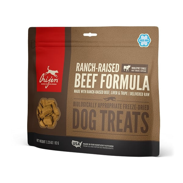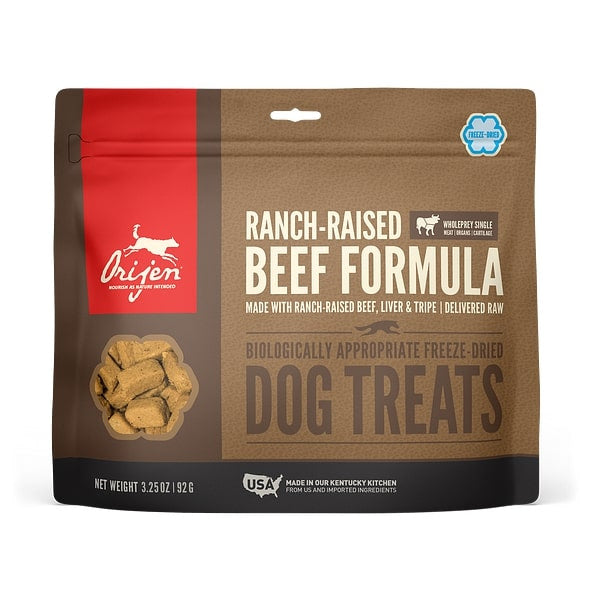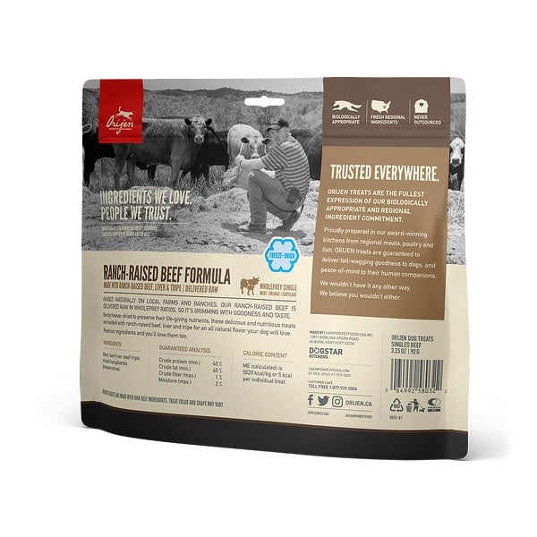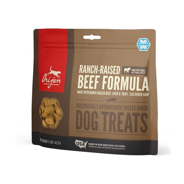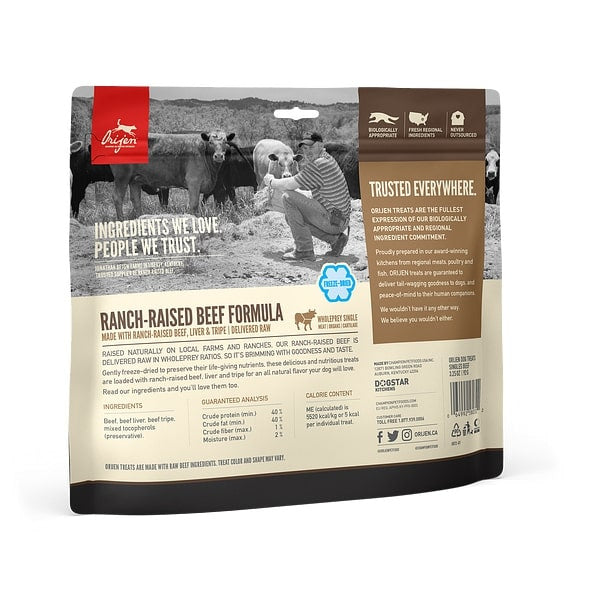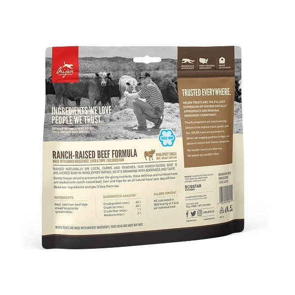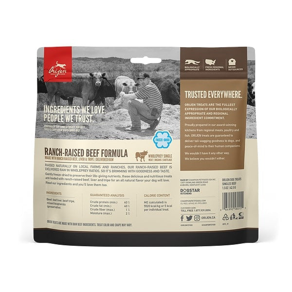 Shop / ORIJEN / ORIJEN Freeze Dried Ranch Raised Beef Dog Treats ORIJEN Freeze Dried Ranch Raised Beef Dog Treats ORIJEN Weight: 1.5 oz $9.99 Sorry, this product is currently out of stock. Feeding guide disclaimer ✕ Feeding guides provide a starting point for the amount of food to give your pet each day. We recommend that you keep your pet in ideal body condition and not allow them to become overweight. The amount of food your pet needs can vary based on age, activity level or other food and treats given, so be sure to work with your veterinarian to determine an appropriate weight for your pet, and to make any necessary adjustments to their feeding. Information ORIJEN freeze-dried treats are prepared without cooking, so they retain all of the natural goodness of our authentically fresh ingredients. Our freeze-dry kitchens are equipped with nitrogen tunnels which flash-freeze our fresh ingredients at extremely low temperatures (-60°F), locking in their life-giving nutrients. Then an 18-hour freeze-drying process gently converts the water frozen in the ingredients into ice vapour, without creating any liquid. This means only water is removed from our fresh ingredients, leaving behind all their goodness in concentrated form, creating a nourishing taste experience your dog will love. Ingredients Beef, beef liver, beef tripe, mixed tocopherols (preservative). Guaranteed Analysis Nutrient Guaranteed Units Crude Protein 40% min Crude Fat 40% min Crude Fiber 1% max Moisture 2% max Customers also liked Customer Reviews