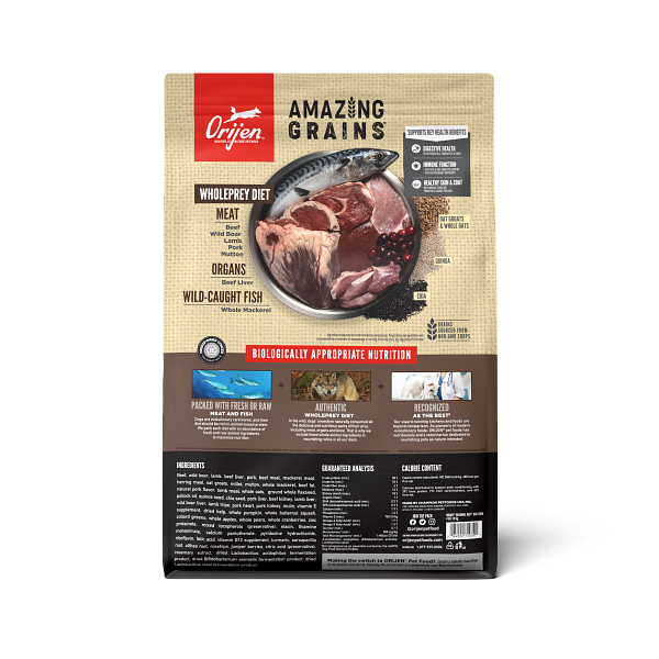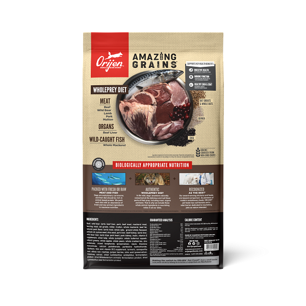 Shop / ORIJEN / ORIJEN High Protein Amazing Grains Regional Red Dry Dog Food ORIJEN High Protein Amazing Grains Regional Red Dry Dog Food ORIJEN $34.99 4 lb 22.5 lb 4-lb 22.5-lb Purchase Options Free In-Store Pick Up Not Available Save 10% on orders $49+ Set your store for inventory and store pickup details Zip Code Search Same-day Delivery* No minimum charge for delivery orders. *Order before 2pm and have it delivered today. Orders placed after 2pm will be delivered the next day. Must be inside delivery radius. Zip Code Unfortunately delivery is not available to this address. In order to ensure the best availability accuracy, changing your selected store will remove all items from your cart. You will need to re-add these items with your newly selected store if you choose to continue. Continue Cancel Ship it to Me Quantity Add To Cart Feeding guide disclaimer ✕ Feeding guides provide a starting point for the amount of food to give your pet each day. We recommend that you keep your pet in ideal body condition and not allow them to become overweight. The amount of food your pet needs can vary based on age, activity level or other food and treats given, so be sure to work with your veterinarian to determine an appropriate weight for your pet, and to make any necessary adjustments to their feeding. Information ORIJEN® Amazing Grains is packed with fresh or raw animal protein and enhanced with hand-selected grains to give your dog peak nourishment. With 90%* premium animal ingredients, ORIJEN Regional Red with Amazing Grains includes WholePrey ingredients from beef, wild boar, goat, lamb and wild-caught mackerel. These nutrient-dense animal ingredients provide your dog with the protein, vitamins and minerals they need to thrive. We’ve also added only the most amazing grains in a high-quality blend of oats, quinoa and chia and more, hand-selected to provide a balanced fiber ratio that helps support your dog’s digestive health. Nourish your dog completely with the amazing animal protein and quality grains found in ORIJEN Amazing Grains. Ingredients Beef, wild boar, lamb, beef liver, pork, beef meal, mackerel meal, herring meal, oat groats, millet, mutton, whole mackerel, beef fat, natural pork flavor, lamb meal, whole oats, ground whole flaxseed, pollock oil, quinoa seed, chia seed, pork liver, beef kidney, lamb liver, wild boar liver, lamb tripe, pork heart, pork kidney, inulin, vitamin E supplement, dried kelp, whole pumpkin, whole butternut squash, collard greens, whole apples, whole pears, whole cranberries, zinc proteinate, mixed tocopherols (preservative), niacin, thiamine mononitrate, calcium pantothenate, pyridoxine hydrochloride, riboflavin, folic acid, vitamin B12 supplement, turmeric, sarsaparilla root, althea root, rosehips, juniper berries, citric acid (preservative), rosemary extract, dried Lactobacillus acidophilus fermentation product, dried Bifidobacterium animalis fermentation product, dried Lactobacillus casei fermentation product. Guaranteed Analysis Nutrient Guaranteed Units Crude Protein 38% min Crude Fat 18% min Crude Fiber 4% max Moisture 12% max DHA & EPA 0.3% min Calcium 1.9% min Phosphorus 1.2% min Vitamin E 750 IU/kg min Omega-6 Fatty Acids 1.7% min Omega-3 Fatty Acids 1.4% min Taurine 0.1% min Glucosamine 500 mg/kg Total Microorganisms 1 Million CFU/lb Customers also liked Customer Reviews