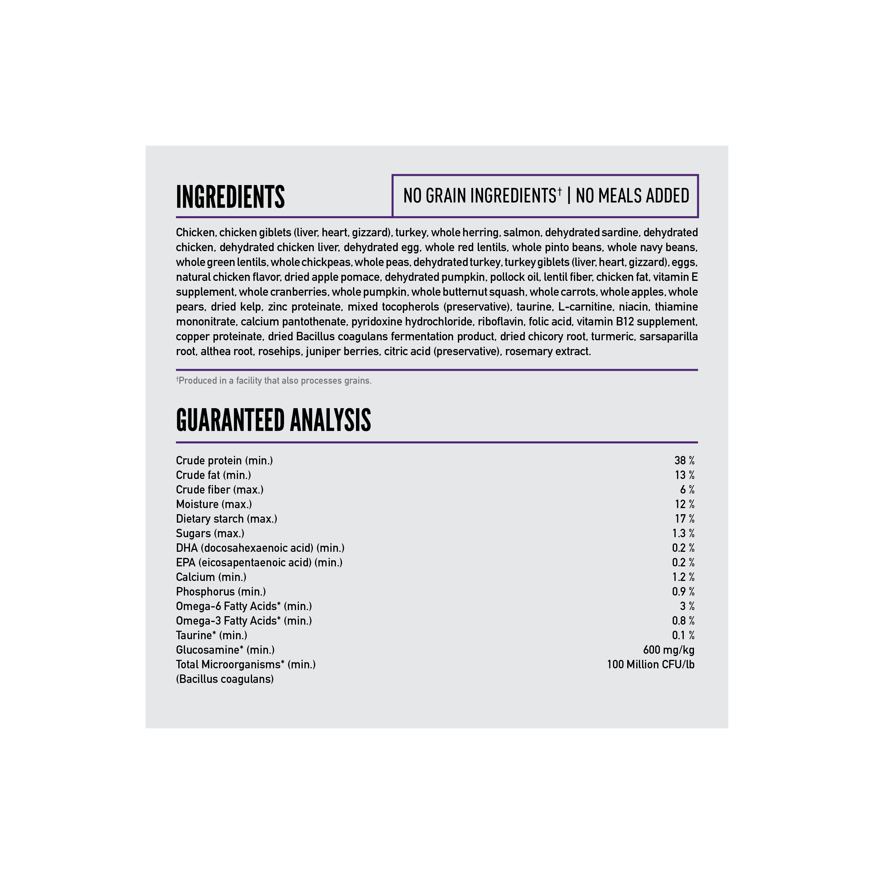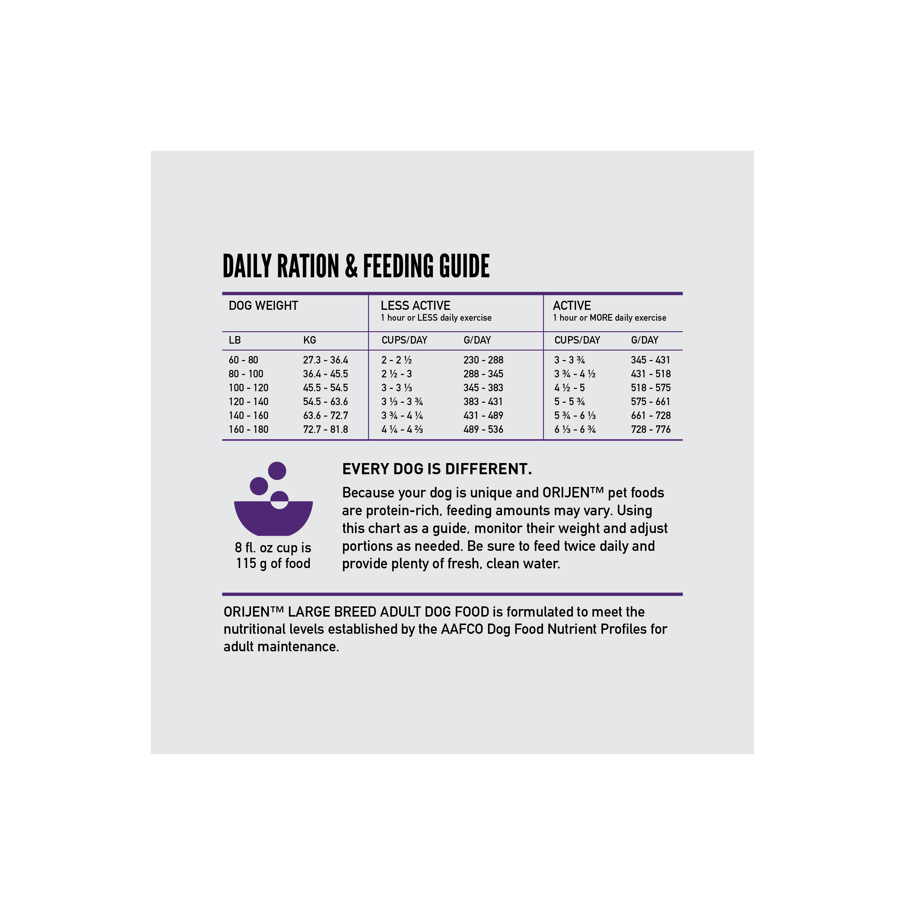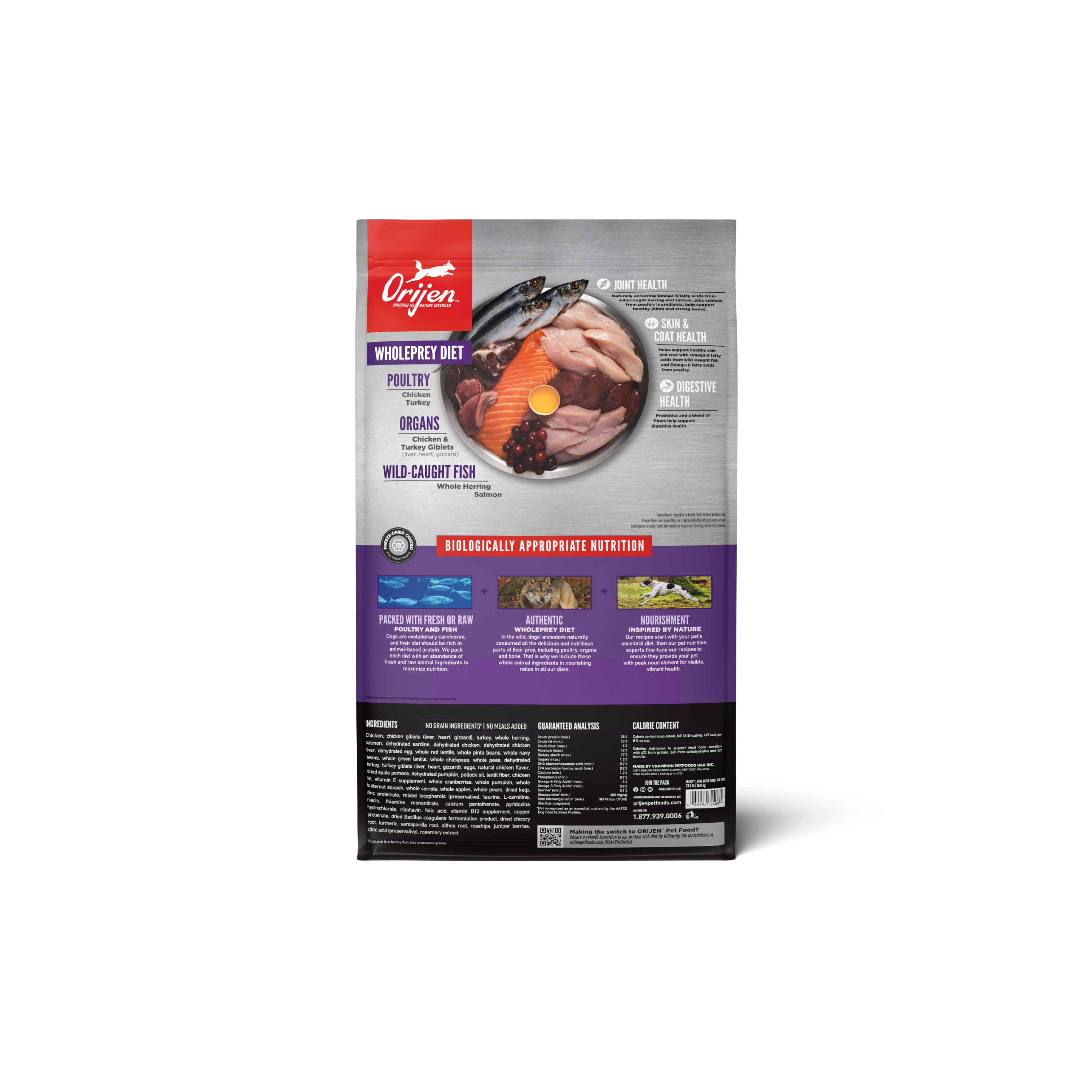 Shop / ORIJEN / ORIJEN Large Breed Adult 23.5LB ORIJEN Large Breed Adult 23.5LB ORIJEN 23.5 LB $105.99 23.5 LB Purchase Options Free In-Store Pick Up Not Available Save 20% on orders $100+ Set your store for inventory and store pickup details Zip Code Search Same-day Delivery* No minimum charge for delivery orders. *Order before 2pm and have it delivered today. Orders placed after 2pm will be delivered the next day. Must be inside delivery radius. Zip Code Unfortunately delivery is not available to this address. In order to ensure the best availability accuracy, changing your selected store will remove all items from your cart. You will need to re-add these items with your newly selected store if you choose to continue. Continue Cancel Ship it to Me Quantity Add To Cart Feeding guide disclaimer ✕ Feeding guides provide a starting point for the amount of food to give your pet each day. We recommend that you keep your pet in ideal body condition and not allow them to become overweight. The amount of food your pet needs can vary based on age, activity level or other food and treats given, so be sure to work with your veterinarian to determine an appropriate weight for your pet, and to make any necessary adjustments to their feeding. Information Help your large breed dog thrive with a Biologically Appropriate diet packed with whole animal ingredients. Our ORIJEN‰ã¢ Large Breed Adult diet is tailored to the unique needs of large breed dogs, and it helps support key health benefits including Joint Health, Skin & Coat Health and Digestive Health. Crafted with 85%* quality animal ingredients like free-run** chicken and turkey, and wild-caught fish, this recipe is rich with nutrients that help your large breed dog be their best. Packed with WholePrey animal ingredients like organs, this recipe is made with the most nutrient-dense, succulent parts of the prey to deliver the nourishment large breed dogs need. The result is a diet for your canine companion that is beyond comparison. *Approximate and derived from the unprocessed state of the ingredients.**Our free-run chickens and turkeys are not housed in cages and are able to move in a barn without outdoor access.Our fresh ingredients use refrigeration as the sole method of preservation and our raw ingredients are frozen at their peak freshness. Our authentic WholePrey diet features the most nourishing parts of the prey like poultry or fish, and organs to mimic what your dog's ancestors consumed in the wild. Helps support your large breed dog‰۪s joint health with naturally occurring Omega-3 fatty acids from wild-caught herring and salmon, plus calcium from poultry ingredients. Helps support skin & coat health with Omega-3 fatty acids from wild-caught fish and Omega-6 fatty acids from poultry. Helps support your large breed dog‰۪s digestive health with probiotics and a blend of fibers. Made in the USA with quality ingredients from around the world. Ingredients Chicken, chicken giblets (liver, heart, gizzard), turkey, whole herring, salmon, dehydrated sardine, dehydrated chicken, dehydrated chicken liver, dehydrated egg, whole red lentils, whole pinto beans, whole navy beans, whole green lentils, whole chickpeas, whole peas, dehydrated turkey, turkey giblets (liver, heart, gizzard), eggs, natural chicken flavor, dried apple pomace, dehydrated pumpkin, pollock oil, lentil fiber, chicken fat, vitamin E supplement, whole cranberries, whole pumpkin, whole butternut squash, whole carrots, whole apples, whole pears, dried kelp, zinc proteinate, mixed tocopherols (preservative), taurine, L-carnitine, niacin, thiamine mononitrate, calcium pantothenate, pyridoxine hydrochloride, riboflavin, folic acid, vitamin B12 supplement, copper proteinate, dried Bacillus coagulans fermentation product, dried chicory root, turmeric, sarsaparilla root, althea root, rosehips, juniper berries, citric acid (preservative), rosemary extract. Guaranteed Analysis Crude protein 38% min, Crude fat 13% min, Crude fiber 6% max, Moisture 12% max, Dietary Starch 17% max, Sugars 1.3% max, DHA (docosahexaenoic acid) 0.2% min, EPA (eicosapentaenoic acid) 0.2% min, Calcium 1.2% min, Phosphorus 0.9% min, Omega-6 fatty acids* 3% min, Omega-3 fatty acids* 0.8% min, Glucosamine*600 mg/kg min, Chondrotin (min) 1000mg.kg, Total Microorganisms* 100 Million CFU/lb, (Bacillus coagulans), *Not recognized as an essential nutrient by the AAFCO Dog Food Nutrient Profiles. Customers also liked Customer Reviews