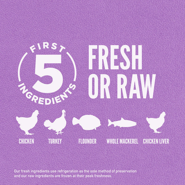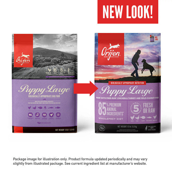 Shop / ORIJEN / ORIJEN Puppy Large Breed Dry Dog Food ORIJEN Puppy Large Breed Dry Dog Food ORIJEN Weight: 23.5 lb $105.99 23.5-lb Purchase Options Free In-Store Pick Up Not Available Save 10% on orders $49+ Set your store for inventory and store pickup details Zip Code Search Same-day Delivery* No minimum charge for delivery orders. *Order before 2pm and have it delivered today. Orders placed after 2pm will be delivered the next day. Must be inside delivery radius. Zip Code Unfortunately delivery is not available to this address. In order to ensure the best availability accuracy, changing your selected store will remove all items from your cart. You will need to re-add these items with your newly selected store if you choose to continue. Continue Cancel Ship it to Me Quantity Add To Cart Feeding guide disclaimer ✕ Feeding guides provide a starting point for the amount of food to give your pet each day. We recommend that you keep your pet in ideal body condition and not allow them to become overweight. The amount of food your pet needs can vary based on age, activity level or other food and treats given, so be sure to work with your veterinarian to determine an appropriate weight for your pet, and to make any necessary adjustments to their feeding. Information All large breed puppies do best on a Biologically Appropriate diet: one that is rich in protein and fat from quality animal ingredients to support peak development. ORIJEN® Puppy Large recipe is packed with 85%* quality animal ingredients like fresh or raw+ free-run chicken and turkey**, wild-caught fish, and cage-free eggs. With rich inclusions of Wholeprey animals, ORIJEN dog food is made with the most nutrient-dense, succulent parts of the prey to deliver the nutrition dogs need. The result is a diet for your canine companion that is beyond comparison. Ingredients Chicken, turkey, flounder, whole mackerel, chicken liver, turkey giblets (liver, heart, gizzard), whole herring, eggs, dehydrated chicken, dehydrated turkey, dehydrated mackerel, dehydrated chicken liver, dehydrated egg, whole red lentils, whole pinto beans, whole peas, lentil fiber, whole green lentils, whole navy beans, natural chicken flavor, whole chickpeas, pollock oil, chicken fat, chicken heart, pea starch, dehydrated pumpkin, salt, vitamin E supplement, whole pumpkin, whole butternut squash, collard greens, whole apples, whole pears, whole cranberries, dried kelp, zinc proteinate, mixed tocopherols (preservative), taurine, thiamine mononitrate, calcium pantothenate, copper proteinate, dried chicory root, turmeric, sarsaparilla root, althea root, rosehips, juniper berries, citric acid (preservative), rosemary extract, dried Lactobacillus acidophilus fermentation product, dried Bifidobacterium animalis fermentation product, dried Lactobacillus casei fermentation product. Guaranteed Analysis Nutrient Guaranteed Units Crude Protein 38% min Crude Fat 16% min Crude Fiber 6% max Moisture 12% max Calcium 1.2% min Phosphorus 1% min Omega-6 Fatty Acids 3% min Omega-3 Fatty Acids 0.8% min DHA & EPA 0.2% min Glucosamine 600 mg/kg min Total Microorganisms 1 Million CFU/lb Customers also liked Customer Reviews