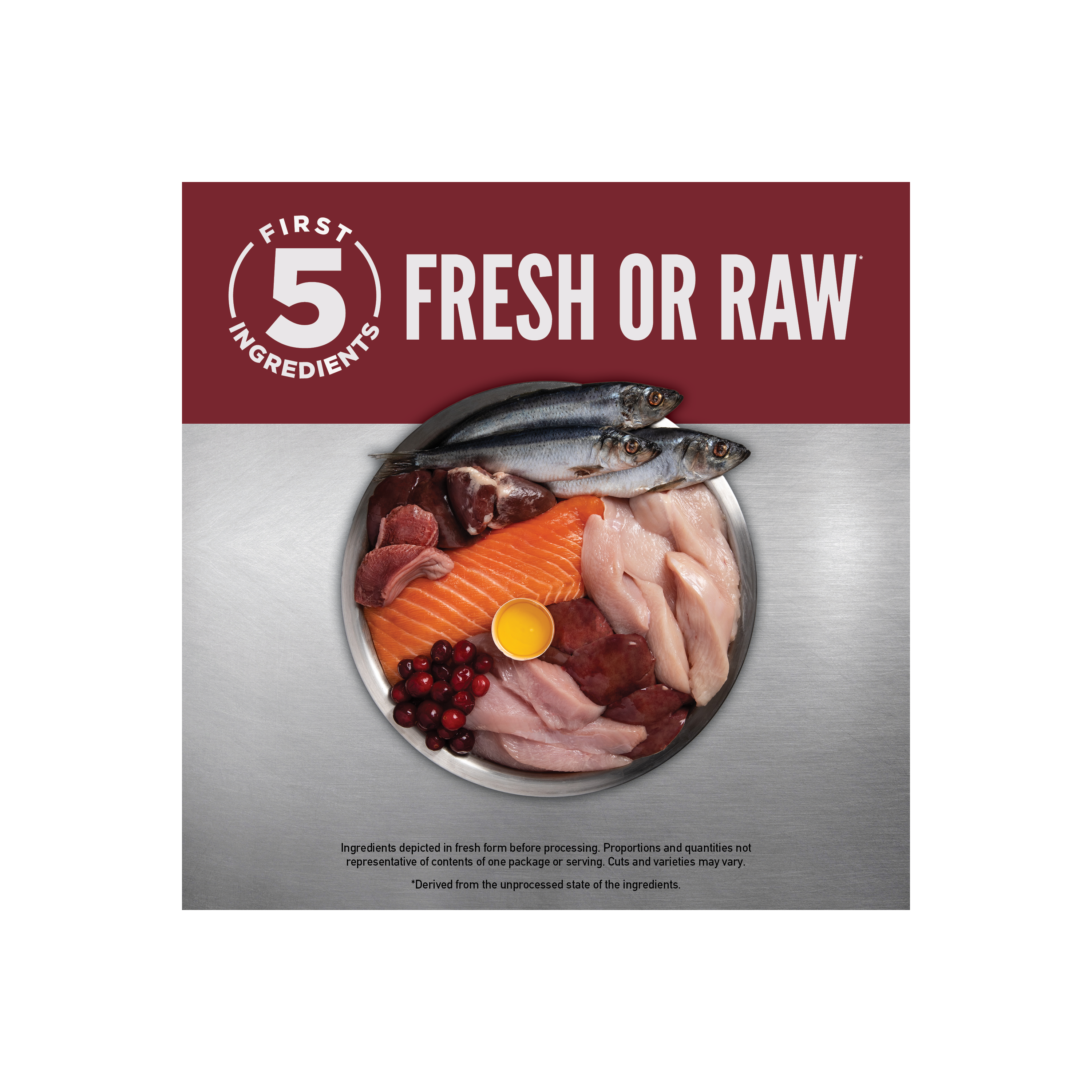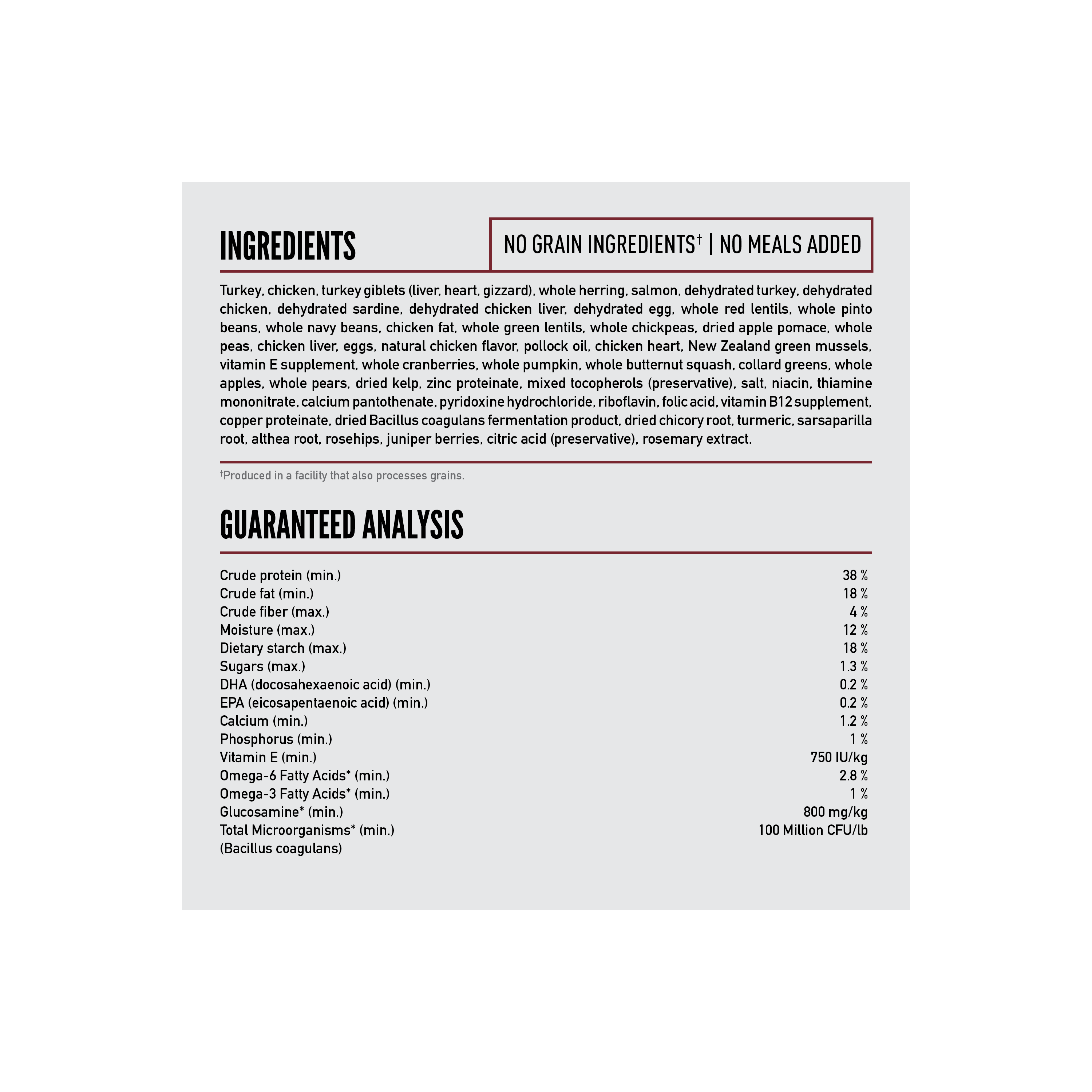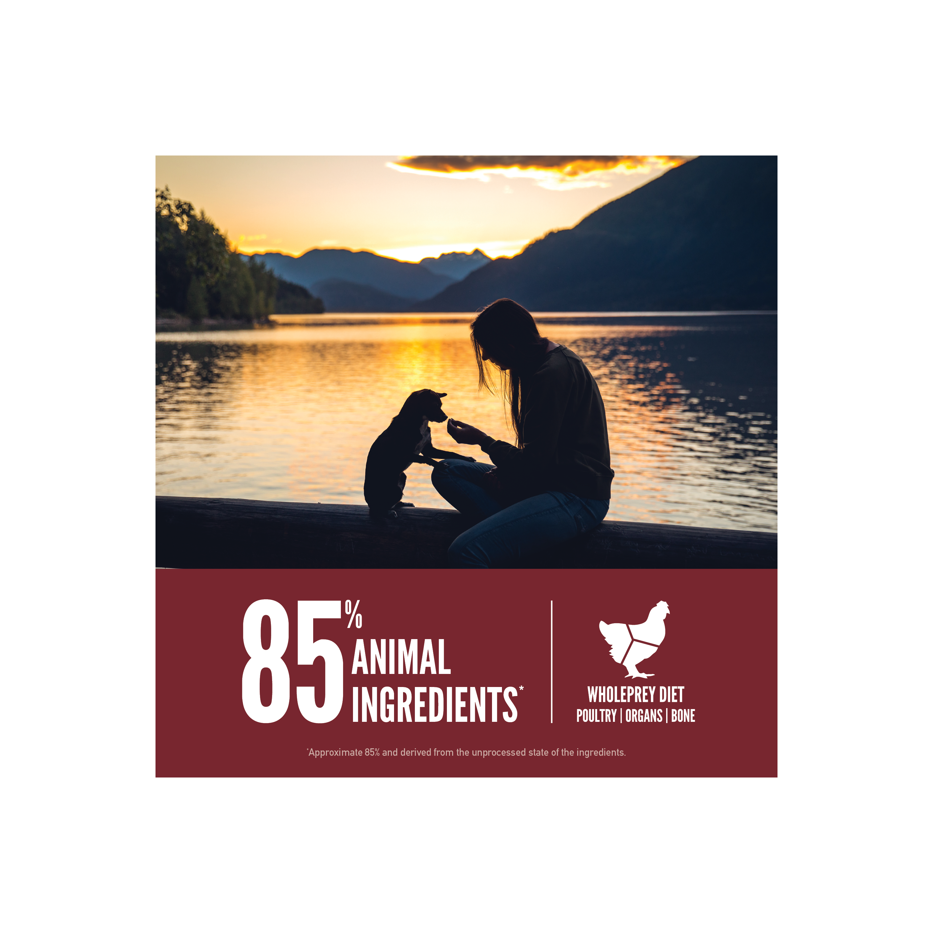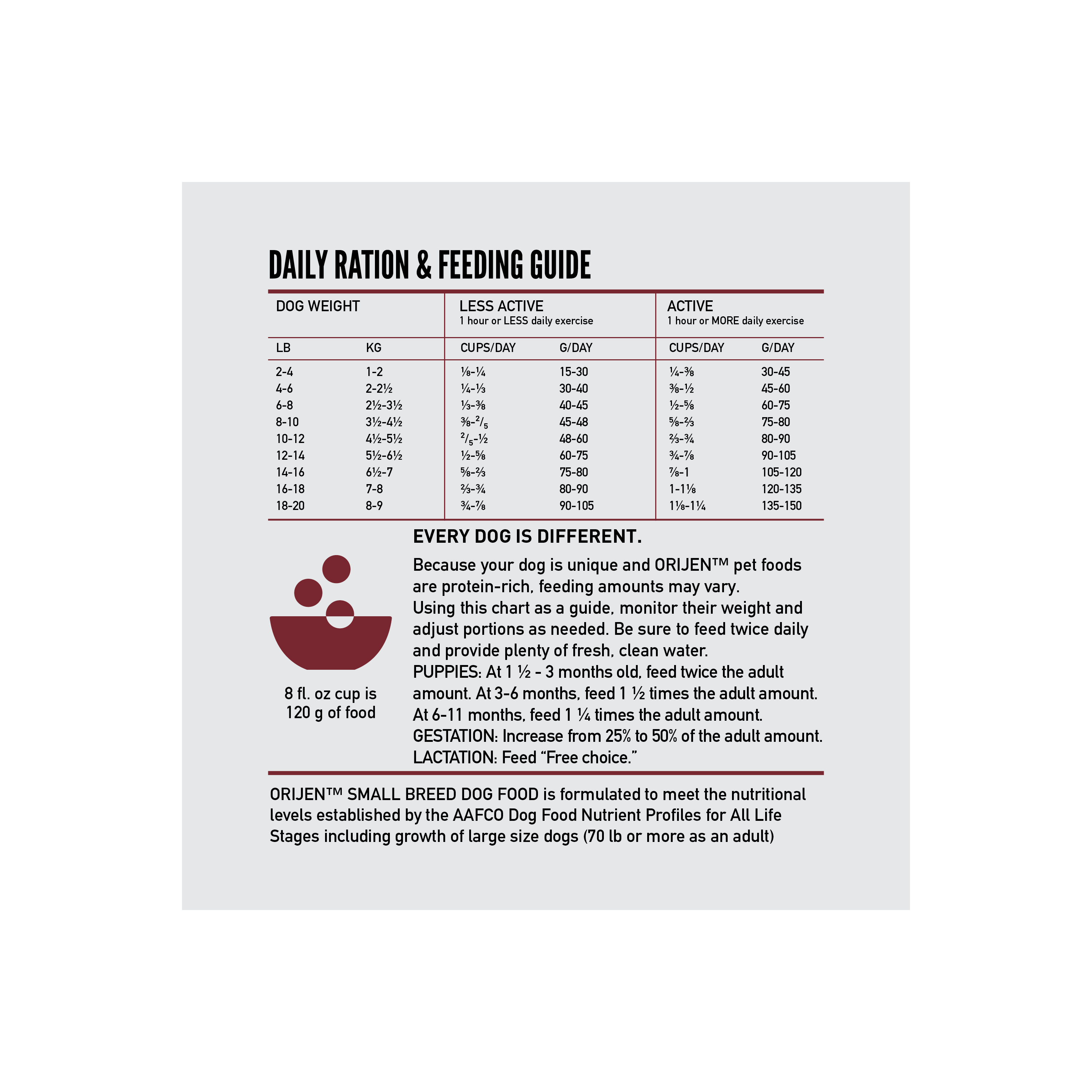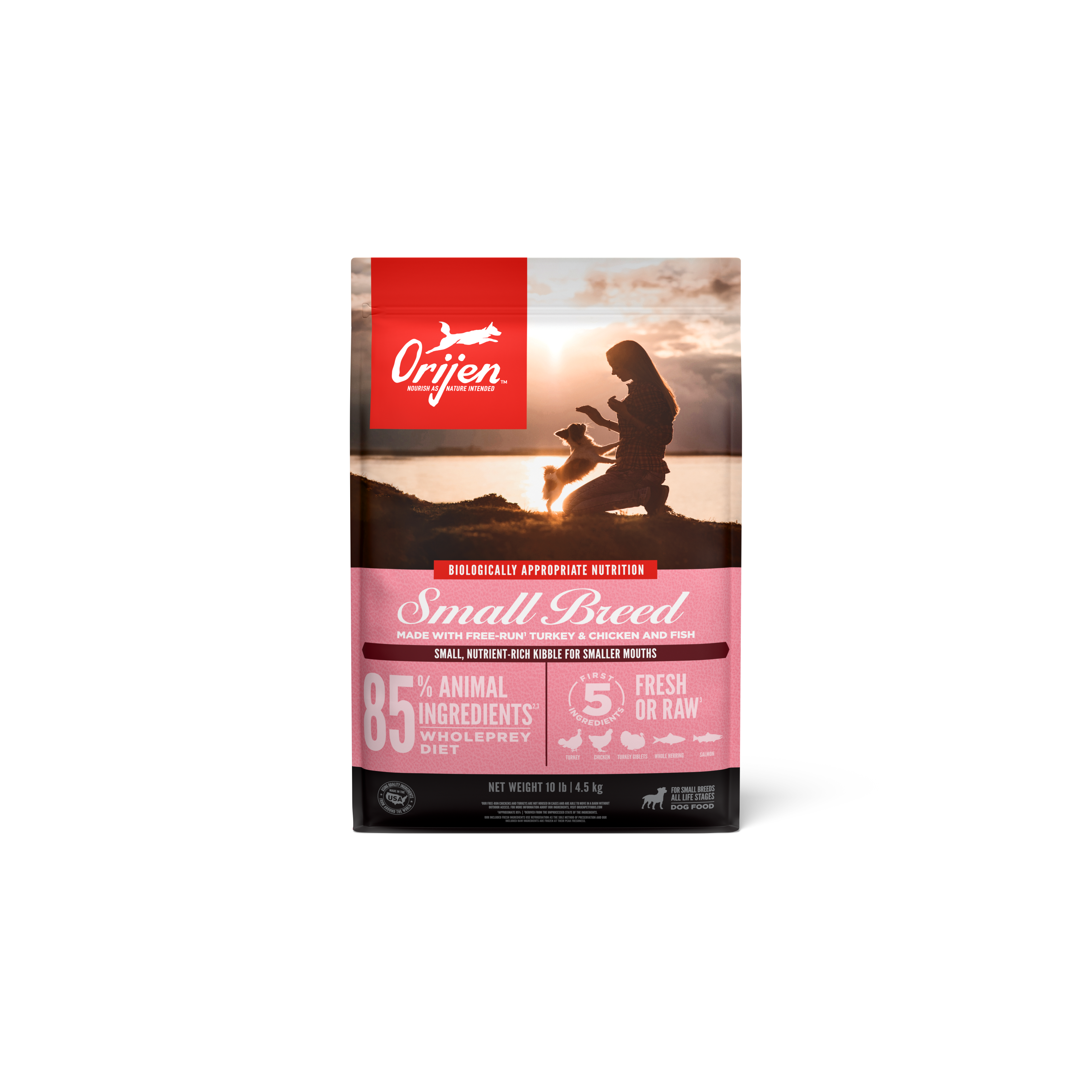 Shop / ORIJEN / ORIJEN Small Breed Dog 10LB ORIJEN Small Breed Dog 10LB ORIJEN 10 LB $62.99 10 LB Purchase Options Free In-Store Pick Up Not Available Save 20% on orders $100+ Set your store for inventory and store pickup details Zip Code Search Same-day Delivery* No minimum charge for delivery orders. *Order before 2pm and have it delivered today. Orders placed after 2pm will be delivered the next day. Must be inside delivery radius. Zip Code Unfortunately delivery is not available to this address. In order to ensure the best availability accuracy, changing your selected store will remove all items from your cart. You will need to re-add these items with your newly selected store if you choose to continue. Continue Cancel Ship it to Me Quantity Add To Cart Feeding guide disclaimer ✕ Feeding guides provide a starting point for the amount of food to give your pet each day. We recommend that you keep your pet in ideal body condition and not allow them to become overweight. The amount of food your pet needs can vary based on age, activity level or other food and treats given, so be sure to work with your veterinarian to determine an appropriate weight for your pet, and to make any necessary adjustments to their feeding. Information Help your small breed dog thrive with the power of protein-rich ORIJEN Small Breed Dry Dog Food. This ORIJEN grain free* dry dog food is made specifically for your small dog to meet their nutritional needs with nourishing protein and nutrients packed into a unique dog food kibble shape that's easier for them to eat. With a Biologically Appropriate recipe, this grain free* dog food for small dogs is based on what your canine's ancestors consumed in the wild. Containing 85 percent** animal ingredients, ORIJEN dog food provides a high protein diet that will nourish a lifetime of adventures. The first five ingredients of this high protein dog food are fresh or raw poultry and fish ingredients, including turkey, chicken, turkey giblets, quail, whole blue whiting, giving your small dog a strong source of protein, vitamins and minerals. ORIJEN WholePrey ingredients including nourishing organs provide your dog with the most succulent and nutrient-rich parts of prey, and the freeze dried coating provides a burst of flavor dogs instinctively crave. Our included fresh ingredients are delivered refrigerated and our included raw ingredients are delivered frozen. NOURISH AS NATURE INTENDED. *Produced in a facility that also processes grains **Approximate 85%, derived from unprocessed state of the ingredients One (1) 4 lb bag of ORIJEN Small Breed Grain Free* Dry Dog Food ORIJEN grain free* dog food for small dogs is tailored to meet the nutritional needs of your small dog with a unique kibble shape that's easier to eat Grain free* dog food containing 85 percent** animal ingredients, including WholePrey ingredients like nourishing organs to mimic what your dog's ancestors consumed in the wild First five ingredients are fresh or raw poultry and fish, so your dog can get a high protein dog food with the protein, vitamins and minerals they need Dry dog food kibble is made in the USA with quality ingredients from around the world; no soy, corn, tapioca or wheat ingredients are added in our kitchen Ingredients Turkey, chicken, turkey giblets (liver, heart, gizzard), whole herring, salmon, dehydrated turkey, dehydrated chicken, dehydrated sardine, dehydrated chicken liver, dehydrated egg, whole red lentils, whole pinto beans, whole navy beans, chicken fat, whole green lentils, whole chickpeas, dried apple pomace, whole peas, chicken liver, eggs, natural chicken flavor, pollock oil, chicken heart, New Zealand green mussels, vitamin E supplement, whole cranberries, whole pumpkin, whole butternut squash, collard greens, whole apples, whole pears, dried kelp, zinc proteinate, mixed tocopherols (preservative), salt, niacin, thiamine mononitrate, calcium pantothenate, pyridoxine hydrochloride, riboflavin, folic acid, vitamin B12 supplement, copper proteinate, dried Bacillus coagulans fermentation product, dried chicory root, turmeric, sarsaparilla root, althea root, rosehips, juniper berries, citric acid (preservative), rosemary extract. Guaranteed Analysis Crude protein 38% min, Crude fat 18% min, Crude fiber 4% max, Moisture 12% max, Dietary starch 18% max, Sugars 1.3% max, DHA (docosahexaenoic acid) 0.2% min, EPA (eicosapentaenoic acid) 0.2% min, Calcium 1.2% min, Phosphorus 1% min, Omega-6 fatty acids* 2.8% min, Omega-3 fatty acids* 1.0% min, Glucosamine* 800 mg/kg min, total Microorganisms* 100 Million CFU/lb, (Bacillus coagulans), Vitamin E (min) 500 IU/kg *Not recognized as an essential nutrient by the AAFCO Dog Food Nutrient Profiles. Customers also liked Customer Reviews