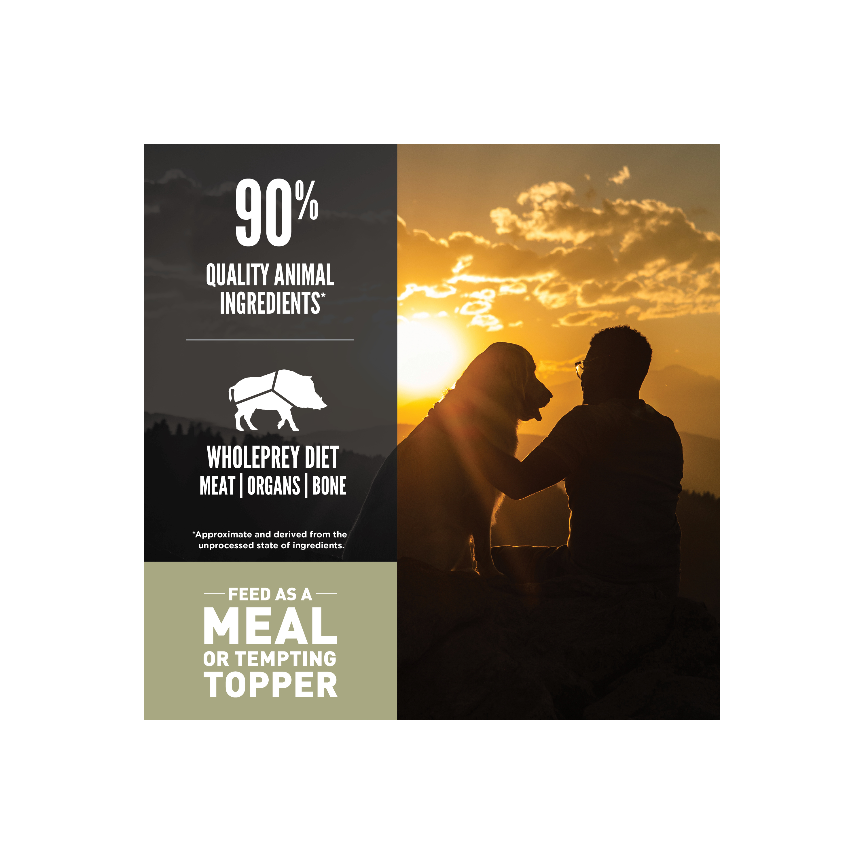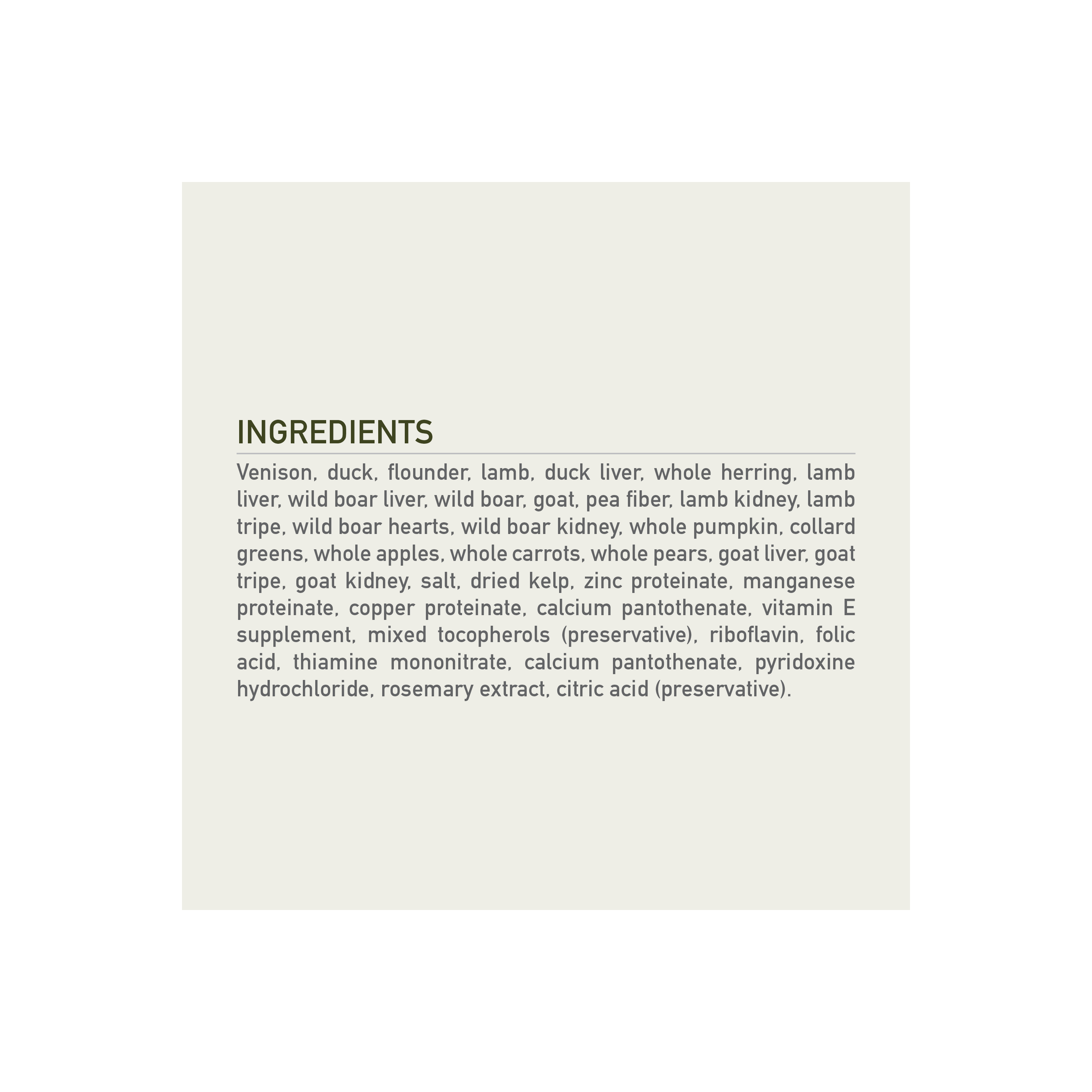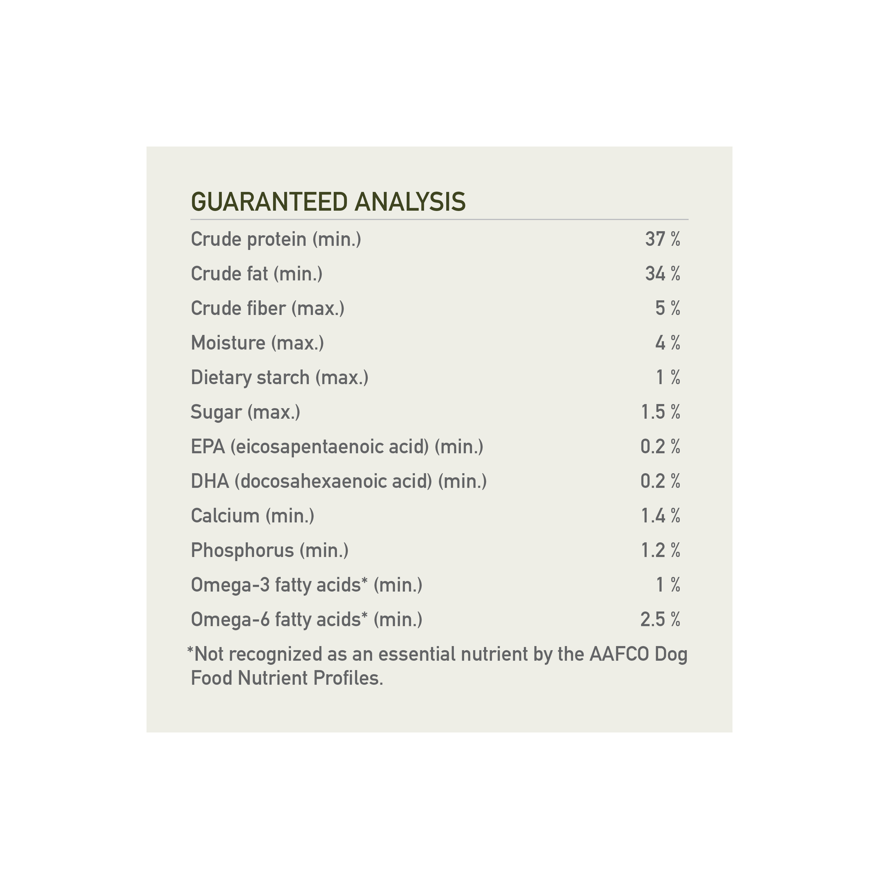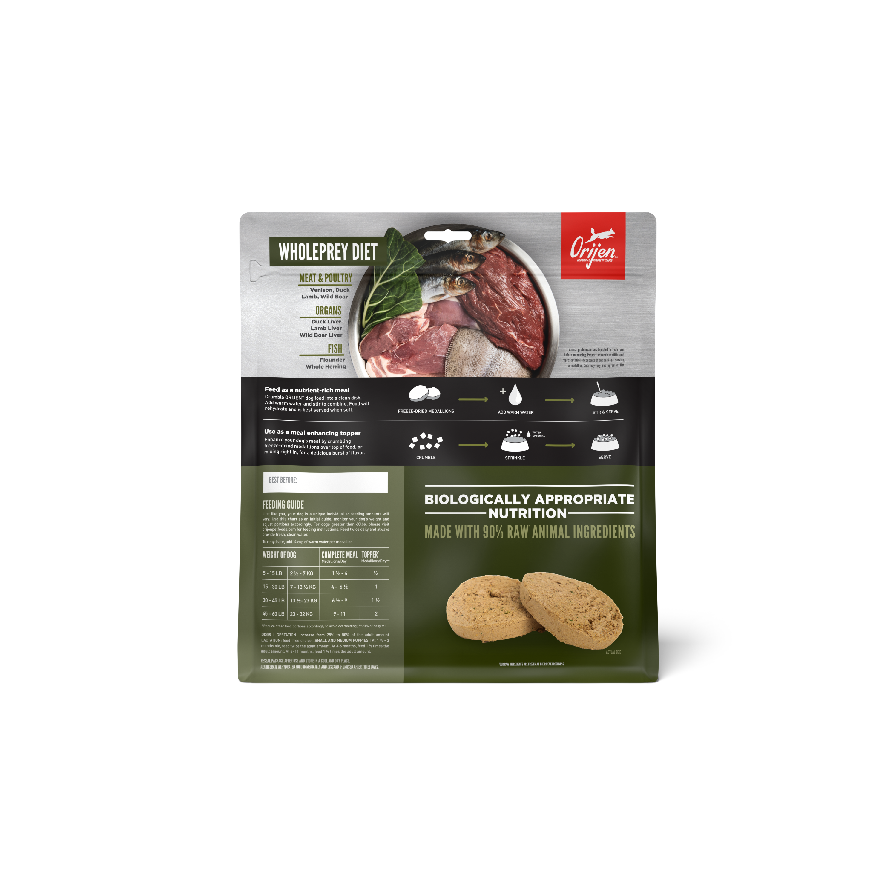 Shop / ORIJEN / ORIJEN Tundra Freeze-Dried Food 6OZ ORIJEN Tundra Freeze-Dried Food 6OZ ORIJEN 6 OZ $22.99 6 OZ Purchase Options Free In-Store Pick Up Not Available Save 20% on orders $100+ Set your store for inventory and store pickup details Zip Code Search Same-day Delivery* No minimum charge for delivery orders. *Order before 2pm and have it delivered today. Orders placed after 2pm will be delivered the next day. Must be inside delivery radius. Zip Code Unfortunately delivery is not available to this address. In order to ensure the best availability accuracy, changing your selected store will remove all items from your cart. You will need to re-add these items with your newly selected store if you choose to continue. Continue Cancel Ship it to Me Quantity Add To Cart Feeding guide disclaimer ✕ Feeding guides provide a starting point for the amount of food to give your pet each day. We recommend that you keep your pet in ideal body condition and not allow them to become overweight. The amount of food your pet needs can vary based on age, activity level or other food and treats given, so be sure to work with your veterinarian to determine an appropriate weight for your pet, and to make any necessary adjustments to their feeding. Information Help your dog thrive with the power of protein-rich ORIJEN TUNDRA Freeze Dried Medallions. This ORIJEN freeze dried dog food and topper is a concentrated source of animal protein that's freeze dried to lock in the rich nutrients and flavor of raw animal ingredients. With a Biologically Appropriate recipe, this high protein dog food is based on what your canine's ancestors consumed in the wild. Containing up to 90 percent quality animal ingredients*, ORIJEN grain free** freeze dried dog food provides a high protein diet that will nourish a lifetime of adventures. Ingredients include venison, duck, wild-caught flounder, whole herring, lamb, wild boar and goat, giving your dog a strong source of protein, vitamins and minerals. ORIJEN WholePrey ingredients including organs and bones provide your dog with the most succulent and nutrient-rich parts of prey. Serve this dog food as a nutrient-rich meal by adding warm water and stirring or enhance your dog's favorite meal by crumbling ORIJEN TUNDRA freeze dried medallions and using them as a dog food topper. Our included fresh ingredients are delivered refrigerated and our included raw ingredients are delivered frozen. *Approximate 90%, and derived from the unprocessed state of the ingredients. **Produced in a facility that also processes grains One (1) 16 oz bag of ORIJEN TUNDRA Freeze Dried Medallions Dog Food & Topper ORIJEN freeze dried dog food is a concentrated source of animal protein that can be served as a meal or used as a dog food topper Grain free** freeze dried dog food containing up to 90 percent quality animal ingredients*, including WholePrey ingredients like bones and organs to mimic what your dog's ancestors consumed in the wild Freeze dried dog food medallions lock in the rich nutrients and flavor of raw animal ingredients for a taste dogs instinctively crave ORIJEN dog food is made in the USA using quality ingredients from around the world Ingredients Venison, duck, flounder, lamb, duck liver, whole herring, lamb liver, wild boar liver, wild boar, goat, pea fiber, lamb kidney, lamb tripe, wild boar hearts, wild boar kidney, whole pumpkin, collard greens, whole apples, whole carrots, whole pears, goat liver, goat tripe, goat kidney, salt, dried kelp, zinc proteinate, manganese proteinate, copper proteinate, calcium pantothenate, vitamin E supplement, mixed tocopherols (preservative), riboflavin, folic acid, thiamine mononitrate, calcium pantothenate, pyridoxine hydrochloride, rosemary extract, citric acid (preservative). Guaranteed Analysis Crude protein (min.) 37%Crude fat (min.) 34%Crude fiber (max.) 5%Moisture (max.) 4%Ash (max.) 9%Dietary starch (max.) 1%Sugars (max.) 1.5%EPA (eicosapentaenoic acid) (min.) 0.2%DHA (docosahexaenoic acid) (min.) 0.2%Calcium (min.) 1.4%Phosphorus (min.) 1.2%Magnesium (min.) ‰ÛÒ cat only %Taurine (min.) ‰ÛÒ cat only %Omega-3 fatty acids* (min.) 1.0%Omega-6 fatty acids* (min.) 2.5%Glucosamine* (min.) %Chondroitin sulfate* (min.) % Customers also liked Customer Reviews