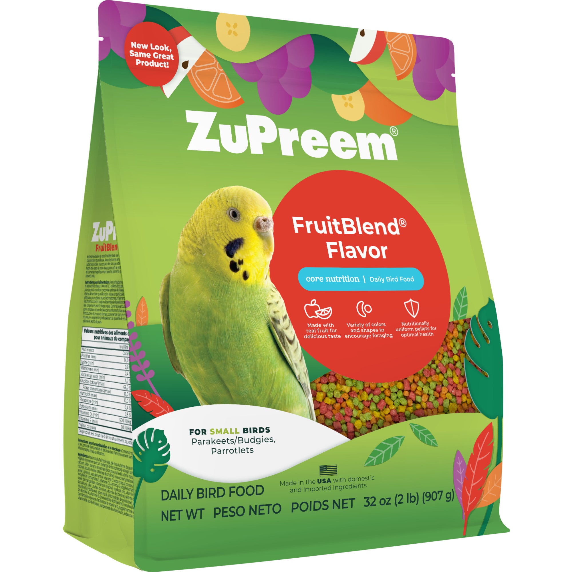 Shop / Pet Bird Food / Zupreem FruitBlend Flavor with Natural Fruit Flavors Small Bird Food 2lb- Parakeets, Budgies, Parrotlets Zupreem FruitBlend Flavor with Natural Fruit Flavors Small Bird Food 2lb- Parakeets, Budgies, Parrotlets Zupreem 2lb $15.99 2lb Purchase Options Free In-Store Pick Up Not Available Save 10% on orders $49+ Set your store for inventory and store pickup details Zip Code Search Same-day Delivery* No minimum charge for delivery orders. *Order before 2pm and have it delivered today. Orders placed after 2pm will be delivered the next day. Must be inside delivery radius. Zip Code Unfortunately delivery is not available to this address. In order to ensure the best availability accuracy, changing your selected store will remove all items from your cart. You will need to re-add these items with your newly selected store if you choose to continue. Continue Cancel Ship it to Me Quantity Add To Cart Feeding guide disclaimer ✕ Feeding guides provide a starting point for the amount of food to give your pet each day. We recommend that you keep your pet in ideal body condition and not allow them to become overweight. The amount of food your pet needs can vary based on age, activity level or other food and treats given, so be sure to work with your veterinarian to determine an appropriate weight for your pet, and to make any necessary adjustments to their feeding. Information ZuPreem FruitBlend Flavor with Natural Flavors is one of the most popular pelleted pet bird foods in the U.S! FruitBlend contains natural flavors your bird will love and helps support a healthy daily food program. FruitBlend contains 21 essential vitamins and minerals birds need daily and is suitable for small pet birds. HEALTHY BIRD FOOD ‰ÛÒ Healthy and delicious nutrition for every day feeding for Parakeets, Budgies, Parrotlets and other small birds that prefer this pellet size. MADE WITH NATURAL FRUIT FLAVOR ‰ÛÒ Your bird will love this tasty, fruit-tastic bird food. DAILY FEED FOR SMALL BIRDS ‰ÛÒ Take the guesswork out of meeting your small bird‰۪s nutritional needs with a healthy, complete diet like FruitBlend. Veterinarian recommended. Made in the USA. FRUIT BASED ‰ÛÒ This food contains fruit and natural fruit flavors including bananas, apples, oranges, and grapes. Even picky birds love FruitBlend! 100% GUARANTEE ‰ÛÒ FruitBlend is so good we back it up with a 100% guarantee! Ingredients: Ground corn, Soybean meal, Ground wheat, Wheat germ meal, Sugar, Vegetable oil (preserved with mixed tocopherols), Oranges, Apples, Grapes, Bananas, Calcium carbonate, Dicalcium phosphate, Iodized salt, Natural flavors, DL-Methionine, Choline chloride, L-Lysine monohydrochloride, Vitamins (Vitamin E supplement, Niacin supplement, Biotin, d-Calcium pantothenate, Riboflavin supplement, Pyridoxine hydrochloride, Thiamine mononitrate, Vitamin A acetate, Vitamin D3 supplement, Menadione sodium bisulfite complex (source of Vitamin K activity), Vitamin B12 supplement, Folic acid), Citric acid (preservative), Mixed tocopherols (preservative), Yellow 5, L-ascorbyl-2-polyphosphate, Red 40, Yellow 6, Minerals (Manganous oxide, Zinc oxide, Copper sulfate, Sodium selenite, Calcium iodate), Color added, Blue 1 Guaranteed Anlysis: Crude Protein, min 14%; Crude Fat, min 4%; Crude Fiber, max 3.5%; Moisture, max 10%; Lysine, min 0.8%; Methionine, min 0.4%; Potassium, min 0.5%; Vitamin D, min 500 IU/kg (225 IU/lb); Vitamin E, min 60 IU/kg (25 IU/lb) Customers also liked Customer Reviews