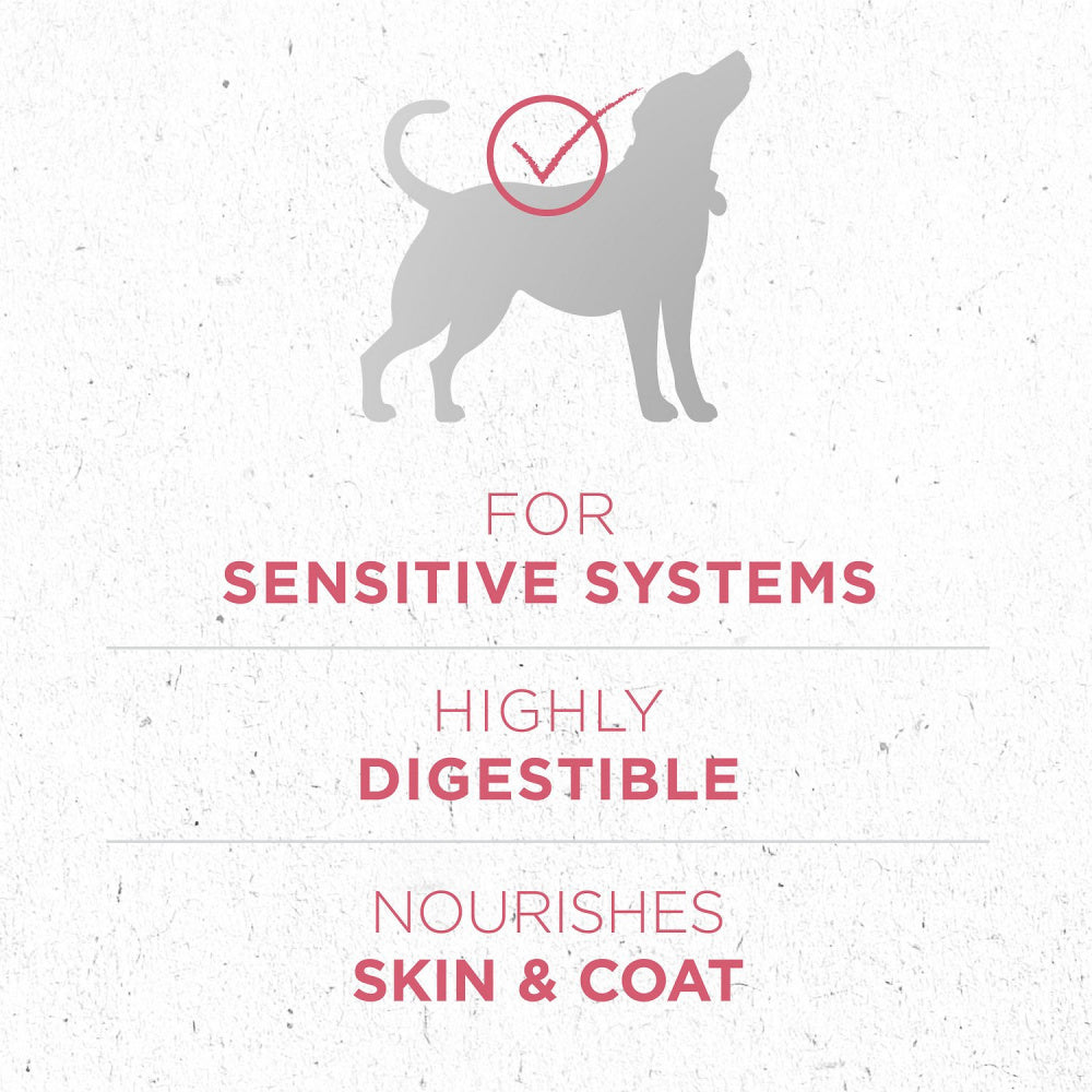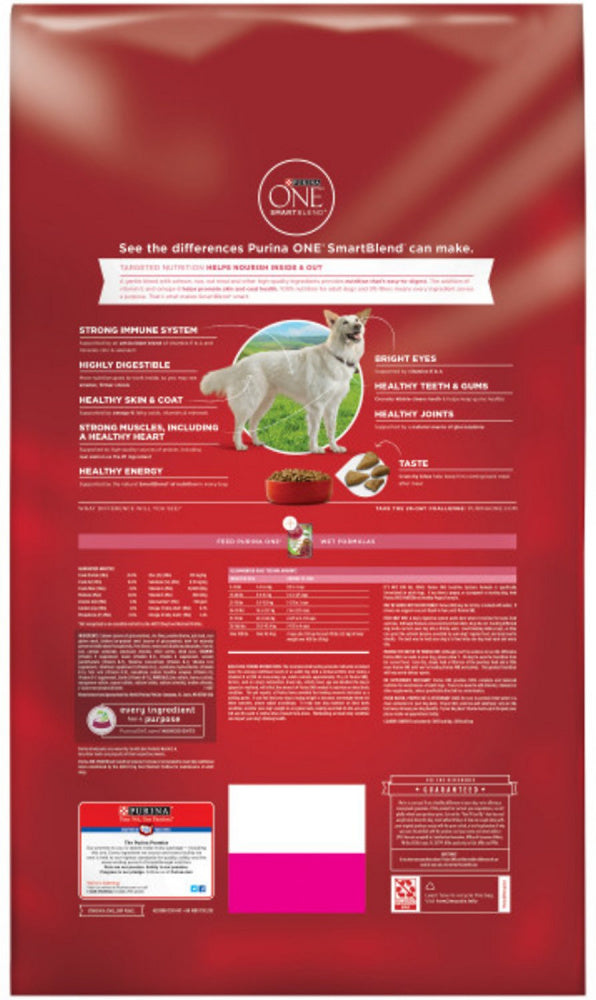 Shop / Purina ONE / Purina ONE SmartBlend Sensitive Stomach Dry Dog Food Purina ONE SmartBlend Sensitive Stomach Dry Dog Food Purina ONE $31.99 16.5 lb 31.1 lb 16.5-lb 31.1-lb Purchase Options Free In-Store Pick Up Not Available Save 10% on orders $49+ Set your store for inventory and store pickup details Zip Code Search Same-day Delivery* No minimum charge for delivery orders. *Order before 2pm and have it delivered today. Orders placed after 2pm will be delivered the next day. Must be inside delivery radius. Zip Code Unfortunately delivery is not available to this address. In order to ensure the best availability accuracy, changing your selected store will remove all items from your cart. You will need to re-add these items with your newly selected store if you choose to continue. Continue Cancel Ship it to Me Quantity Add To Cart Feeding guide disclaimer ✕ Feeding guides provide a starting point for the amount of food to give your pet each day. We recommend that you keep your pet in ideal body condition and not allow them to become overweight. The amount of food your pet needs can vary based on age, activity level or other food and treats given, so be sure to work with your veterinarian to determine an appropriate weight for your pet, and to make any necessary adjustments to their feeding. Information Give your furry friend wholesome goodness that's gentle on his tummy with Purina ONE SmartBlend Skin & Coat Formula Adult Premium Dry Dog Food. Specially formulated for dogs with sensitive systems, this high-protein dog food offers 100% nutrition and 0% fillers. Real salmon is the #1 ingredient, along with easy-to-digest rice and oatmeal and no artificial colors, flavors or preservatives. Every serving is loaded with protein to support your pooch's strong muscles, including his healthy heart. Plus, this crunchy dog kibble supports sensitive skin with vitamin E and omega-6 fatty acids and has natural sources of glucosamine to promote his healthy joints as he runs and plays. Best of all, dogs love the taste of this Purina sensitive stomach dog food. The crunchy texture even helps keep his teeth clean and his breath fresh! Ingredients Salmon (Source Of Glucosamine), Rice Flour, Pearled Barley, Oat Meal, Corn Gluten Meal, Chicken By-Product Meal (Source Of Glucosamine), Beef Fat Naturally Preserved With Mixed-Tocopherols, Liver Flavor, Mono And Dicalcium Phosphate, Fish Oil, Salt, Calcium Carbonate, Potassium Chloride, Dried Carrots, Dried Peas, Vitamins [Vitamin E Supplement, Niacin (Vitamin B-3), Vitamin A Supplement, Calcium Pantothenate (Vitamin B-5), Thiamine Mononitrate (Vitamin B-1), Vitamin B-12 Supplement, Riboflavin Supplement (Vitamin B-2), Pyridoxine Hydrochloride (Vitamin B-6), Folic Acid (Vitamin B-9), Menadione Sodium Bisulfite Complex (Vitamin K), Vitamin D-3 Supplement, Biotin (Vitamin B-7)], Minerals [Zinc Sulfate, Ferrous Sulfate, Manganese Sulfate, Copper Sulfate, Calcium Iodate, Sodium Selenite], Choline Chloride, L-Lysine Monohydrochloride Guaranteed Analysis Nutrient Guaranteed Units Crude Protein 26.0% min Crude Fat 16.0% min Crude Fiber 3.0% max Moisture 12.0% max Linoleic Acid 1.4% min Calcium 1.0% min Phosphorus 0.8% min Zinc 150 ppm min Selenium 0.35 ppm min Vitamin A 14,000 IU/kg min Vitamin E 450 IU/kg min Glucosamine 350 ppm min Omega-3 Fatty Acids 0.7% min Omega-6 Fatty Acids 1.6% min Customers also liked Customer Reviews