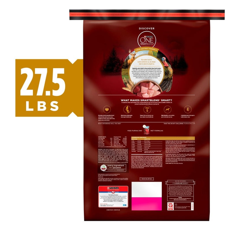 Shop / Purina ONE / Purina ONE SmartBlend True Instinct Real Turkey & Venison Adult Premium Dry Dog Food Purina ONE SmartBlend True Instinct Real Turkey & Venison Adult Premium Dry Dog Food Purina ONE Weight: 27.5 lb $51.99 27.5-lb Purchase Options Free In-Store Pick Up Not Available Save 10% on orders $49+ Set your store for inventory and store pickup details Zip Code Search Same-day Delivery* No minimum charge for delivery orders. *Order before 2pm and have it delivered today. Orders placed after 2pm will be delivered the next day. Must be inside delivery radius. Zip Code Unfortunately delivery is not available to this address. In order to ensure the best availability accuracy, changing your selected store will remove all items from your cart. You will need to re-add these items with your newly selected store if you choose to continue. Continue Cancel Ship it to Me Quantity Add To Cart Feeding guide disclaimer ✕ Feeding guides provide a starting point for the amount of food to give your pet each day. We recommend that you keep your pet in ideal body condition and not allow them to become overweight. The amount of food your pet needs can vary based on age, activity level or other food and treats given, so be sure to work with your veterinarian to determine an appropriate weight for your pet, and to make any necessary adjustments to their feeding. Information Give your dog the nutrition he needs while satisfying his true instincts when you serve Purina ONE SmartBlend True Instinct With a Natural Blend Of Real Turkey & Venison adult dry dog food. This natural pet food plus vitamins and minerals features a blend of real turkey and venison and other high-quality ingredients to provide the protein active adult dogs need and the nutrient-dense nutrition dogs crave. Crunchy kibble and double the meaty morsels compared to our Purina ONE Lamb & Rice formula help to make mealtime even more enjoyable, and the highly-digestible formula lets more nutrition go to work inside your dog. Along with 30% protein in every serving, this dog food provides a natural source of glucosamine to help support your dog's healthy joints so he can maintain his active lifestyle. Nature plus science helps provide 100% complete and balanced nutrition to support an adult dog's whole-body health, giving you a smart solution for tending to your dog's nutritional needs. Make Purina ONE SmartBlend True Instinct Natural With a Natural Blend Of Real Turkey & Venison adult dry dog food your dog's daily nutrition, and give him a nutrient-dense meal option he instinctively craves in a natural formula plus vitamins and minerals. Four antioxidant sources help support his immune system, and omega-6 fatty acids in every serving of this food for dogs support his healthy skin and radiant coat. Natural sources of glucosamine help support your dog's joint health so he can keep up with his daily adventures. With a combination of meaty morsels and crunchy bites, this dry dog food delivers the textures your dog wants in his dish. We craft this recipe without chicken by-product meal and artificial flavors or preservatives, and 0% fillers means that every high-quality ingredient has a purpose. Give Purina One SmartBlend True Instinct With a Natural Blend of Real Turkey & Venison formula to your adult dog as his daily meal, combining nature plus research to help provide him with 100% complete and balanced nutrition, and also try our wet dog foods for more variety. Making sure your dog gets the high-quality, nourishing meals he deserves is important to you, and that makes it important to us. We formulate this recipe to meet or exceed AAFCO standards for health and safety, and every batch undergoes rigorous checks for quality and safety throughout each step of the manufacturing process. We know you care about where his meals come from, which is why Purina ONE pet foods are proudly manufactured in our Purina-owned U.S. facilities. Backed by Purina's more than 90 years of innovation, Purina ONE is a brand we are proud to produce for your dog. Offer him Purina ONE SmartBlend True Instinct With a Natural Blend of Real Turkey & Venison adult dry dog food at mealtime, and give him the nourishment he needs in a formula he'll get excited about. Ingredients Turkey (Source Of Glucosamine), Corn Gluten Meal, Soy Flour, Beef Fat Naturally Preserved With Mixed-Tocopherols, Chicken Meal (Source Of Glucosamine), Whole Grain Wheat, Whole Grain Corn, Soy Flakes, Rice Flour, Corn Germ Meal, Glycerin, Venison, Oat Meal, Liver Flavor, Calcium Carbonate, Mono And Dicalcium Phosphate, Salt, Caramel Color, Vitamins [Vitamin E Supplement, Niacin (Vitamin B-3), Vitamin A Supplement, Calcium Pantothenate (Vitamin B-5), Thiamine Mononitrate (Vitamin B-1), Vitamin B-12 Supplement, Riboflavin Supplement (Vitamin B-2), Pyridoxine Hydrochloride (Vitamin B-6), Folic Acid (Vitamin B-9), Menadione Sodium Bisulfite Complex (Vitamin K), Vitamin D-3 Supplement, Biotin (Vitamin B-7)], Potassium Chloride, Minerals [Zinc Sulfate, Ferrous Sulfate, Manganese Sulfate, Copper Sulfate, Calcium Iodate, Sodium Selenite], Sulfur, Choline Chloride. Guaranteed Analysis Nutrient Guaranteed Units Crude Protein 30.0% min Crude Fat 17.0% min Crude Fiber 3.0% max Moisture 12.0% max Linoleic Acid 1.6% min Calcium 1.0% min Phosphorus 0.8% min Zinc 150 ppm min Selenium 0.35 ppm min Vitamin A 15,000 IU/kg min Vitamin E 460 IU/kg min Glucosamine 400 ppm min Omega-6 Fatty Acids 1.7% min Customers also liked Customer Reviews