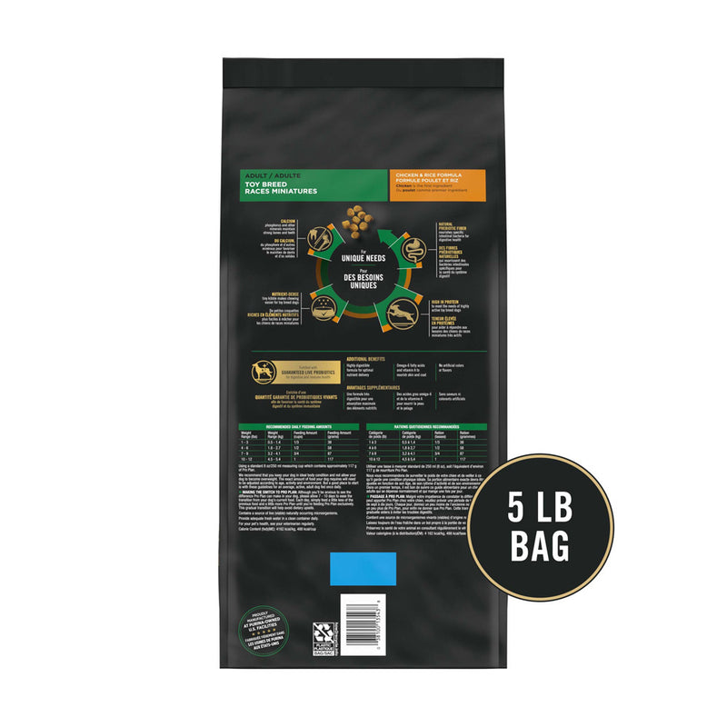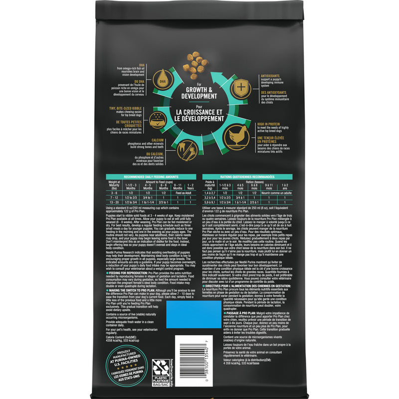 Shop / Purina Pro Plan / Purina Pro Plan Chicken & Rice Formula Toy Breed Dry Puppy Food Purina Pro Plan Chicken & Rice Formula Toy Breed Dry Puppy Food Purina Pro Plan Weight: 5 lb $19.99 5-lb Purchase Options Free In-Store Pick Up Not Available Save 10% on orders $49+ Set your store for inventory and store pickup details Zip Code Search Same-day Delivery* No minimum charge for delivery orders. *Order before 2pm and have it delivered today. Orders placed after 2pm will be delivered the next day. Must be inside delivery radius. Zip Code Unfortunately delivery is not available to this address. In order to ensure the best availability accuracy, changing your selected store will remove all items from your cart. You will need to re-add these items with your newly selected store if you choose to continue. Continue Cancel Ship it to Me Quantity Add To Cart Feeding guide disclaimer ✕ Feeding guides provide a starting point for the amount of food to give your pet each day. We recommend that you keep your pet in ideal body condition and not allow them to become overweight. The amount of food your pet needs can vary based on age, activity level or other food and treats given, so be sure to work with your veterinarian to determine an appropriate weight for your pet, and to make any necessary adjustments to their feeding. Information Nourish your growing toy breed puppy with Purina Pro Plan Brand Dog Food Puppy Toy Breed Chicken & Rice Formula dry puppy food. Formulated for puppies weighing under 10 pounds at maturity, this recipe helps to support his overall health and wellness through this important early life stage. High-quality protein, including real chicken as the first ingredient, provides some of the essential nutritional building blocks within your dog's body. Plus, tiny bite-sized pieces of crunchy kibble help to make chewing easier for your toy breed puppy. Including DHA from fish oil, this super-premium puppy food nourishes his brain and vision development, giving your little buddy a great start in life. The highly digestible dry formula promotes nutrient bioavailability to deliver optimal nutrient absorption so your puppy gets the most out of every bowlful. Ingredients Chicken, corn gluten meal, rice, poultry by-product meal, beef fat preserved with mixedtocopherols, whole grain corn, fish meal, dried egg product, corn germ meal, natural flavor, fish oil, potassium chloride, salt, soybean oil, calcium carbonate, mono and dicalcium phosphate, choline chloride, L-Lysine monohydrochloride, magnesium sulfate, MINERALS [zinc sulfate, ferrous sulfate, manganese sulfate, copper sulfate, calcium iodate, sodium selenite], VITAMINS [Vitamin E supplement, niacin (Vitamin B-3), Vitamin A supplement, calcium pantothenate (Vitamin B-5), thiamine mononitrate (Vitamin B-1), Vitamin B-12 supplement, riboflavin supplement (Vitamin B-2), pyridoxine hydrochloride (Vitamin B-6), folic acid (Vitamin B-9), menadione sodium bisulfite complex (Vitamin K), Vitamin D-3 supplement, biotin (Vitamin B-7)], DL-Methionine, dried Bacillus coagulans fermentation product, garlic oil Guaranteed Analysis Nutrient Guaranteed Units Crude Protein 34% min Crude Fat 20% min Crude Fiber 3% max Moisture 12% max Linoleic Acid 1.8% min DHA 0.1% min Calcium 1.1% min Phosphorus 0.9% min Vitamin A 15,000 IU/kg Vitamin E 100 IU/kg Omega-6 Fatty Acids 2.0% min Customers also liked Customer Reviews
