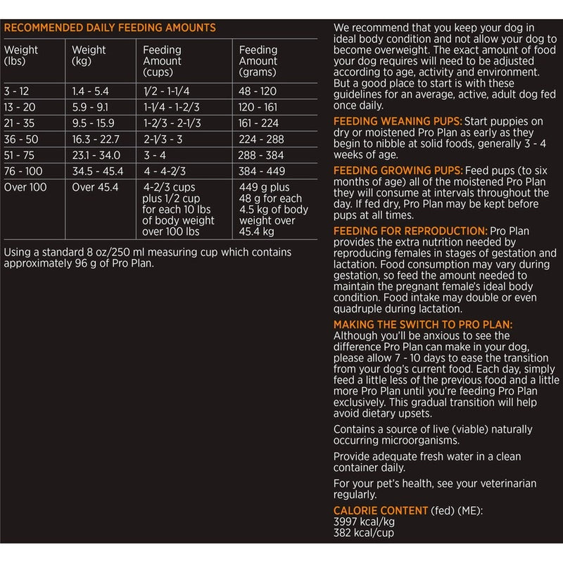 Shop / Purina Pro Plan / Purina Pro Plan Savor Adult Shredded Blend Chicken & Rice Formula Dry Dog Food Purina Pro Plan Savor Adult Shredded Blend Chicken & Rice Formula Dry Dog Food Purina Pro Plan $49.99 18 lb 35 lb 47 lb 18-lb 35-lb 47-lb Purchase Options Free In-Store Pick Up Not Available Save 10% on orders $49+ Set your store for inventory and store pickup details Zip Code Search Same-day Delivery* No minimum charge for delivery orders. *Order before 2pm and have it delivered today. Orders placed after 2pm will be delivered the next day. Must be inside delivery radius. Zip Code Unfortunately delivery is not available to this address. In order to ensure the best availability accuracy, changing your selected store will remove all items from your cart. You will need to re-add these items with your newly selected store if you choose to continue. Continue Cancel Ship it to Me Quantity Add To Cart Feeding guide disclaimer ✕ Feeding guides provide a starting point for the amount of food to give your pet each day. We recommend that you keep your pet in ideal body condition and not allow them to become overweight. The amount of food your pet needs can vary based on age, activity level or other food and treats given, so be sure to work with your veterinarian to determine an appropriate weight for your pet, and to make any necessary adjustments to their feeding. Information Shredded blend formula made with chicken as the first ingredient. Fortified with guaranteed live probiotics for digestive and immune health. And optimized protein-to-fat ratio to maintain an ideal body condition. Ingredients : Chicken, rice, whole grain wheat, poultry by-product meal (source of glucosamine), soybean meal, beef fat preserved with mixed-tocopherols, corn gluten meal, whole grain corn, dried egg product, fish meal (source of glucosamine), natural flavor, glycerin, wheat bran, calcium carbonate, mono and dicalcium phosphate, salt, soybean oil, potassium chloride, fish oil, MINERALS [zinc proteinate, manganese proteinate, ferrous sulfate, copper proteinate, calcium iodate, sodium selenite], VITAMINS [Vitamin E supplement, niacin (Vitamin B-3), Vitamin A supplement, calcium pantothenate (Vitamin B-5), thiamine mononitrate (Vitamin B-1), Vitamin B-12 supplement, riboflavin supplement (Vitamin B-2), pyridoxine hydrochloride (Vitamin B-6), folic acid (Vitamin B-9), Vitamin D-3 supplement, menadione sodium bisulfite complex (Vitamin K), biotin (Vitamin B-7)], choline chloride, L-ascorbyl-2-polyphosphate (Vitamin C), dried Bacillus coagulans fermentation product, L-Lysine monohydrochloride, garlic oil. Guaranteed Analysis Nutrient Guaranteed Units Crude Protein 26.0% min Crude Fat 16.0% min Crude Fiber 3.0% max Moisture 12.0% max Linoleic Acid 1.4% min Calcium 1.1% min Phosphorus 0.9% min Selenium 0.35 mg/kg min Vitamin A 15,000 IU/kg min Vitamin E 460 IU/kg min Ascorbic Acid (Vitamin C) 70 mg/kg min Glucosamine 400 ppm min Omega-6 Fatty Acids 1.5% min Customers also liked Customer Reviews