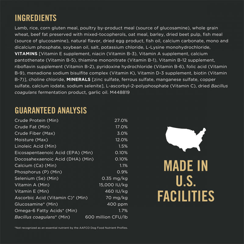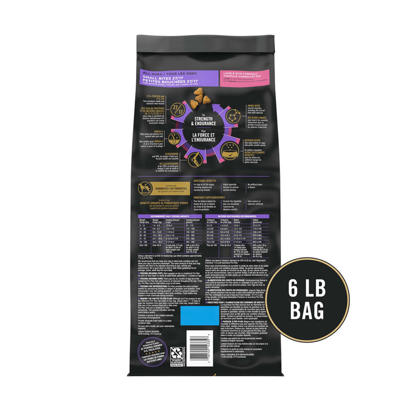 Shop / Purina Pro Plan / Purina Pro Plan Small Bites Lamb & Rice Formula High Protein, High Energy Dry Dog Food Purina Pro Plan Small Bites Lamb & Rice Formula High Protein, High Energy Dry Dog Food Purina Pro Plan Weight: 6 lb $19.99 6-lb Purchase Options Free In-Store Pick Up Not Available Save 10% on orders $49+ Set your store for inventory and store pickup details Zip Code Search Same-day Delivery* No minimum charge for delivery orders. *Order before 2pm and have it delivered today. Orders placed after 2pm will be delivered the next day. Must be inside delivery radius. Zip Code Unfortunately delivery is not available to this address. In order to ensure the best availability accuracy, changing your selected store will remove all items from your cart. You will need to re-add these items with your newly selected store if you choose to continue. Continue Cancel Ship it to Me Quantity Add To Cart Feeding guide disclaimer ✕ Feeding guides provide a starting point for the amount of food to give your pet each day. We recommend that you keep your pet in ideal body condition and not allow them to become overweight. The amount of food your pet needs can vary based on age, activity level or other food and treats given, so be sure to work with your veterinarian to determine an appropriate weight for your pet, and to make any necessary adjustments to their feeding. Information Give your dog targeted nutrition at every age with Purina Pro Plan Brand Dog Food Small Bites 27/17 Lamb & Rice Formula dry dog food. The nutrient-dense bite-sized kibble is designed for dogs who prefer eating smaller pieces, and rice and oatmeal offer easily digestible sources of energy. Each serving contains high-quality protein, including lamb as the first ingredient, and the antioxidant-rich formula helps to support your dog's healthy immune system. Real meat in this nutritious formula helps provide for your dog's protein needs. Formulated to provide specialized nutrition for an exceptional life, this Purina Pro Plan super-premium dry dog food follows your canine companion from his playful puppy years through adulthood. Offer up this tasty food for dogs to give your best buddy the nutrition he needs that is manufactured by a pet food brand you can trust. Ingredients : Lamb, rice, corn gluten meal, poultry by-product meal (source of glucosamine), whole grain wheat, beef fat preserved with mixed-tocopherols, oat meal, barley, dried beet pulp, fish meal (source of glucosamine), natural flavor, dried egg product, fish oil, calcium carbonate, mono and dicalcium phosphate, soybean oil, salt, potassium chloride, L-Lysine monohydrochloride, VITAMINS [Vitamin E supplement, niacin (Vitamin B-3), Vitamin A supplement, calcium pantothenate (Vitamin B-5), thiamine mononitrate (Vitamin B-1), Vitamin B-12 supplement, riboflavin supplement (Vitamin B-2), pyridoxine hydrochloride (Vitamin B-6), folic acid (Vitamin B-9), menadione sodium bisulfite complex (Vitamin K), Vitamin D-3 supplement, biotin (Vitamin B-7)], choline chloride, MINERALS [zinc sulfate, ferrous sulfate, manganese sulfate, copper sulfate, calcium iodate, sodium selenite], L-ascorbyl-2- polyphosphate (Vitamin C), dried Bacillus coagulans fermentation product, garlic oil. Guaranteed Analysis Nutrient Guaranteed Units Crude Protein 27% min Crude Fat 17% min Crude Fiber 3% max Moisture 12% max DHA & EPA 0.10% min Calcium 1.1% min Phosphorus 0.9% min Selenium 0.35 mg/kg Vitamin A 15,000 IU/kg Vitamin E 460 IU/kg Ascorbic Acid (Vitamin C) 70 mg/kg Glucosamine 400 ppm Omega-6 Fatty Acids 1.7% min Customers also liked Customer Reviews