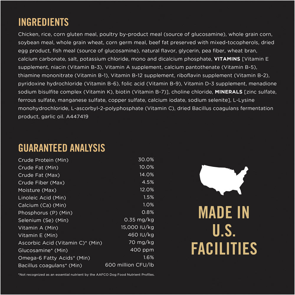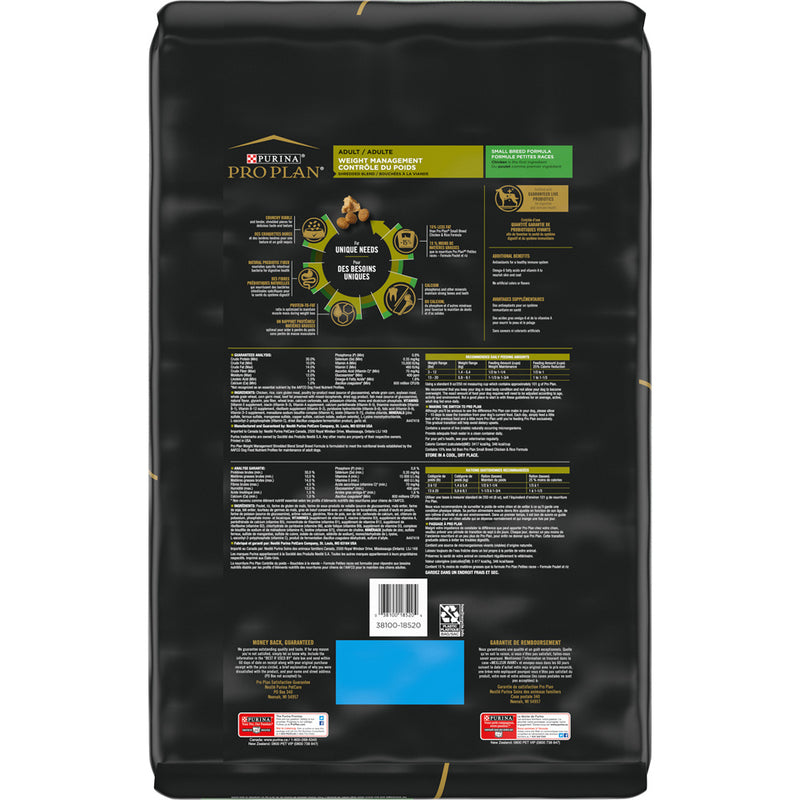 Shop / Purina Pro Plan / Purina Pro Plan Specialized Weight Management Shredded Blend With Probiotics Small Breed Dry Dog Food Purina Pro Plan Specialized Weight Management Shredded Blend With Probiotics Small Breed Dry Dog Food Purina Pro Plan $20.99 6 lb 18 lb 6-lb 18-lb Purchase Options Free In-Store Pick Up Not Available Save 10% on orders $49+ Set your store for inventory and store pickup details Zip Code Search Same-day Delivery* No minimum charge for delivery orders. *Order before 2pm and have it delivered today. Orders placed after 2pm will be delivered the next day. Must be inside delivery radius. Zip Code Unfortunately delivery is not available to this address. In order to ensure the best availability accuracy, changing your selected store will remove all items from your cart. You will need to re-add these items with your newly selected store if you choose to continue. Continue Cancel Ship it to Me Quantity Add To Cart Feeding guide disclaimer ✕ Feeding guides provide a starting point for the amount of food to give your pet each day. We recommend that you keep your pet in ideal body condition and not allow them to become overweight. The amount of food your pet needs can vary based on age, activity level or other food and treats given, so be sure to work with your veterinarian to determine an appropriate weight for your pet, and to make any necessary adjustments to their feeding. Information Provide the targeted support your small breed dog needs to achieve a healthy weight by feeding him Purina Pro Plan Small Breed Weight Management Shredded Blend Chicken & Rice Formula dry dog food. Real, high-quality chicken is the first ingredient in this high protein kibble dog food, which features an optimal protein-to-fat ratio to maintain muscle mass during weight loss. We fortify our weight control dog food with guaranteed live probiotics to support your dogs digestive and immune health, while natural prebiotic fiber nourishes specific intestinal bacteria for digestive health. Our small breed dry dog food contains calcium, phosphorus and other minerals to maintain his strong bones and teeth, and omega-6 fatty acids and vitamin A nourish your dogs skin and coat. The appealing combination of crunchy kibble and tender, shredded pieces provides delicious taste and texture without the use of artificial colors or flavors. Our formula provides 100% complete and balanced nutrition to support his overall health. With 15% less fat than Purina Pro Plan Small Breed Shredded Blend Chicken & Rice Formula for adult dogs, this SPECIALIZED Small Breed Weight Management dog food formula helps your dog reach an ideal body condition. We proudly manufacture Pro Plan dry dog food at Purina-owned U.S. facilities for your peace of mind. Ingredients : Chicken, rice, corn gluten meal, poultry by-product meal (source of glucosamine), whole grain corn, soybean meal, whole grain wheat, corn germ meal, beef fat preserved with mixed-tocopherols, dried egg product, fish meal (source of glucosamine), natural flavor, glycerin, pea fiber, wheat bran, calcium carbonate, salt, potassium chloride, mono and dicalcium phosphate, VITAMINS [Vitamin E supplement, niacin (Vitamin B-3), Vitamin A supplement, calcium pantothenate (Vitamin B-5), thiamine mononitrate (Vitamin B-1), Vitamin B-12 supplement, riboflavin supplement (Vitamin B-2), pyridoxine hydrochloride (Vitamin B-6), folic acid (Vitamin B-9), Vitamin D-3 supplement, menadione sodium bisulfite complex (Vitamin K), biotin (Vitamin B-7)], choline chloride, MINERALS [zinc sulfate, ferrous sulfate, manganese sulfate, copper sulfate, calcium iodate, sodium selenite], L-Lysine monohydrochloride, Lascorbyl-2-polyphosphate (Vitamin C), dried Bacillus coagulans fermentation product, garlic oil. Guaranteed Analysis Nutrient Guaranteed Units Crude Protein 30% min Crude Fat 10% min Crude Fiber 4.5% max Moisture 12% max Linoleic Acid 1.5% min Calcium 1.0% min Phosphorus 0.8% min Selenium 0.35 mg/kg min Vitamin A 15000 IU/kg Vitamin E 460 IU/kg Ascorbic Acid (Vitamin C) 70 mg/kg Glucosamine 400 ppm Omega-6 Fatty Acids 1.6% min Customers also liked Customer Reviews