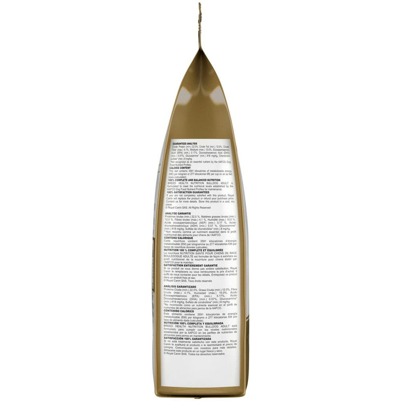 Shop / Royal Canin / Royal Canin Breed Health Nutrition Bulldog Adult Dry Dog Food Royal Canin Breed Health Nutrition Bulldog Adult Dry Dog Food Royal Canin Weight: 17 lb $79.99 17-lb Purchase Options Free In-Store Pick Up Not Available Save 10% on orders $49+ Set your store for inventory and store pickup details Zip Code Search Same-day Delivery* No minimum charge for delivery orders. *Order before 2pm and have it delivered today. Orders placed after 2pm will be delivered the next day. Must be inside delivery radius. Zip Code Unfortunately delivery is not available to this address. In order to ensure the best availability accuracy, changing your selected store will remove all items from your cart. You will need to re-add these items with your newly selected store if you choose to continue. Continue Cancel Ship it to Me Quantity Add To Cart Feeding guide disclaimer ✕ Feeding guides provide a starting point for the amount of food to give your pet each day. We recommend that you keep your pet in ideal body condition and not allow them to become overweight. The amount of food your pet needs can vary based on age, activity level or other food and treats given, so be sure to work with your veterinarian to determine an appropriate weight for your pet, and to make any necessary adjustments to their feeding. Information Royal Canin knows what makes your Bulldog magnificent is in the details. With their funny, squishy faces, wrinkled skin, and short, stocky bodies, Bulldogs bring a lot of love—and smells—to your home. They can benefit from the right diet to help protect their sensitive skin, maintain joint health, and aid digestion to cut down on stinky gas. Royal Canin Bulldog Adult dog food is tailor-made nutrition created just for your pure breed Bulldog. Whether you call yours an English Bulldog or British Bulldog, this exclusive breed-specific diet is uniquely formulated for your Bulldog with specific nutrients to help them thrive. The unique wave-shaped kibble is specially designed for your Bulldog’s unique jaw, making it easy for them to pick up and chew. Highly digestible proteins, precise fiber content, and high-quality carbohydrates support healthy digestion to decrease gas and unpleasant stool odors. Exclusive nutrients reinforce your Bulldog’s skin barrier to help protect skin folds from irritants and maintain a healthy coat. And optimal levels of EPA and DHA support bone and joint health, while helping your Bulldog maintain an ideal weight. • FORMULATED FOR PUREBRED BULLDOGS: Royal Canin Bulldog Adult Dry Dog Food is designed to meet the nutritional needs of purebred Bulldogs 12 months and older • SPECIALIZED KIBBLE: Unique kibble shape helps Bulldogs easily pick up and chew their food • OPTIMAL STOOL: Highly digestible proteins, precise fiber, and high-quality carbohydrate sources help reduce gas and stool odor • SKIN AND COAT: Delivers skin support with essential nutrients for healthy skin and coat • BONE AND JOINT: EPA and DHA support short, stocky bodies and provides bone & joint support Ingredients Brewers Rice, Oat Groats, Chicken By-Product Meal, Brown Rice, Wheat Gluten, Chicken Fat, Pork Meal, Natural Flavors, Dried Plain Beet Pulp, Fish Oil, Vegetable Oil, Sodium Silico Aluminate, Calcium carbonate, Powdered Cellulose, Salt, Egg Product, Potassium Chloride, Sodium Tripolyphosphate, Vitamins [Dl-Alpha Tocopherol Acetate (Source of Vitamin E), Niacin Supplement, L-Ascorbyl-2-Polyphosphate (Source of Vitamin C), D-Calcium Pantothenate, Biotin, Pyridoxine Hydrochloride (Vitamin B6), Riboflavin Supplement, Thiamine Mononitrate (Vitamin B1), Vitamin A Acetate, Folic Acid, Vitamin B121 Supplement, Vitamin D3 Supplement], Hydrolyzed Yeast, Potassium Citrate, L-Lysine, L-Tyrosine, Choline Chloride, Glucosamine Hydrochloride, Marigold Extract (Tagetes Erecta L.), Trace Minerals [Zinc Proteinate, Zinc Oxide, Ferrous Sulfate, Manganese Proteinate, Manganous Oxide, Copper Sulfate, Calcium Iodate, Sodium Selenite, Copper Proteinate], taurine, Magnesium Oxide, Green Tea Extract, Chondroitin Sulfate, Rosemary Extract, Preserved with Mixed Tocopherols and Citric Acid. Guaranteed Analysis Nutrient Guaranteed Units Crude Protein 22% min Crude Fat 12% min Crude Fiber 4.1% max Moisture 10% max EPA 0.17% min DHA 0.07% min Glucosamine 818 mg/kg min Chondroitin Sulfate 8 mg/kg min Customers also liked Customer Reviews