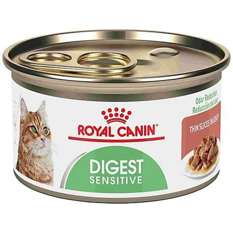Shop / Royal Canin / Royal Canin Feline Nutrition Digestive Sensitive Thin Slices in Gravy Canned Cat Food Royal Canin Feline Nutrition Digestive Sensitive Thin Slices in Gravy Canned Cat Food Royal Canin Weight: 3 oz, case of 24 $57.99 3-oz, case of 24 Feeding guide disclaimer ✕ Feeding guides provide a starting point for the amount of food to give your pet each day. We recommend that you keep your pet in ideal body condition and not allow them to become overweight. The amount of food your pet needs can vary based on age, activity level or other food and treats given, so be sure to work with your veterinarian to determine an appropriate weight for your pet, and to make any necessary adjustments to their feeding. Information Cats can be very good at hiding digestive upsets. However, you can find clues in their litter box. Lots of stinky stools could mean your cat has a sensitive stomach and digestive tract. And regular regurgitation may indicate a more serious issue, so you should consult your veterinarian. Royal Canin Digest Sensitive Thin Slices in Gravy wet cat food is formulated to provide digestive support for your adult cat with a sensitive tummy. Highly digestible proteins promote digestive health and a balanced intestinal tract so that your cat enjoys their food comfortably. The high-protein formula also helps your cat maintain a healthy weight. And a uniquely balanced blend of vitamins and minerals promotes your pet’s overall physical health and wellness. Try pairing with Royal Canin Digestive Care dry cat food for a meal your cat will love. With nearly 50 years of scientific research and observation, Royal Canin continues to deliver targeted nutrition to feed every pet’s magnificence. Not satisfied? Then neither are we. Our formulas are 100% satisfaction guaranteed. (Just contact us for more details.) Ingredients Water sufficient for processing, chicken by-products, pork by-products, pork liver, salmon, chicken liver, wheat flour, pork plasma, modified corn starch, vegetable oil, natural flavors, powdered cellulose, wheat gluten, gelatin, sodium silico aluminate, carob bean gum, potassium chloride, calcium sulfate, taurine, sodium tripolyphosphate, choline chloride, vitamins [DL-alpha tocopherol acetate (source of vitamin E), thiamine mononitrate (vitamin B1), niacin supplement, biotin, D-calcium pantothenate, folic acid, pyridoxine hydrochloride (vitamin B6), riboflavin supplement, vitamin B12 supplement, vitamin D3 supplement], trace minerals [zinc oxide, zinc proteinate, ferrous sulfate, copper sulfate, manganous oxide, calcium iodate, sodium selenite]. Guaranteed Analysis Nutrient Guaranteed Units Crude Protein 7.5% min Crude Fat 2.0% min Crude Fiber 1.7% max Moisture 82.5% max Customers also liked Customer Reviews