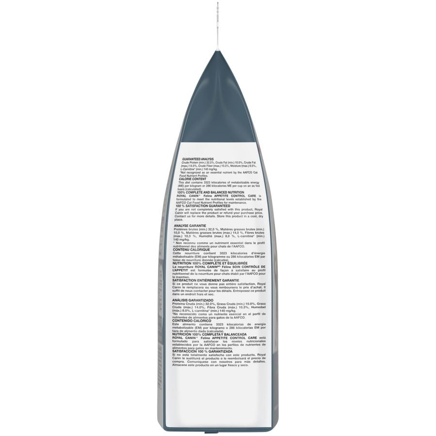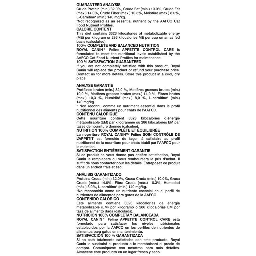 Shop / Royal Canin / Royal Canin Feline Health Nutrition Appetite Control Dry Cat Food Royal Canin Feline Health Nutrition Appetite Control Dry Cat Food Royal Canin Weight: 6 lb $42.99 6-lb Purchase Options Free In-Store Pick Up Not Available Save 20% on orders $100+ Set your store for inventory and store pickup details Zip Code Search Same-day Delivery* No minimum charge for delivery orders. *Order before 2pm and have it delivered today. Orders placed after 2pm will be delivered the next day. Must be inside delivery radius. Zip Code Unfortunately delivery is not available to this address. In order to ensure the best availability accuracy, changing your selected store will remove all items from your cart. You will need to re-add these items with your newly selected store if you choose to continue. Continue Cancel Ship it to Me Quantity Add To Cart Feeding guide disclaimer ✕ Feeding guides provide a starting point for the amount of food to give your pet each day. We recommend that you keep your pet in ideal body condition and not allow them to become overweight. The amount of food your pet needs can vary based on age, activity level or other food and treats given, so be sure to work with your veterinarian to determine an appropriate weight for your pet, and to make any necessary adjustments to their feeding. Information Royal Canin Feline Care Nutrition is formulated for adult cats to help naturally reduce the feeling of hunger. It delivers the nutrition and support cats need to help control their begging behaviors between meals, while limiting their risk of excess weight gain. It’s formulated with adapted protein and fat levels to support healthy weight maintenance. And it’s enriched with L-carnitine to help with fat metabolism. This highly palatable dry food provides highly digestible proteins for optimal digestive health and is suitable for spayed and neutered cats. "Delivers complete and balanced nutrition for adult cats to help control begging behaviors. Formulated to help reduce the feeling of hunger with a specific blend of fibers and to help satisfy the appetite of cats that have a tendency to beg between meals. Limits the risk of excess weight gain; formulated to support healthy weight maintenance with adapted protein and fat levels. Enriched with L-carnitine to help with fat metabolism. Delicious, hunger-satisfying dry food with highly digestible proteins for optimal digestive health." Ingredients Chicken meal, pea fiber, corn, wheat, corn gluten meal, wheat gluten, natural flavors, chicken fat, brewers rice, dried plain beet pulp, vegetable oil, sodium silico aluminate, sodium pyrophosphate, calcium sulfate, fish oil, potassium chloride, powdered psyllium seed husk, salt, choline chloride, fructooligosaccharides, vitamins [DL-alpha tocopherol acetate (source of vitamin E), L-ascorbyl-2-polyphosphate (source of vitamin C), niacin supplement, biotin, riboflavin supplement, D-calcium pantothenate, pyridoxine hydrochloride (vitamin B6), vitamin A acetate, thiamine mononitrate (vitamin B1), vitamin B12 supplement, folic acid, vitamin D3 supplement], monosodium phosphate, taurine, trace minerals [zinc proteinate, zinc oxide, ferrous sulfate, manganese proteinate, manganous oxide, copper sulfate, sodium selenite, calcium iodate, copper proteinate], DL-methionine, L-carnitine, rosemary extract, preserved with mixed tocopherols and citric acid. Guaranteed Analysis Nutrient Guaranteed Units Crude Protein 32.0% min Crude Fat 10.0% min Crude Fiber 14.0% max Moisture 8.0% max L-Carnitine 140 mg/kg min Customers also liked Customer Reviews