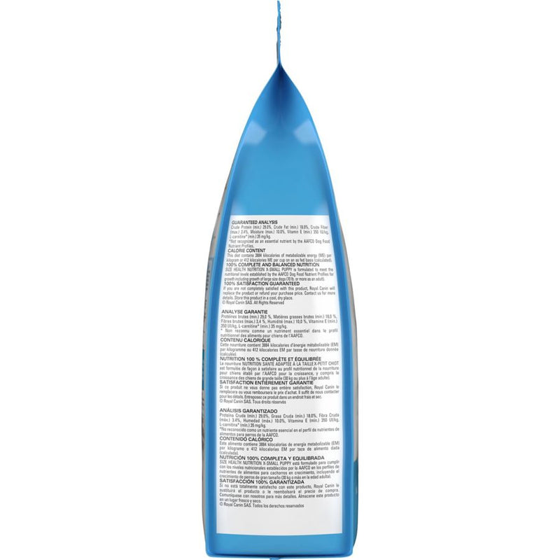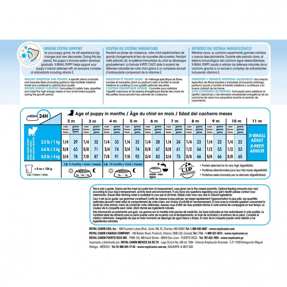 Shop / Royal Canin / Royal Canin X-Small Puppy Dry Dog Food Royal Canin X-Small Puppy Dry Dog Food Royal Canin Weight: 3 lb $25.99 3-lb Purchase Options Free In-Store Pick Up Not Available Save 10% on orders $49+ Set your store for inventory and store pickup details Zip Code Search Same-day Delivery* No minimum charge for delivery orders. *Order before 2pm and have it delivered today. Orders placed after 2pm will be delivered the next day. Must be inside delivery radius. Zip Code Unfortunately delivery is not available to this address. In order to ensure the best availability accuracy, changing your selected store will remove all items from your cart. You will need to re-add these items with your newly selected store if you choose to continue. Continue Cancel Ship it to Me Quantity Add To Cart Feeding guide disclaimer ✕ Feeding guides provide a starting point for the amount of food to give your pet each day. We recommend that you keep your pet in ideal body condition and not allow them to become overweight. The amount of food your pet needs can vary based on age, activity level or other food and treats given, so be sure to work with your veterinarian to determine an appropriate weight for your pet, and to make any necessary adjustments to their feeding. Information With countless dog food options out there with formulas focused on ingredients, how do you know what’s right for your growing puppy? No matter how big or small your pup becomes, Royal Canin has a right-sized diet, made with the precise amount of nutrients needed for every stage of their magnificent future. Your extra-small puppy has some big nutritional needs. That’s because toy and miniature breed puppies grow over a shorter period of time at a more intense rate than any other size dog. They’re also pretty fussy when it comes to the food they eat—it’s important to find a wholesome puppy food they’ll love. Royal Canin has the diet for extra-small puppies down to a science, finding the exact balance of nutrients your tiny puppy needs to become one magnificent dog. Royal Canin X-Small Puppy dry dog food is tailor-made for your mini pup’s healthy growth and development. It has all the proteins, minerals, and vitamins your new puppy needs to sustain the intense growth period that happens over the first 10 months of their life. An exclusive mix of antioxidants and minerals supports their developing immune systems and keeps their bodies growing strong. A small and tasty kibble designed for your pup’s smaller teeth and picky appetite also reduces the formation of tartar. And a tailored blend of fiber helps aid in digestion for optimal stool quality. With nearly 50 years of scientific research and observation, Royal Canin continues to deliver targeted nutrition to feed every pet’s magnificence. Not satisfied? Then neither are we. Our formulas are 100% satisfaction guaranteed. Ingredients Chicken by-product meal, brewers rice, corn, chicken fat, corn gluten meal, wheat gluten, dried plain beet pulp, natural flavors, vegetable oil, fish oil, psyllium seed husk, sodium silico aluminate, potassium chloride, monocalcium phosphate, fructooligosaccharides, sodium tripolyphosphate, hydrolyzed yeast (source of betaglucans), calcium carbonate, salt, Yucca schidigera extract, DL-methionine, vitamins [DL-alpha tocopherol acetate (source of vitamin E), L-ascorbyl-2-polyphosphate (source of vitamin C), biotin, D-calcium pantothenate, vitamin A acetate, pyridoxine hydrochloride (vitamin B6), niacin supplement, folic acid, thiamine mononitrate (vitamin B1), vitamin B12 supplement, riboflavin supplement, vitamin D3 supplement], choline chloride, L-lysine, taurine, trace minerals [zinc proteinate, zinc oxide, manganese proteinate, ferrous sulfate, manganous oxide, copper sulfate, calcium iodate, sodium selenite, copper proteinate], marigold extract (Tagetes erecta L.), L-carnitine, carotene, rosemary extract, preserved with mixed tocopherols and citric acid. Guaranteed Analysis Nutrient Guaranteed Units Crude Protein 29.0% min Crude Fat 18.0% min Crude Fiber 3.4% max Moisture 10.0% max Vitamin E 350 IU/kg min L-Carnitine 35 mg/kg min Customers also liked Customer Reviews