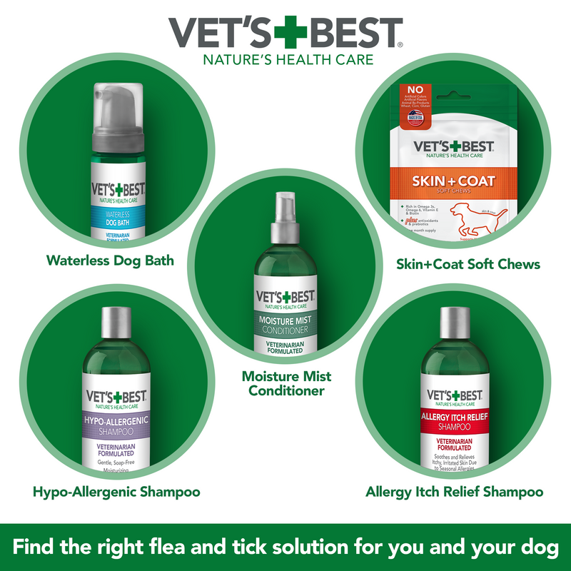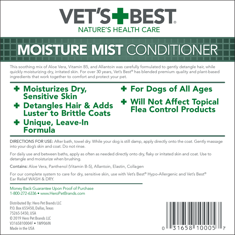 Shop / Unknown Type / Vet's Best Moisture Mist Conditioner 16oz Vet's Best Moisture Mist Conditioner 16oz Vet's Best 16oz $14.99 16oz Purchase Options Free In-Store Pick Up Not Available Save 10% on orders $49+ Set your store for inventory and store pickup details Zip Code Search Same-day Delivery* No minimum charge for delivery orders. *Order before 2pm and have it delivered today. Orders placed after 2pm will be delivered the next day. Must be inside delivery radius. Zip Code Unfortunately delivery is not available to this address. In order to ensure the best availability accuracy, changing your selected store will remove all items from your cart. You will need to re-add these items with your newly selected store if you choose to continue. Continue Cancel Ship it to Me Quantity Add To Cart Information Gently and quickly moisturize your dog’s dry, itchy skin with Vet’s Best Moisture Mist Conditioner. Our leave-in conditioner spray uses a unique, veterinarian-formulated blend of Vitamin B-5, skin conditioners, and key natural ingredients (including sage, aloe, and cucumber) to detangle hair and fur while soothing dry, irritated skin and adding lustre to brittle coats. Will not affect topical flea and tick control products. Ingredients: green herbal essence blend, panthenol (vitamin B-5), allantoin, elastin and collagen Customers also liked Customer Reviews