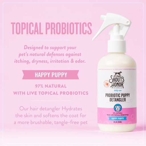 Shop / Skouts Honor / Skouts Honor Probiotic Detangler Happy Puppy Skouts Honor Probiotic Detangler Happy Puppy Skout's Honor Default Title $14.99 Default Title Purchase Options Free In-Store Pick Up Not Available Save 10% on orders $49+ Set your store for inventory and store pickup details Zip Code Search Same-day Delivery* No minimum charge for delivery orders. *Order before 2pm and have it delivered today. Orders placed after 2pm will be delivered the next day. Must be inside delivery radius. Zip Code Unfortunately delivery is not available to this address. In order to ensure the best availability accuracy, changing your selected store will remove all items from your cart. You will need to re-add these items with your newly selected store if you choose to continue. Continue Cancel Ship it to Me Quantity Add To Cart Information Hydrates and softens for a more brushable, tangle-free coat. Our dog and cat hair detangler hydrates the skin and softens the coat for a more brushable, tangle-free pet. It contains avocado oil and live, topical probiotics that help support a healthy microbiome to defend against common skin problems such as itching, odor, dryness, dandruff, hot spots, and excessive shedding. Customers also liked Customer Reviews