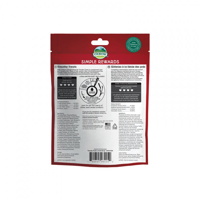 Shop / Small Pet / Oxbow Animal Health Simple Rewards Timothy Treats Oxbow Animal Health Simple Rewards Timothy Treats Oxbow Animal Health Weight: 1.4 oz $4.29 1.4-oz Purchase Options Free In-Store Pick Up Not Available Save 10% on orders $49+ Set your store for inventory and store pickup details Zip Code Search Same-day Delivery* No minimum charge for delivery orders. *Order before 2pm and have it delivered today. Orders placed after 2pm will be delivered the next day. Must be inside delivery radius. Zip Code Unfortunately delivery is not available to this address. In order to ensure the best availability accuracy, changing your selected store will remove all items from your cart. You will need to re-add these items with your newly selected store if you choose to continue. Continue Cancel Ship it to Me Quantity Add To Cart Feeding guide disclaimer ✕ Feeding guides provide a starting point for the amount of food to give your pet each day. We recommend that you keep your pet in ideal body condition and not allow them to become overweight. The amount of food your pet needs can vary based on age, activity level or other food and treats given, so be sure to work with your veterinarian to determine an appropriate weight for your pet, and to make any necessary adjustments to their feeding. Information Oxbow Timothy Treats are a wholesome, healthy treat favorite of rabbits, guinea pigs, chinchillas and other small pets. Made with fiber-rich timothy grass hay, Timothy Treats offer the fresh Timothy flavor and aroma animals love. Use Timothy Treats to add variety and enrichment to your pets diet. Simple Rewards Timothy Treats allow you to give your animal a healthy, delicious treat you can both feel good about.Why We Love It: Made with 100% Timothy Dry No artificial colors or added sugar Great source of enrichment About Oxbow Animal HealthAt Oxbow Animal Health, our purpose is to help people and pets live happy, healthy lives. For more than 30 years, weve partnered with leading veterinarians and nutritionists to develop nutrition and care products that meet the specific species and life stage needs of rabbits, guinea pigs, chinchillas, hamsters, gerbils, rats, and mice. From farm-fresh hays and nourishing fortified foods to wholesome treats, beneficial supplements, enrichment and care, Oxbow products are used and recommended by leading veterinary professionals and passionate pet parents worldwide. Ingredients Timothy Meal, Pearled Barley (Rolled), Oat Groats, Linseed (Flax) Meal, Canola Meal, Wheat Gluten, Millet, Ground Flax Seed, Canola Oil, Limestone, Salt, Dried Yeast Culture (Saccharomyces cerevisiae), Vitamin E Supplement, Choline Chloride, Zinc Proteinate, Zinc Sulfate, Ferrous Sulfate, Niacin, Copper Sulfate, Selenium Yeast, Vitamin A Supplement, Folic Acid, d-Calcium Pantothenate, Copper Proteinate, Riboflavin Supplement, Manganese Proteinate, Biotin, Manganous Oxide, Thiamine Mononitrate, Magnesium Sulfate, Vitamin B12 Supplement, Sodium Selenite, Pyridoxine Hydrochloride, Cobalt Carbonate, Vitamin D3 Supplement, Calcium Iodate Customers also liked Customer Reviews
