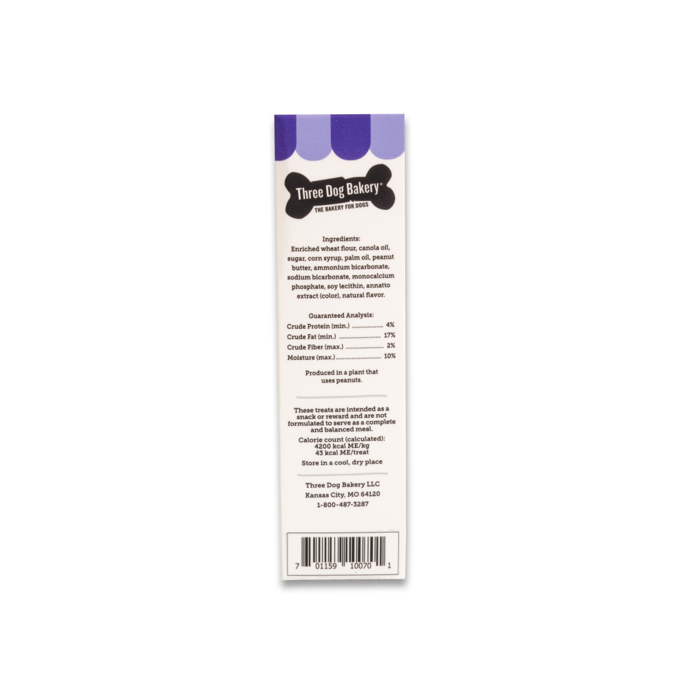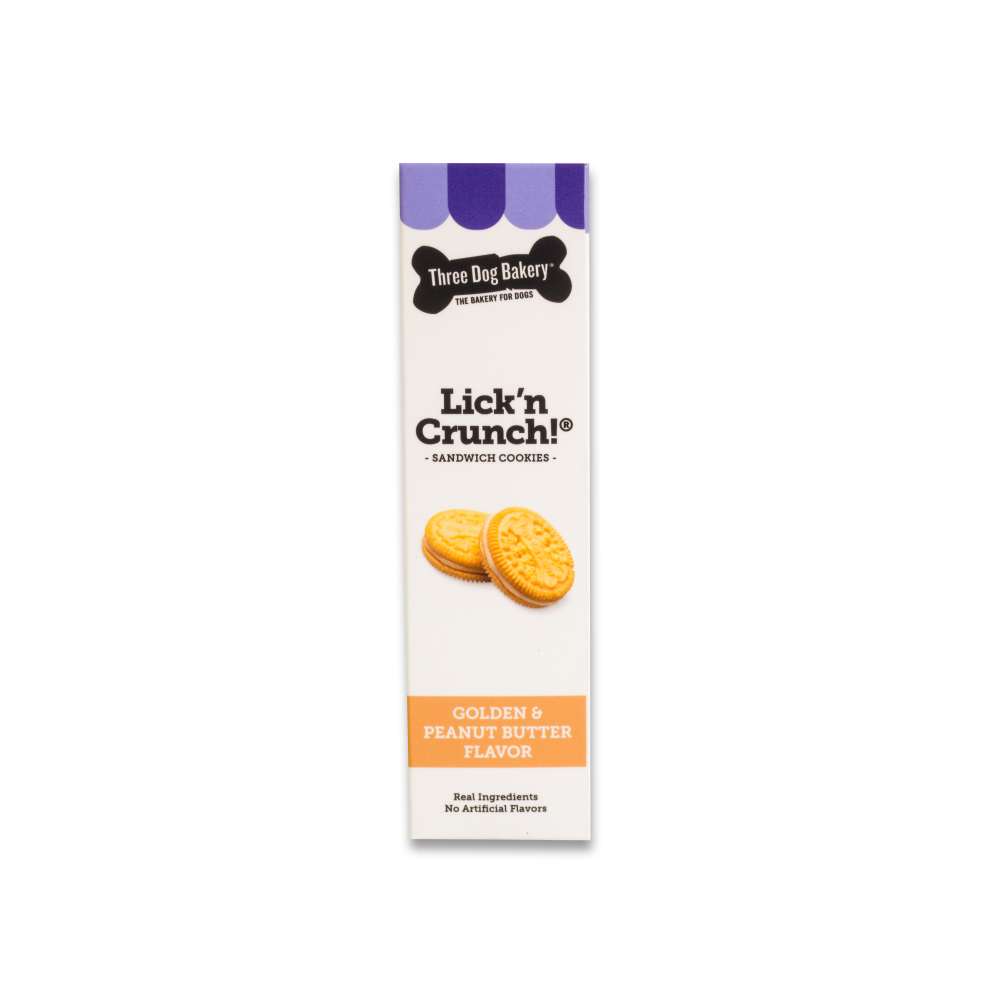 Shop / Three Dog Bakery / Lick'n Crunch Golden With Peanut Butter Flavored Filling Lick'n Crunch Golden With Peanut Butter Flavored Filling Three Dog Bakery Weight: 13 oz $7.99 13-oz Purchase Options Free In-Store Pick Up Not Available Save 10% on orders $49+ Set your store for inventory and store pickup details Zip Code Search Same-day Delivery* No minimum charge for delivery orders. *Order before 2pm and have it delivered today. Orders placed after 2pm will be delivered the next day. Must be inside delivery radius. Zip Code Unfortunately delivery is not available to this address. In order to ensure the best availability accuracy, changing your selected store will remove all items from your cart. You will need to re-add these items with your newly selected store if you choose to continue. Continue Cancel Ship it to Me Quantity Add To Cart Feeding guide disclaimer ✕ Feeding guides provide a starting point for the amount of food to give your pet each day. We recommend that you keep your pet in ideal body condition and not allow them to become overweight. The amount of food your pet needs can vary based on age, activity level or other food and treats given, so be sure to work with your veterinarian to determine an appropriate weight for your pet, and to make any necessary adjustments to their feeding. Information What do you get when you take two golden vanilla cookies and sandwich them around drool-worthy peanut butter filling? Easy. A wholesome reason to spoil your dog anytime with a treat made from real ingredients like wheat flour, and peanut butter. Ingredients Enriched wheat flour, canola oil, sugar, corn syrup, palm oil, peanut butter, ammonium bicarbonate, sodium bicarbonate, monocalcium phosphate, soy lecithin, annatto extract (color), natural flavor. Customers also liked Customer Reviews