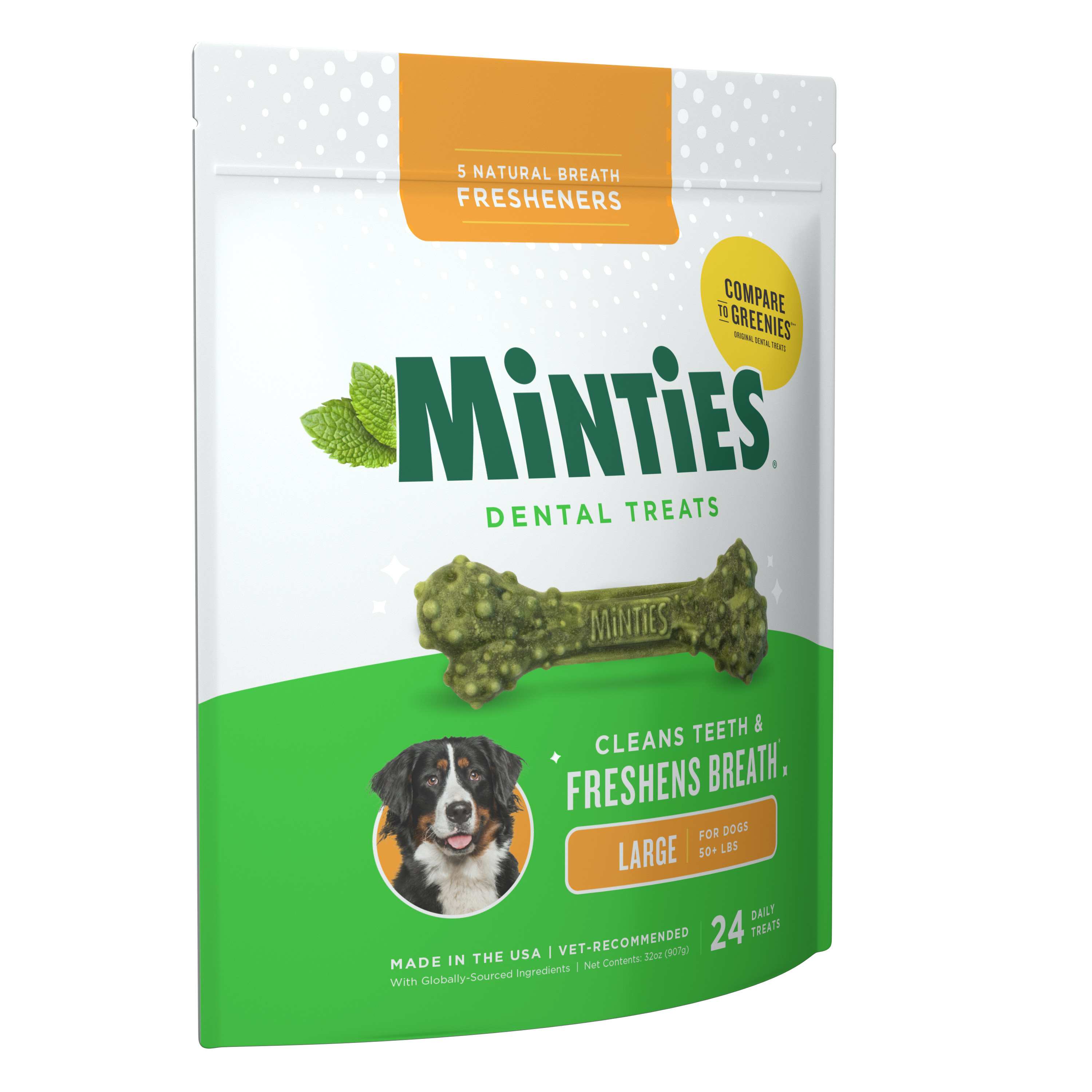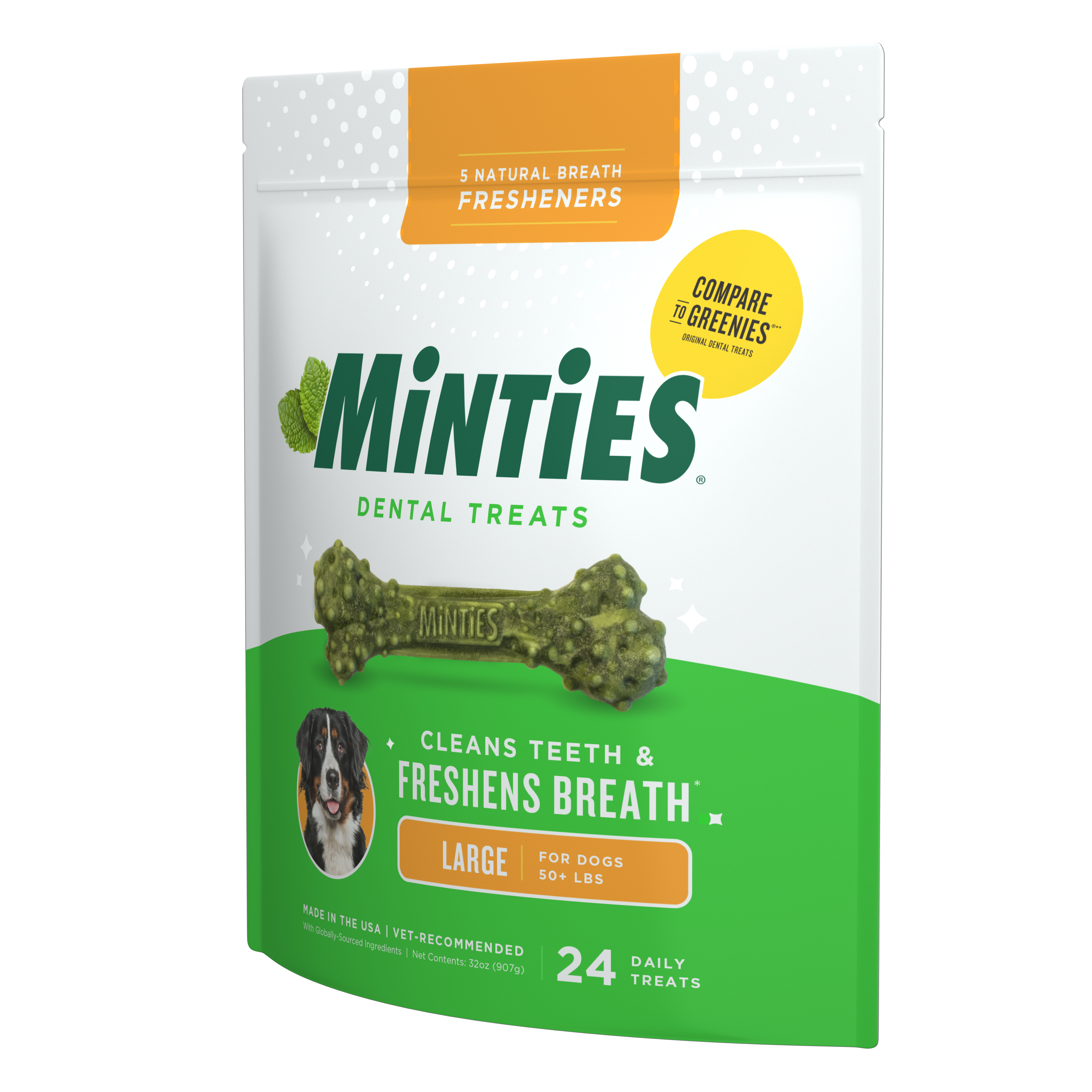 Shop / Treats & Chews / Minties Dog Dental Bone Treats Large 32oz Minties Dog Dental Bone Treats Large 32oz Minties 32oz $18.99 32oz Purchase Options Free In-Store Pick Up Not Available Save 20% on orders $100+ Set your store for inventory and store pickup details Zip Code Search Same-day Delivery* No minimum charge for delivery orders. *Order before 2pm and have it delivered today. Orders placed after 2pm will be delivered the next day. Must be inside delivery radius. Zip Code Unfortunately delivery is not available to this address. In order to ensure the best availability accuracy, changing your selected store will remove all items from your cart. You will need to re-add these items with your newly selected store if you choose to continue. Continue Cancel Ship it to Me Quantity Add To Cart Feeding guide disclaimer ✕ Feeding guides provide a starting point for the amount of food to give your pet each day. We recommend that you keep your pet in ideal body condition and not allow them to become overweight. The amount of food your pet needs can vary based on age, activity level or other food and treats given, so be sure to work with your veterinarian to determine an appropriate weight for your pet, and to make any necessary adjustments to their feeding. Information Say hello to Minties, the dental treats that make oral care fun for your dog! Designed to freshen breath and promote dental health, Minties are crafted with 5 natural breath fresheners—peppermint, parsley, fennel, dill, and alfalfa. Plus, these dental treats for dogs are made without corn, wheat, soy, and added sugars or salts, to be extra gentle on sensitive tummies. Each of these dog breath treats features a unique shape and bumpy texture that help to scrub teeth as your dog chews! Veterinarian recommended and proudly made in the USA, Minties dental treats for dogs come in different sizes (small, medium, large) to suit dogs of all ages and breeds. Whether given daily or as an occasional after-dinner breath freshener, Minties dental chews for dogs are a tasty way to support your dog's oral hygiene routine and dog dental care. Minties are a wholesome choice that dogs love and owners trust for maintaining fresh breath, sparkling smiles, and overall dental wellness. INGREDIENTS: Rice Flour, Vegetable Glycerin, Water, Natural Chicken Flavor, Calcium Carbonate, Tricalcium Phosphate, Dried Alfalfa (Source of Chlorophyll), Peppermint Oil, Brewers Dried Yeast, Lecithin, Parsley, Fennel, Dill, Mixed Tocopherols (Preservative), Cholecalciferol (Source of Vitamin D3), Yellow #5, Blue #1. GUARANTEED ANALYSIS: Crude Protein Min 6%, Crude Fat Min 1.5%, Crude Fiber Max 2.5%, Moisture Max 15% Customers also liked Customer Reviews