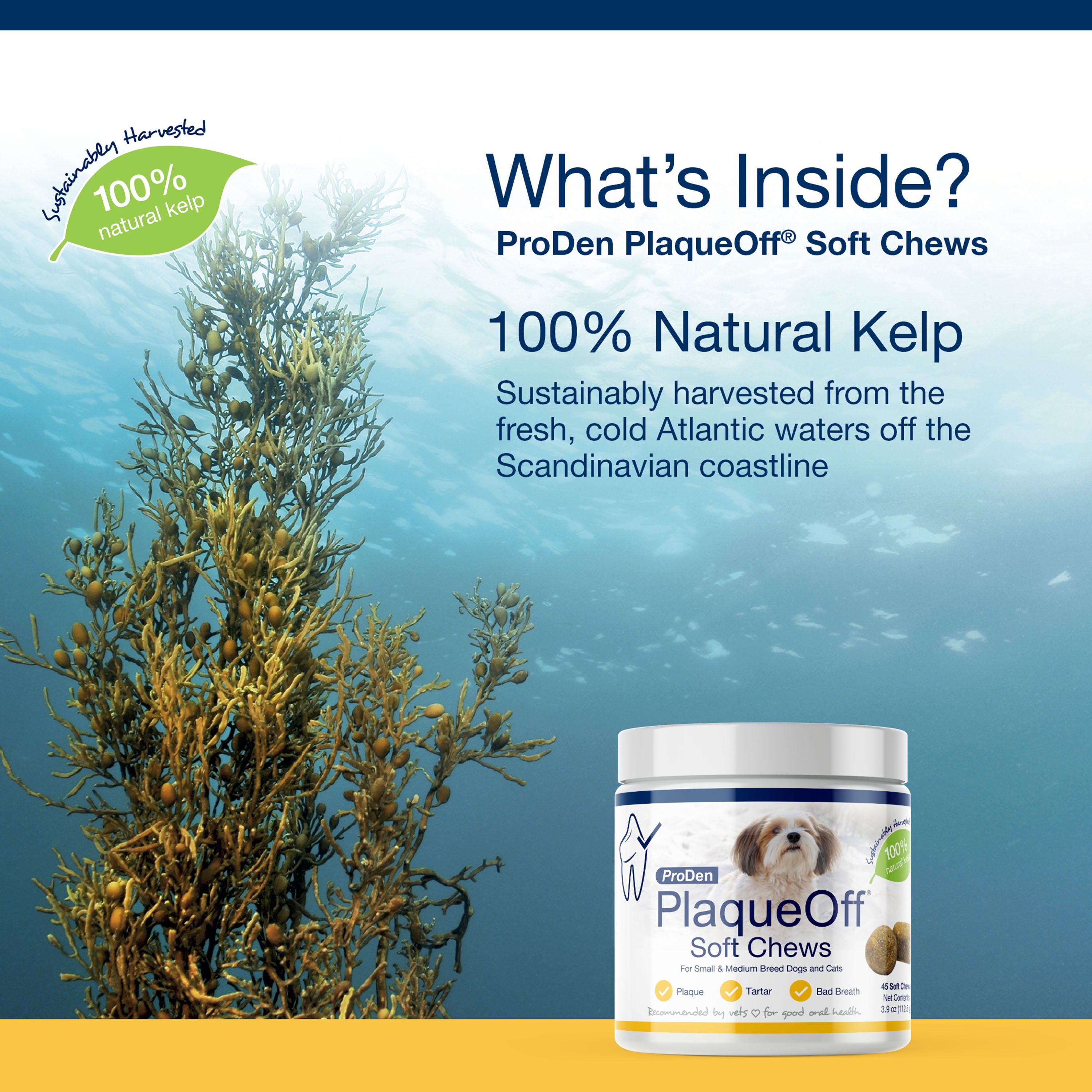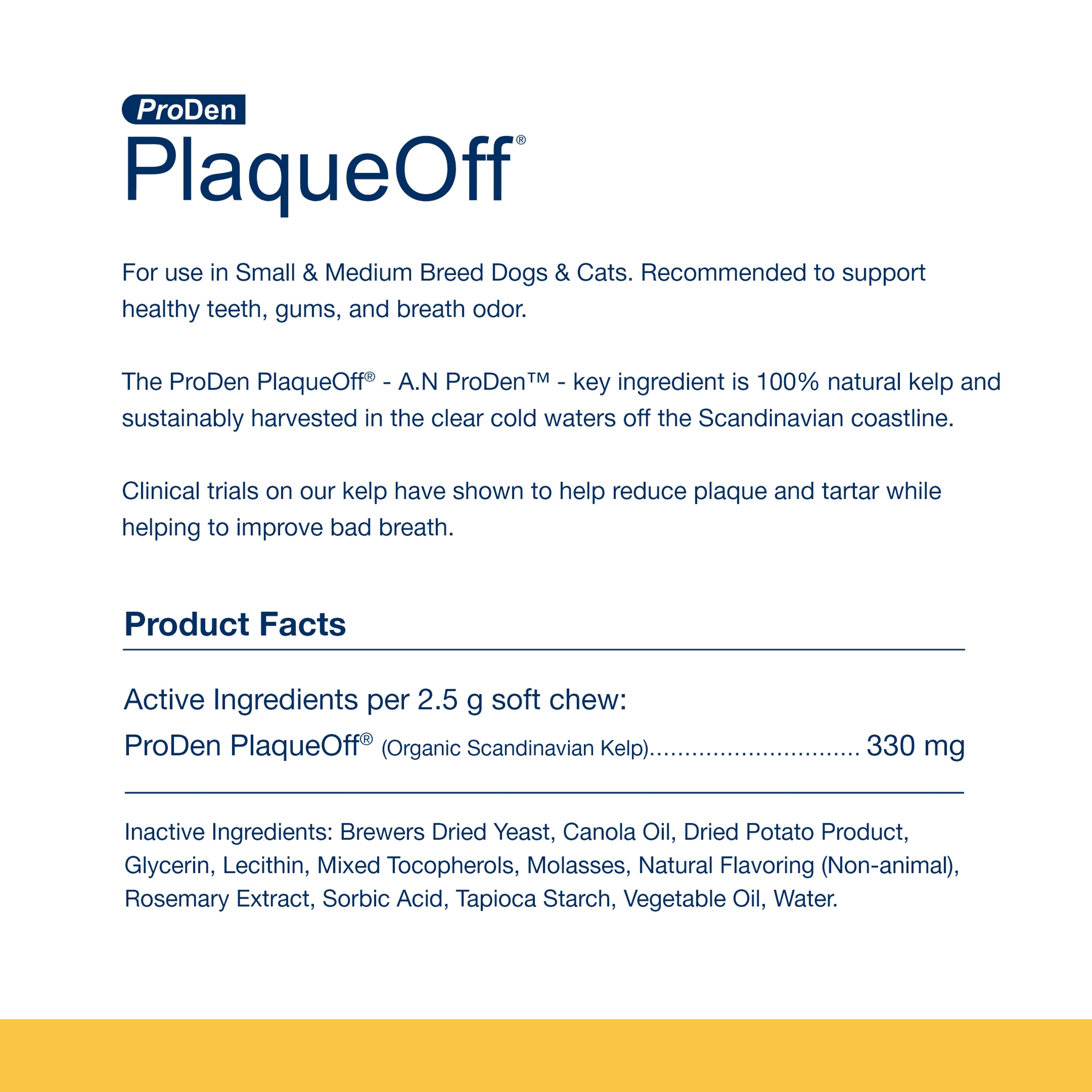 Shop / Treats / ProDen PlaqueOff® Soft Chews For Small and Medium Breed Dogs ProDen PlaqueOff® Soft Chews For Small and Medium Breed Dogs ProDen Plaque Off Small & Medium Breeds $15.99 Small & Medium Breeds Purchase Options Free In-Store Pick Up Not Available Save 20% on orders $100+ Set your store for inventory and store pickup details Zip Code Search Same-day Delivery* No minimum charge for delivery orders. *Order before 2pm and have it delivered today. Orders placed after 2pm will be delivered the next day. Must be inside delivery radius. Zip Code Unfortunately delivery is not available to this address. In order to ensure the best availability accuracy, changing your selected store will remove all items from your cart. You will need to re-add these items with your newly selected store if you choose to continue. Continue Cancel Ship it to Me Quantity Add To Cart Feeding guide disclaimer ✕ Feeding guides provide a starting point for the amount of food to give your pet each day. We recommend that you keep your pet in ideal body condition and not allow them to become overweight. The amount of food your pet needs can vary based on age, activity level or other food and treats given, so be sure to work with your veterinarian to determine an appropriate weight for your pet, and to make any necessary adjustments to their feeding. Information Give the gift of a healthy mouth with ProDen PlaqueOff Soft Chews. These delicious chews are crafted to support your dog's dental health, targeting plaque and tartar while keeping their breath fresh. The ProDen PlaqueOff key ingredient is 100% natural kelp and is sustainably harvested in the clear, cold waters off the Scandinavian coastline. Clinical trials on our kelp have shown to help reduce plaque and tartar while helping to improve bad breath. Proudly made in the USA. Customers also liked Customer Reviews