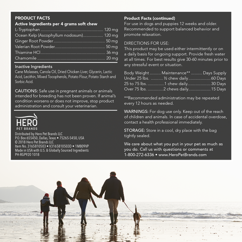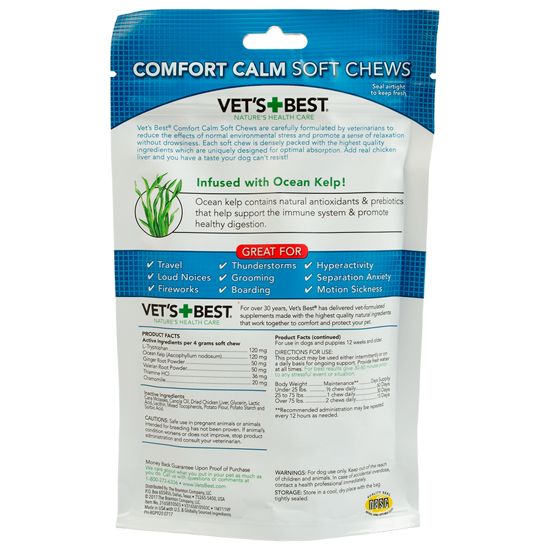 Shop / Vet's Best / Vet's Best Comfort Calm Soft Chews 30ct Vet's Best Comfort Calm Soft Chews 30ct Vet's Best 30ct $18.99 30ct Purchase Options Free In-Store Pick Up Not Available Save 10% on orders $49+ Set your store for inventory and store pickup details Zip Code Search Same-day Delivery* No minimum charge for delivery orders. *Order before 2pm and have it delivered today. Orders placed after 2pm will be delivered the next day. Must be inside delivery radius. Zip Code Unfortunately delivery is not available to this address. In order to ensure the best availability accuracy, changing your selected store will remove all items from your cart. You will need to re-add these items with your newly selected store if you choose to continue. Continue Cancel Ship it to Me Quantity Add To Cart Information Vet’s Best Comfort Calm Soft Chews promote calm and balanced behavior in nervous, hyper, or discontented dogs. A vet-formulated blend of plant-based ingredients in each once-a-day soft chew supports non-drowsy relaxation and helps reduce separation anxiety. The OptiLife3™ Formula provides antioxidants and prebiotics to support healthy immune and digestive systems, and reduce the effects of normal environmental stress. Our chews are extra moist, great-tasting, and made for optimal absorption. Made with quality globally sourced ingredients. Ingredients: L-Tryptophan, Ocean Kelp (Ascophyllum nodosum), Ginger root powder, Valerian Root Powder, Thiamine HCI, Chamomile, Cane Molasses, Canola Oil, Dried Chicken Liver, Glycerin, Lactic Acid, Mixed Tocopherols, Potato Flour, Potato Starch and Sorbic Acid. Customers also liked Customer Reviews