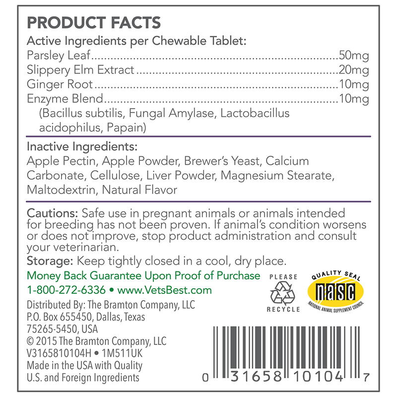 Shop / Vet's Best / Vet's Best Gas Busters Tablets 90ct Vet's Best Gas Busters Tablets 90ct Vet's Best 90ct $10.99 90ct Purchase Options Free In-Store Pick Up Not Available Save 10% on orders $49+ Set your store for inventory and store pickup details Zip Code Search Same-day Delivery* No minimum charge for delivery orders. *Order before 2pm and have it delivered today. Orders placed after 2pm will be delivered the next day. Must be inside delivery radius. Zip Code Unfortunately delivery is not available to this address. In order to ensure the best availability accuracy, changing your selected store will remove all items from your cart. You will need to re-add these items with your newly selected store if you choose to continue. Continue Cancel Ship it to Me Quantity Add To Cart Information Whether your dog suffers from occasional gas, bloating, or an upset stomach, Vet’s Best Gas Busters Supplements for Gas Relief and Digestion Aid can help. Our veterinarian-formulated blend of key natural ingredients (including parsley, slippery elm bark, and ginger root) provides soothing relief, while enzymes and probiotics help support a healthy gut microbiome. Ingredients: Parsley Lea, Slippery Elm Extract, Ginger Root, Enzyme Blend Customers also liked Customer Reviews