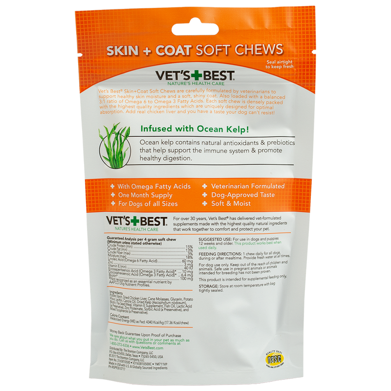 Shop / Vet's Best / Vet's Best Skin & Coat Soft Chews 30ct Vet's Best Skin & Coat Soft Chews 30ct Vet's Best 30ct $18.99 30ct Purchase Options Free In-Store Pick Up Not Available Save 10% on orders $49+ Set your store for inventory and store pickup details Zip Code Search Same-day Delivery* No minimum charge for delivery orders. *Order before 2pm and have it delivered today. Orders placed after 2pm will be delivered the next day. Must be inside delivery radius. Zip Code Unfortunately delivery is not available to this address. In order to ensure the best availability accuracy, changing your selected store will remove all items from your cart. You will need to re-add these items with your newly selected store if you choose to continue. Continue Cancel Ship it to Me Quantity Add To Cart Information Maintain your dog's skin and coat to keep them looking great and feeling even better with Vet's Best Skin & Coat Soft Chews Supplements. Our great tasting, extra moist daily chews contain a balanced 3:1 ratio of Omega-6 to Omega-3 fatty acids, along with biotin, zinc and vitamin E to support your dog's skin, coat, and nail health. This veterinarian-formulated supplement also contains OptiLife3™, which provides antioxidants and prebiotics to reduce the effects of normal environmental stress, support a healthy immune system and digestive health. Ingredients: Potato Starch, Dried Chicken Liver, Cane Molasses, Glycerin, Potato Flour, Lecithin, Canola Oil, Dried Kelp (Ascophyllum nodosum), Biotin,Vitamin E Supplement, Fish Oil, Lactic Acid, Zinc Prteinate, Sorbic Acid (a Preservative), and Mixed Tocopherols (a Preservative). Guaranteed Analysis: per 4 gram soft chew- Crude Protein (min) 15%, Crude Fat (min) 13%, Crude Fiber (max) 3%, Moisture (max) 18%, Linoleic Acid (Omega 6 Fatty Acid) (min) 60 mg, Eicosapentaenoic Acid (Omega 3 Fatty Acid) (min) 10 mg, Docosahexaenoic Acid (Omega 3 Fatty Acid) (min) 6.4 mg, Zinc (min) 3 mg, Vitamin E (min) 40 IU, Biotin 100 (min) mcg Customers also liked Customer Reviews