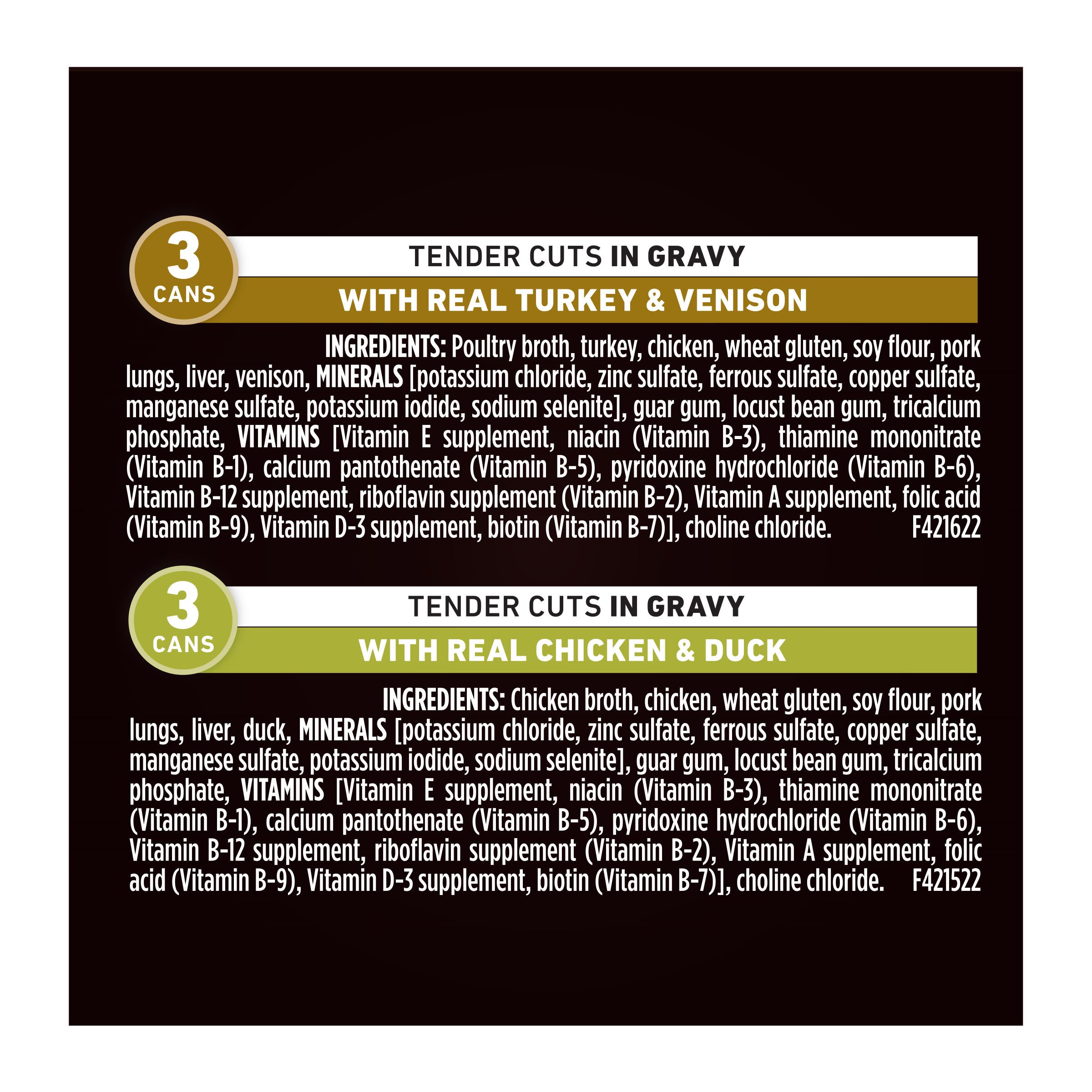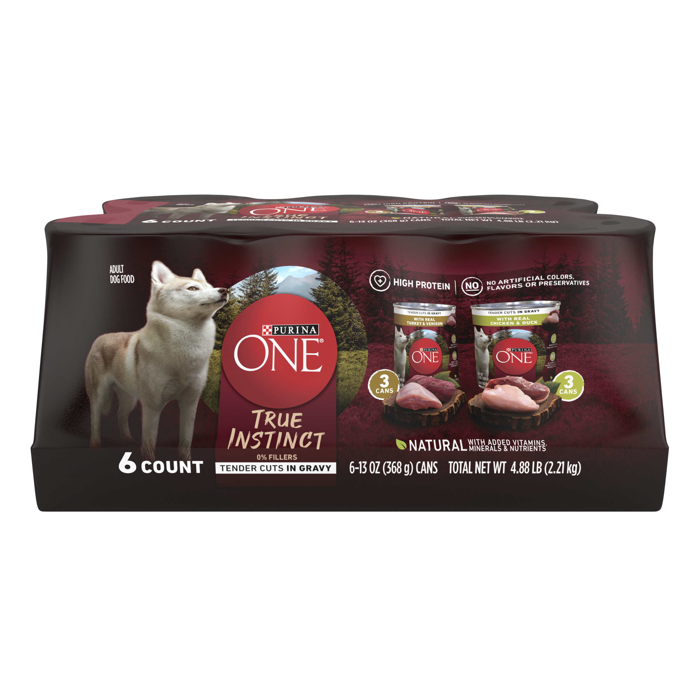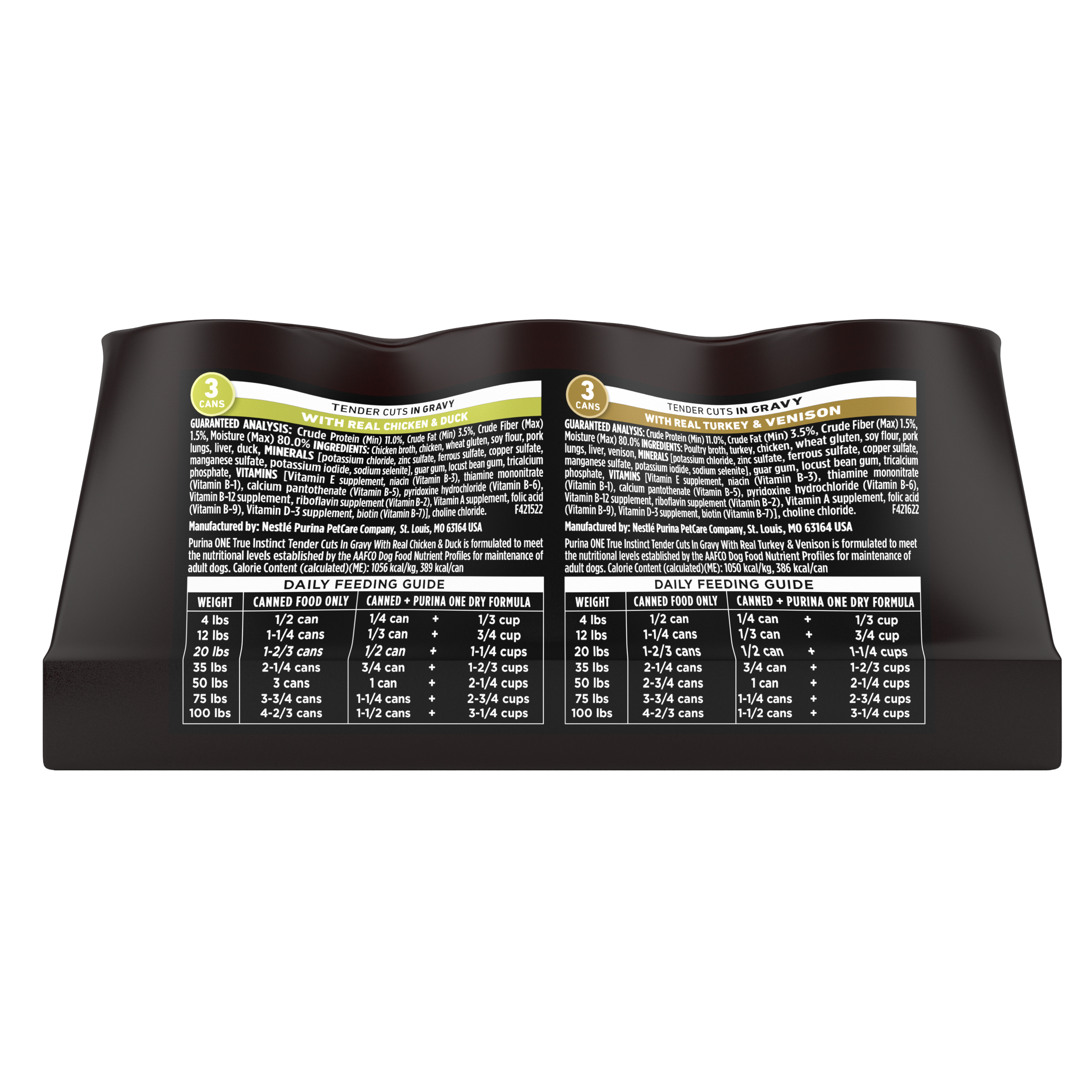 Shop / Wet Dog Food / Purina ONE True Instinct Tender Cuts in Gravy With Real Turkey and Venison, and With Real Chicken and Duck High Protein Wet Dog Food Variety Pack Purina ONE True Instinct Tender Cuts in Gravy With Real Turkey and Venison, and With Real Chicken and Duck High Protein Wet Dog Food Variety Pack Purina ONE 13oz $13.99 13oz Purchase Options Free In-Store Pick Up Not Available Save 20% on orders $100+ Set your store for inventory and store pickup details Zip Code Search Same-day Delivery* No minimum charge for delivery orders. *Order before 2pm and have it delivered today. Orders placed after 2pm will be delivered the next day. Must be inside delivery radius. Zip Code Unfortunately delivery is not available to this address. In order to ensure the best availability accuracy, changing your selected store will remove all items from your cart. You will need to re-add these items with your newly selected store if you choose to continue. Continue Cancel Ship it to Me Quantity Add To Cart Feeding guide disclaimer ✕ Feeding guides provide a starting point for the amount of food to give your pet each day. We recommend that you keep your pet in ideal body condition and not allow them to become overweight. The amount of food your pet needs can vary based on age, activity level or other food and treats given, so be sure to work with your veterinarian to determine an appropriate weight for your pet, and to make any necessary adjustments to their feeding. Information Give your dog an assortment of mealtime options with this Purina ONE True Instinct Tender Cuts in Gravy wet adult dog food variety pack that is natural dog food with added vitamins, minerals and nutrients. Both recipes feature real poultry along with other high-quality ingredients you can feel good about giving to your dog. The tender, meaty canned dog food texture gives him something to sink his teeth into, and a rich gravy for dogs balances out each of these delicious meals for added flavor and moisture. These high-protein dog food formulas are made with no poultry by-products and no artificial colors, flavors or preservatives. With 100 percent complete and balanced nutrition for your adult dog's whole-body health, this canned food for dogs is a convenient way to satisfy his nutritional needs. Alternate between these two Purina ONE wet dog food With Real Turkey and Venison or With Real Chicken and Duck and show him just how much you care about his health and happiness. Ingredients Turkey & Venison: Poultry Broth, Turkey, Chicken, Wheat Gluten, Soy Flour, Pork Lungs, Liver, Venison, MINERALS [Potassium Chloride, Zinc Sulfate, Ferrous Sulfate, Copper Sulfate, Manganese Sulfate, Potassium Iodide, Sodium Selenite], Guar Gum, Locust Bean Gum, Tricalcium Phosphate, VITAMINS [Vitamin E Supplement, Niacin (Vitamin B-3), Thiamine Mononitrate (Vitamin B-1), Calcium Pantothenate (Vitamin B-5), Pyridoxine Hydrochloride (Vitamin B-6), Vitamin B-12 Supplement, Riboflavin Supplement (Vitamin B-2), Vitamin A Supplement, Folic Acid (Vitamin B-9), Vitamin D-3 Supplement, Biotin (Vitamin B-7)], Choline Chloride. F421622; Chicken & Duck: Chicken Broth, Chicken, Wheat Gluten, Soy Flour, Pork Lungs, Liver, Duck, MINERALS [Potassium Chloride, Zinc Sulfate, Ferrous Sulfate, Copper Sulfate, Manganese Sulfate, Potassium Iodide, Sodium Selenite], Guar Gum, Locust Bean Gum, Tricalcium Phosphate, VITAMINS [Vitamin E Supplement, Niacin (Vitamin B-3), Thiamine Mononitrate (Vitamin B-1), Calcium Pantothenate (Vitamin B-5), Pyridoxine Hydrochloride (Vitamin B-6), Vitamin B-12 Supplement, Riboflavin Supplement (Vitamin B-2), Vitamin A Supplement, Folic Acid (Vitamin B-9), Vitamin D-3 Supplement, Biotin (Vitamin B-7)], Choline Chloride. F421522 Guaranteed Analysis Turkey & Venison: Crude Protein (Min)…11.0%, Crude Fat (Min)…3.5%, Crude Fiber (Max)…1.5%, Moisture (Max)…80.0%; Chicken & Duck: Crude Protein (Min)…11.0%, Crude Fat (Min)…3.5%, Crude Fiber (Max)…1.5%, Moisture (Max)…80.0% Customers also liked Customer Reviews