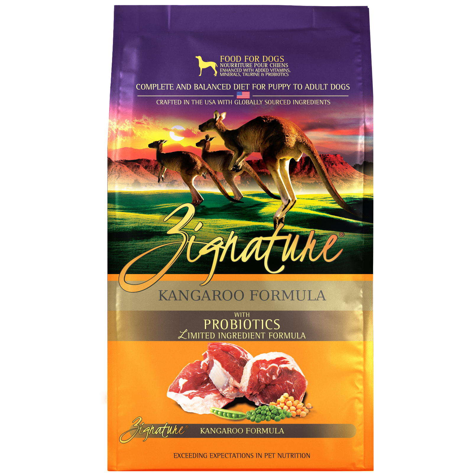 Shop / Zignature 25lbs and up / Zignature Kangaroo Formula Dry Dog Food, 25lb Zignature Kangaroo Formula Dry Dog Food, 25lb Zignature 25lb $98.99 25lb Purchase Options Free In-Store Pick Up Not Available Save 10% on orders $49+ Set your store for inventory and store pickup details Zip Code Search Same-day Delivery* No minimum charge for delivery orders. *Order before 2pm and have it delivered today. Orders placed after 2pm will be delivered the next day. Must be inside delivery radius. Zip Code Unfortunately delivery is not available to this address. In order to ensure the best availability accuracy, changing your selected store will remove all items from your cart. You will need to re-add these items with your newly selected store if you choose to continue. Continue Cancel Ship it to Me Quantity Add To Cart Feeding guide disclaimer ✕ Feeding guides provide a starting point for the amount of food to give your pet each day. We recommend that you keep your pet in ideal body condition and not allow them to become overweight. The amount of food your pet needs can vary based on age, activity level or other food and treats given, so be sure to work with your veterinarian to determine an appropriate weight for your pet, and to make any necessary adjustments to their feeding. Information Kangaroo is a lean animal protein that is rich in nutrients and offers twice the amount of Vitamin B12 than any other meat protein. Also a great source of Omega-3, which can help maintain heart health, your dog will love the taste and can benefit from all the nutrients Kangaroo protein has to offer. Ingredients Ingredients: Kangaroo, Kangaroo Meal, Peas, Pea Flour, Chickpeas, Sunflower Oil, Flaxseed, Dehydrated Alfalfa Meal, Lentils, Natural Flavor, Pea Protein, Calcium Carbonate, Salt, Choline Chloride, Vitamins (Vitamin E Supplement, Vitamin A Supplement, Niacinamide, d-Calcium Pantothenate, Riboflavin, Vitamin D3 Supplement, Thiamine Mononitrate, Vitamin B12 Supplement, Pyridoxine Hydrochloride, Folic Acid, Biotin), Taurine, Minerals (Zinc Proteinate, Iron Proteinate, Potassium Chloride, Copper Proteinate, Sodium Selenite, Manganese Proteinate, Calcium Iodate), Mixed Tocopherols (Preservative), L-Carnitine, Rosemary Extract, Dried Bacillus Coagulans Fermentation Product, Dried Bacillus Subtilis Fermentation Product, Dried Bifidobacterium Bifidum Fermentation Product. Guaranteed Analysis Guaranteed Analysis: Crude protein (min)26.5%Crude fat (min)13%Crude fiber (max)5.5%Moisture (max)10%Omega 6 fatty acids* (min)4.7%Omega 3 fatty acids* (min)1.5%Taurine* (min)0.2%L-Carnitine* (min)40mg/kg Customers also liked Customer Reviews
