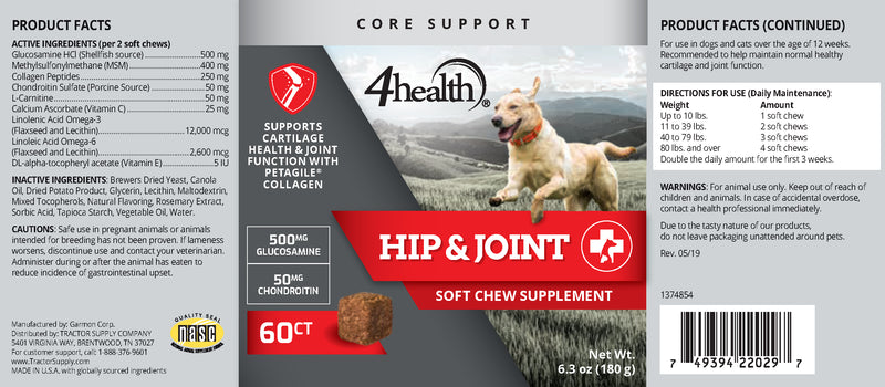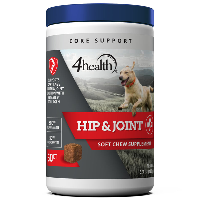 Shop / Unknown Type / 4health Preventative Hip and Joint Supplement for Dogs and Cats, 60 ct. 4health Preventative Hip and Joint Supplement for Dogs and Cats, 60 ct. 4health Default Title $11.99 $14.99 Default Title Purchase Options Free In-Store Pick Up Not Available Save 10% on orders $49+ Set your store for inventory and store pickup details Zip Code Search Same-day Delivery* No minimum charge for delivery orders. *Order before 2pm and have it delivered today. Orders placed after 2pm will be delivered the next day. Must be inside delivery radius. Zip Code Unfortunately delivery is not available to this address. In order to ensure the best availability accuracy, changing your selected store will remove all items from your cart. You will need to re-add these items with your newly selected store if you choose to continue. Continue Cancel Ship it to Me Quantity Add To Cart Information For healthy joints, the 4health Preventative Hip and Joint Supplement for Dogs and Cats has you covered. By adding this supplement to your pet's daily diet, you can help preserve and support his/her joints, cartilage and connective tissue. The hip and joint supplement contains powerful ingredients like Petagile Collagen, glucosamine and chondroitin and comes packaged in a soft, chewy treat. Take the necessary steps to keep your active dog agile and introduce them to these 4health preventative hip and joint supplement chews today. Hip and joint supplement for dogs and cats over the age of 12 weeks Recommended to help maintain normal healthy cartilage and joint function Made with powerful joint-boosting ingredients such as Petagile Collagen, 500 mg glucosamine and 50 mg chondroitin Designed to help keep active pets agile by supporting the structural integrity of the joint, connective tissue and cartilage Ingredients Active Ingredients (per 2 soft chews):Glucosamine HCI (shellfish source) 500mg, Methlysulfonylmethane (MSM) 400mg, Collagen Peptides 250 mg, Chondroitin Sulfate (Porcine Source) 50mg, L-Carnitine 50mg, Calcium Ascorbate (Vitamin C) 25mg, Linolenic Acid Omega-3 (Flaxseed and Lecithin) 12,0000 mcg, Linoleic Acid Omega-6 (Flaxseed and Lecithin) 2,600 mcg, DL-alpha-tocopheryl acetate (Vitamin E) 5 IU. INACTIVE INGREDIENTS: Brewers Dried Yeast, Canola Oil, Dried Potato Product, Glycerin, Lecithin, Maltodextrin, Mixed Tocopherols, Natural Flavoring, Rosemary Extract, Sorbic Acid, Tapioca Starch, Vegetable Oil, Water. Customers also liked Customer Reviews