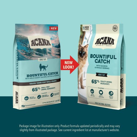 Your cat is an obligate carnivore, biologically requiring a diet that is rich in protein from whole animal ingredients. That’s why NEW ACANA Bountiful Catch is loaded with 65% quality fish ingredients from wild-caught salmon, herring, and trout, in richly nourishing WholePrey ratios of fish, organs, and bone, so your cat is getting the nutrients they need, naturally. Add the delicious and savory flavor, and this new recipe just might be your cat’s new favorite.
