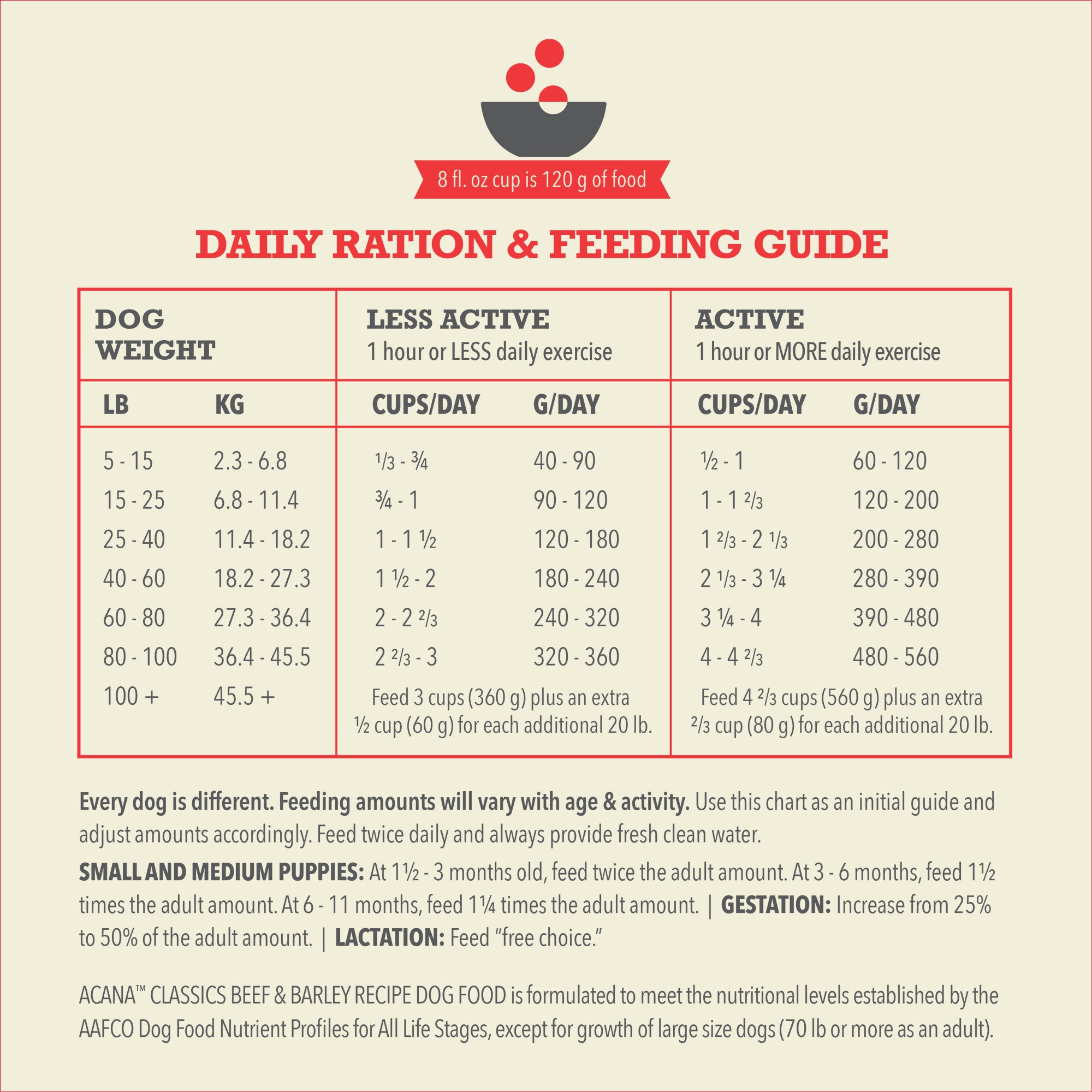Shop / Unknown Type / ACANA Classics Dry Dog Food Beef & Barley Recipe 22.5lb ACANA Classics Dry Dog Food Beef & Barley Recipe 22.5lb ACANA 22.5lb $61.99 22.5lb Purchase Options Free In-Store Pick Up Not Available Save 10% on orders $49+ Set your store for inventory and store pickup details Zip Code Search Same-day Delivery* No minimum charge for delivery orders. *Order before 2pm and have it delivered today. Orders placed after 2pm will be delivered the next day. Must be inside delivery radius. Zip Code Unfortunately delivery is not available to this address. In order to ensure the best availability accuracy, changing your selected store will remove all items from your cart. You will need to re-add these items with your newly selected store if you choose to continue. Continue Cancel Ship it to Me Quantity Add To Cart Feeding guide disclaimer ✕ Feeding guides provide a starting point for the amount of food to give your pet each day. We recommend that you keep your pet in ideal body condition and not allow them to become overweight. The amount of food your pet needs can vary based on age, activity level or other food and treats given, so be sure to work with your veterinarian to determine an appropriate weight for your pet, and to make any necessary adjustments to their feeding. Information Help your dog feel so good inside, you’ll see it on the outside! Nurture your dog with the simple nutrition and wholesome ingredients in ACANA™ Classics Beef & Barley Recipe. Crafted with protein-rich farm-raised beef, this recipe is balanced with wholesome grains, vegetables and fruit, meaning it’s packed with nutrients, not fillers. Your dog will love its delicious taste, and you’ll love that its nutritious ingredients help support 4 key health benefits, including Immune Health, Healthy Skin and Coat, Digestive Health and Healthy Weight. Nourish your dog with quality nutrition fresh from our kitchen with ACANA Classics dog food! Helps support immune health with antioxidant-rich ingredients, plus added Vitamin E. Nurtures healthy skin and coat with naturally occurring Omega-3 and Omega-6 fatty acids. Fiber from wholesome grains, vegetables and fruit, plus a blend of probiotics, help support digestive health. Made in the USA with quality ingredients from around the world. Ingredients Beef, beef meal, pearled barley, whole peas, oat groats, pork fat, pork meal, whole oats, lentil fiber, natural pork flavor, pea starch, fish oil, potassium chloride, vitamin E supplement, dried kelp, salt, choline chloride, DL-methionine, taurine, zinc proteinate, mixed tocopherols (preservative), vitamin C (ascorbic acid), vitamin A supplement, vitamin D3 supplement, whole apples, whole butternut squash, whole carrots, collard greens, whole pears, whole pumpkin, niacin, thiamine mononitrate, calcium pantothenate, pyridoxine hydrochloride, riboflavin, folic acid, vitamin B12 supplement, copper proteinate, citric acid (preservative), rosemary extract, dried Lactobacillus acidophilus fermentation product, dried Bifidobacterium animalis fermentation product, dried Lactobacillus casei fermentation product. Guaranteed Analysis Crude protein 25% Fat content 15% Crude ash 6% Crude fiber 5% Moisture 12% Calcium 1.5% Phosphorus 1.0% Omega-6 fatty acids 2.2% Omega-3 fatty acids 0.3% DHA (docosahexaenoic acid) 0.05% EPA (eicosapentaenoic acid) 0.05% Customers also liked Customer Reviews